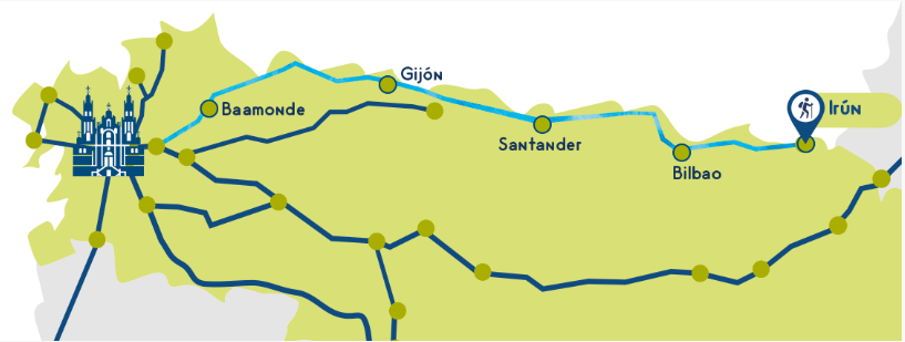 - 북쪽 길 (Camino del norte): 이 길은 말 그대로 스페인에 있는 북쪽을 쭉 걷는 길인데, 산 세바스티안 (San Sebastián), 빌바오 (Bilbao), 산탄데르 (Santander), 히욘 (Gijón) 등 아스투리아스와 바스크 지방의 중요한 도시는 다 지나오는 길이다. 또한, 스페인 북쪽에 위치한 칸타브리아해 (Cantabria) 의 해변을 걷기도 하기 때문에 해변길 (Camino de la Costa) 이라고도 잘 알려져 있다. 최초의 길처럼 역사가 많고, 프랑스 길만큼 오래된 길이다. 주로 유럽에 있던 왕들이 산티아고에 가기 위해 많이 걸었던 길인데, 레꽁끼스타 (la Reconquista, 스페인의 국토 회복 운동으로 기독교인들이 스페인 남부를 정복하고 있던 이슬람교인들을 몰아내기 위해 벌였던 운동이다) 와 프랑스 길의 유명세로 인기가 떨어졌다고 한다. 순례자의 길 중에 은의 길 다음으로 두번째로 긴 길로, 총 824 km이다.