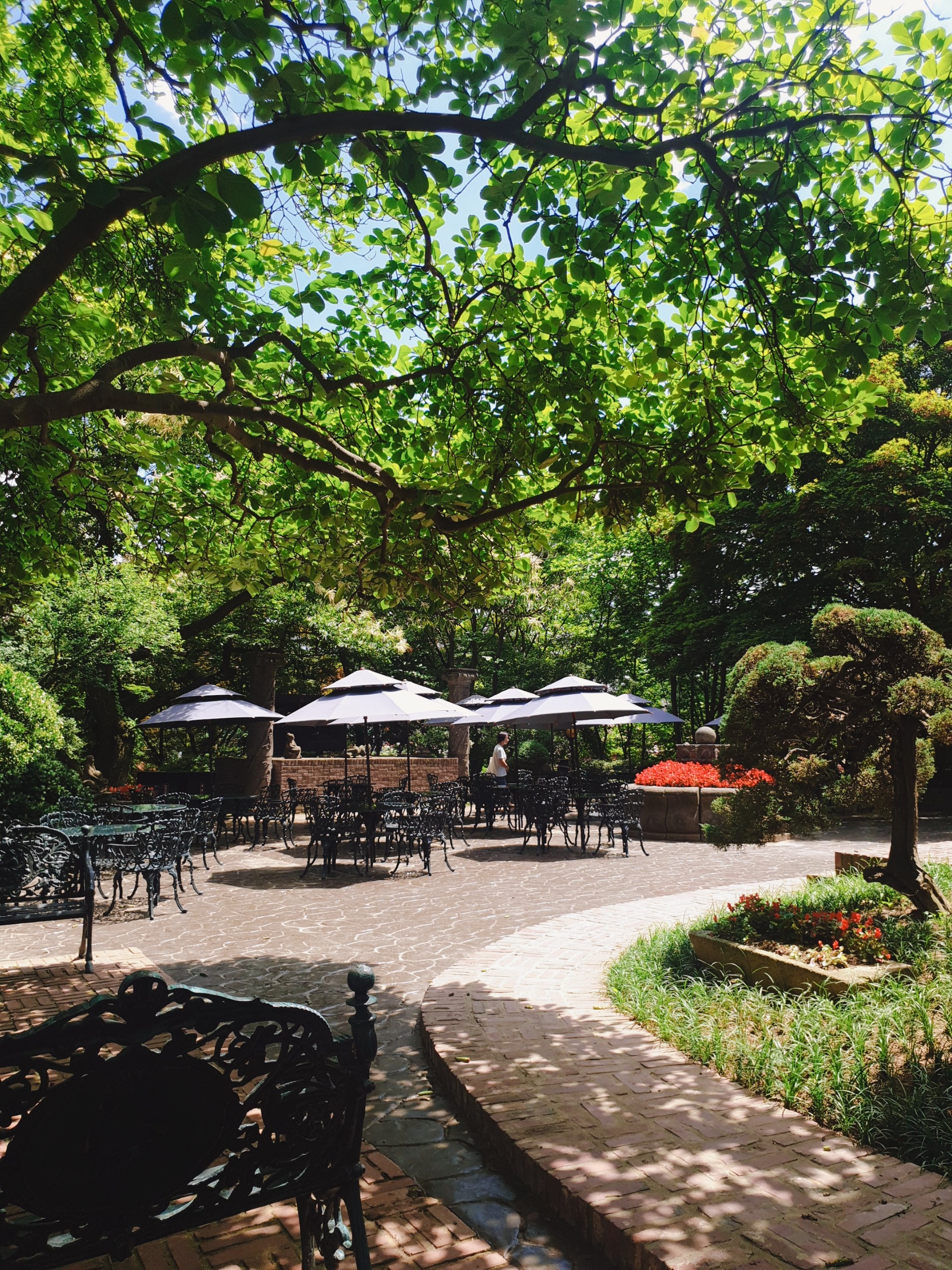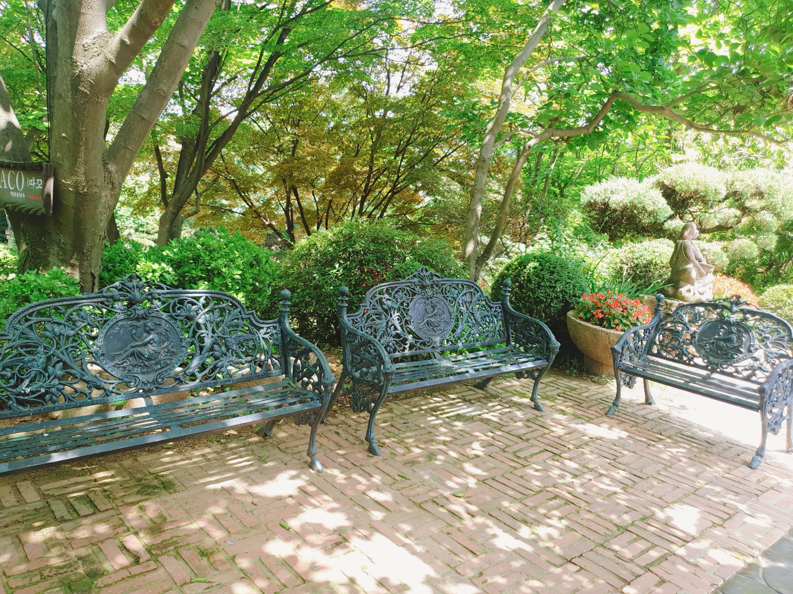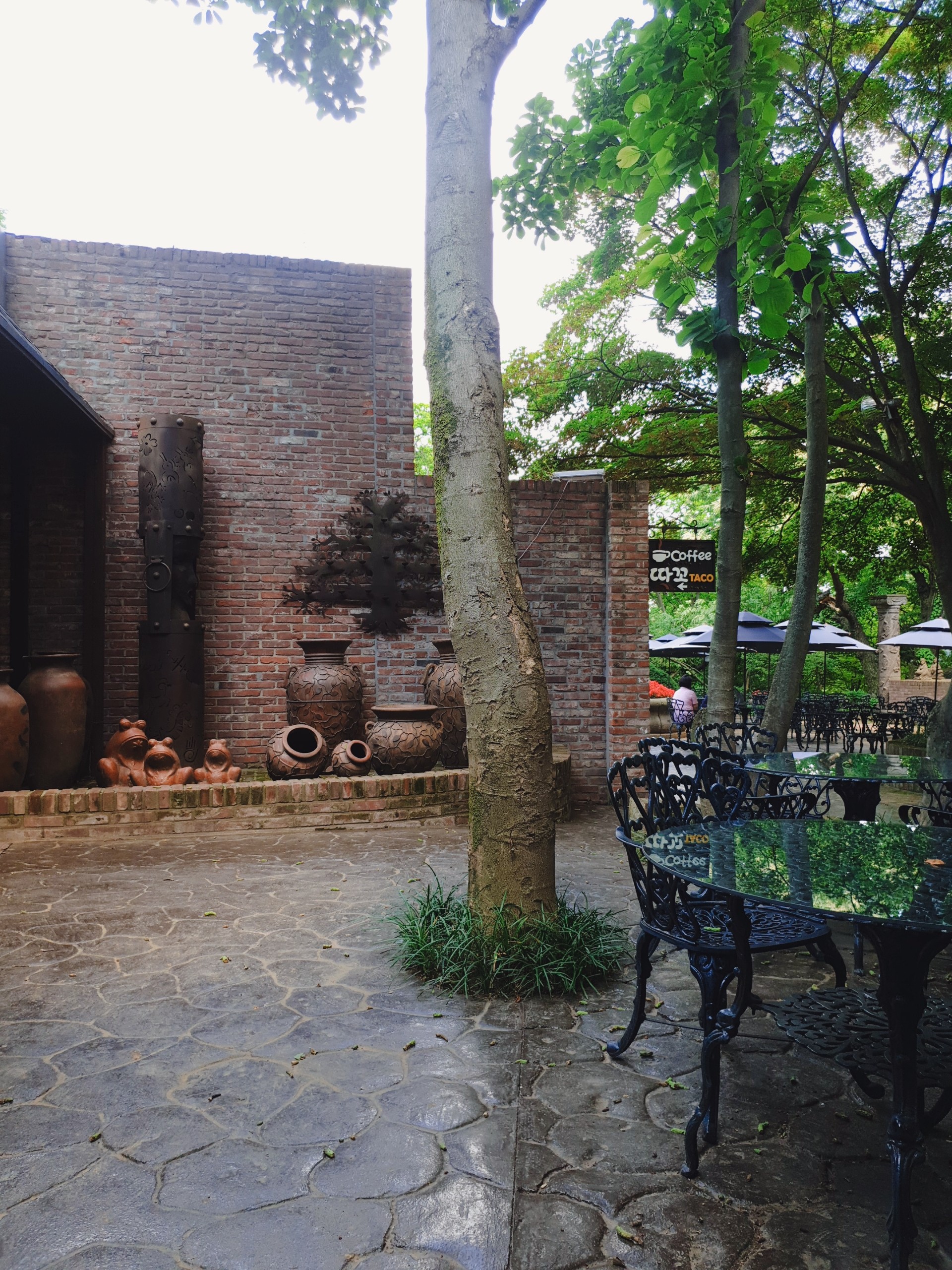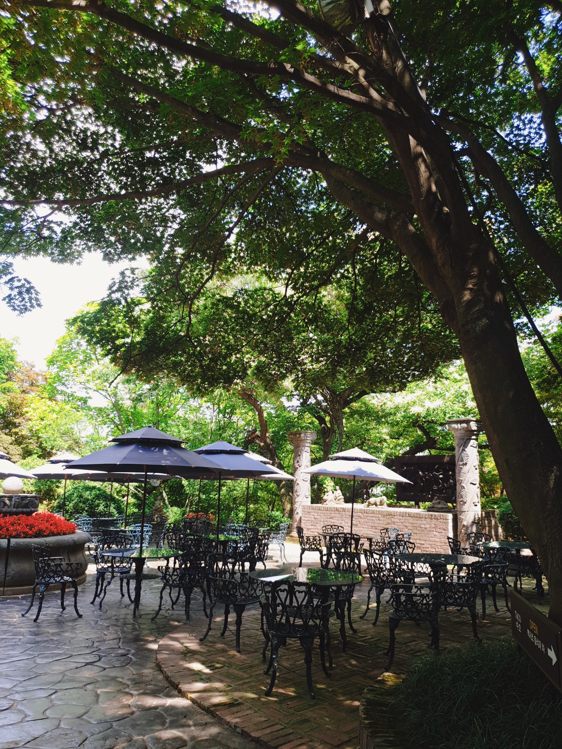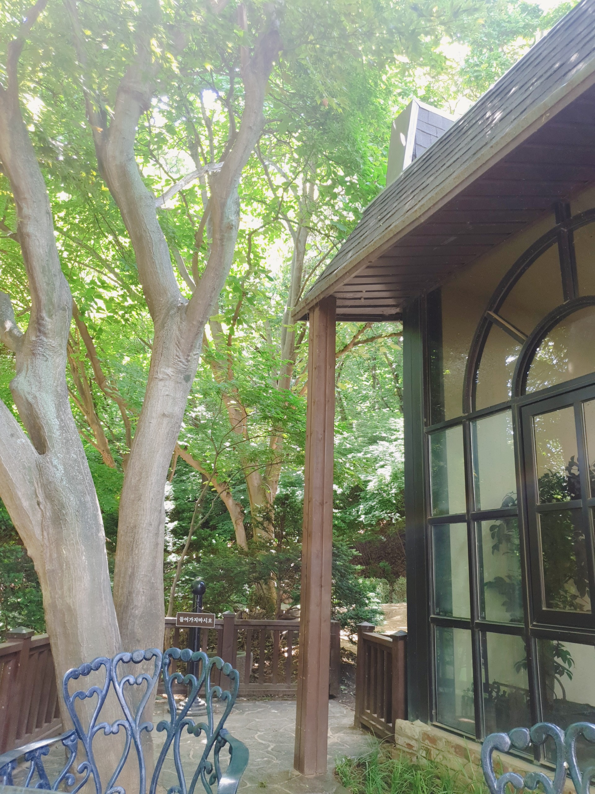 분위기 있는 철제의자에 파라솔이 있고, 나무가 우거져 시원해 보였다.