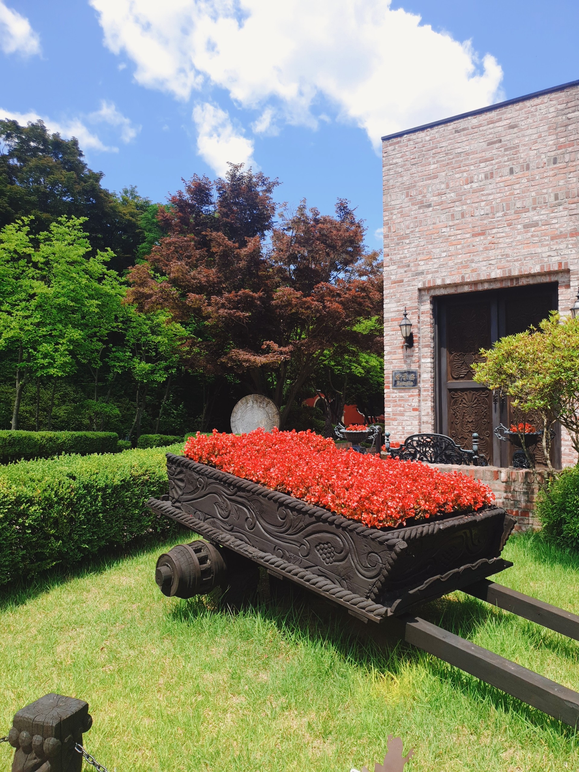 하늘이랑 나무랑 건물이랑 스테인글라스 창까지 너무 잘 어울린다. 옆에 수레에 있는 꽃도 사진만큼 빨갛다.