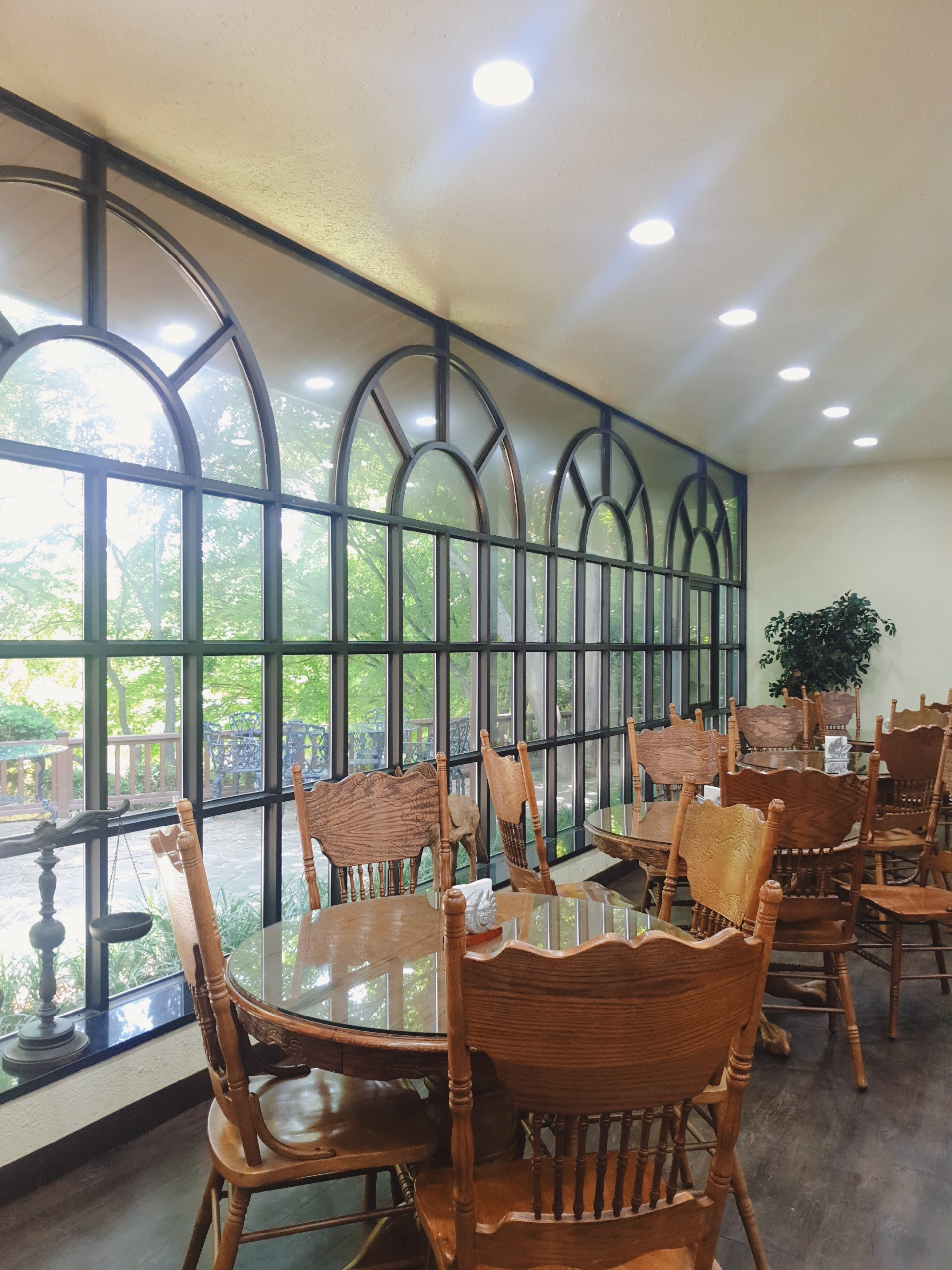아치형 창틀이 있는 카페 건물이 참 예쁘다.