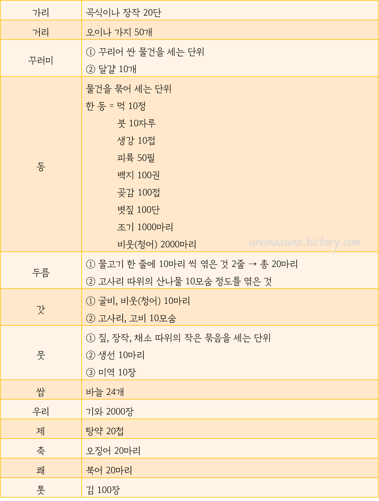 보통 국어 문제집을 보면 단위명사의 종류가 한 페이지 가득 표로 정리되어있는데