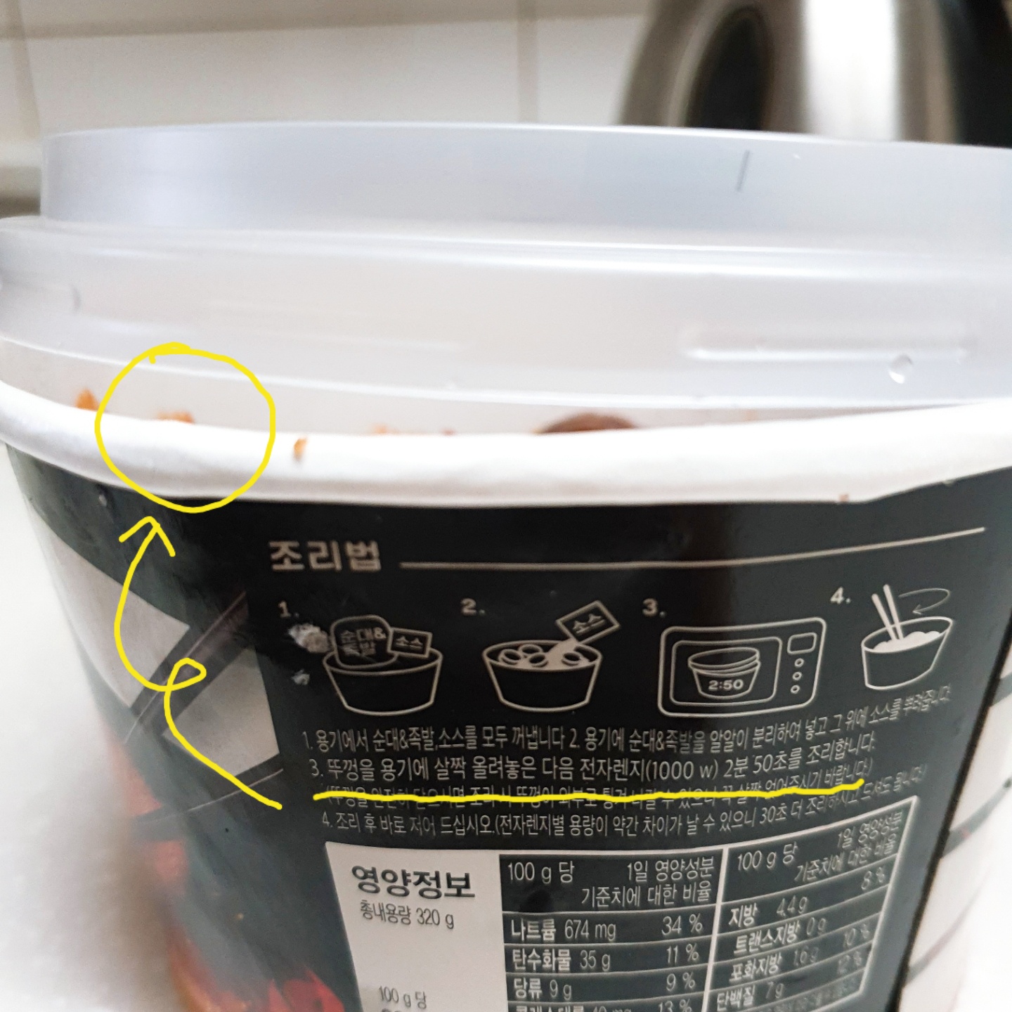 뚜껑을 꽉 덮으면 전자레인지 안에서 뚜껑이 튕겨나갈 수 있으니 꼭 살짝 덮어주세요!! 라고 써있다.