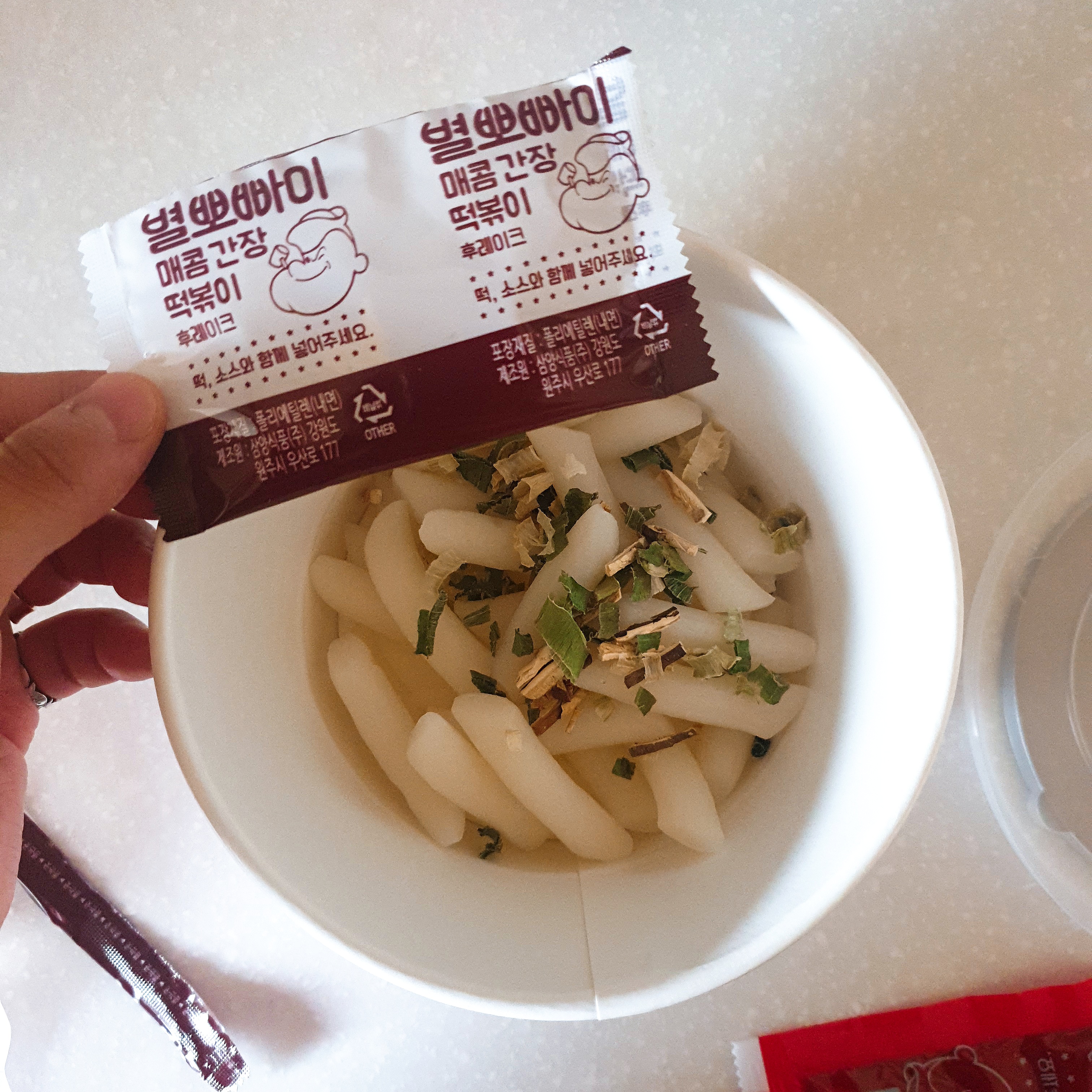떡, 후레이크 소스, 액상소스를 넣었다.