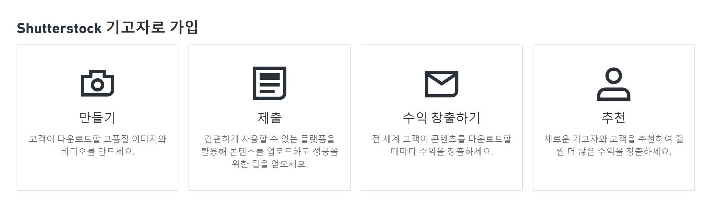 셔터스톡은 내가 찍은 사진을 올리고 내가 올린 사진들은 사람들이 구매하면 돈을 벌 수 있는 사이트이다. 구매하는 사람은 스트리밍 사이트처럼 월정액을 내고 사진을 구입하고, 사진을 올린 기고자는 사람들이 자신을 사진을 구입할 때마다 조금씩 돈이 입금된다.