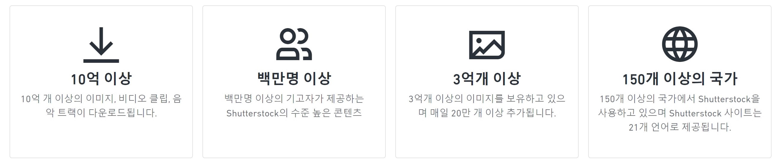 셔터스톡은 10억 개 이상 다운로드하고 있고, 백만 명 이상의 기고자가 있고, 3억 개 이상의 이미지를 보우하고 있으며, 150개 이상이 국가에서 사용하고 있다.