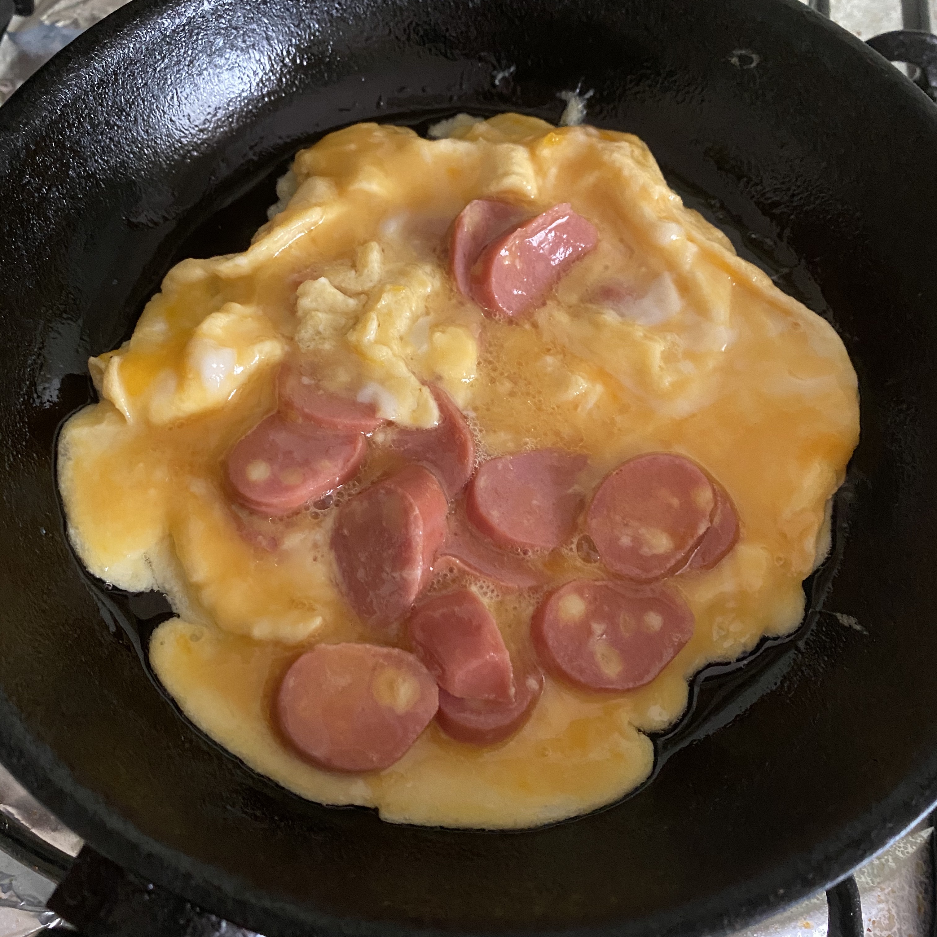 나는 그냥 베이컨 따로 굽고 이런거 구찮아서 계란 휙휙해서 소세지랑 같이 넣어서 약불에 구워줬다. 다 익을 쯤에는 치즈도 뿌려줬다.