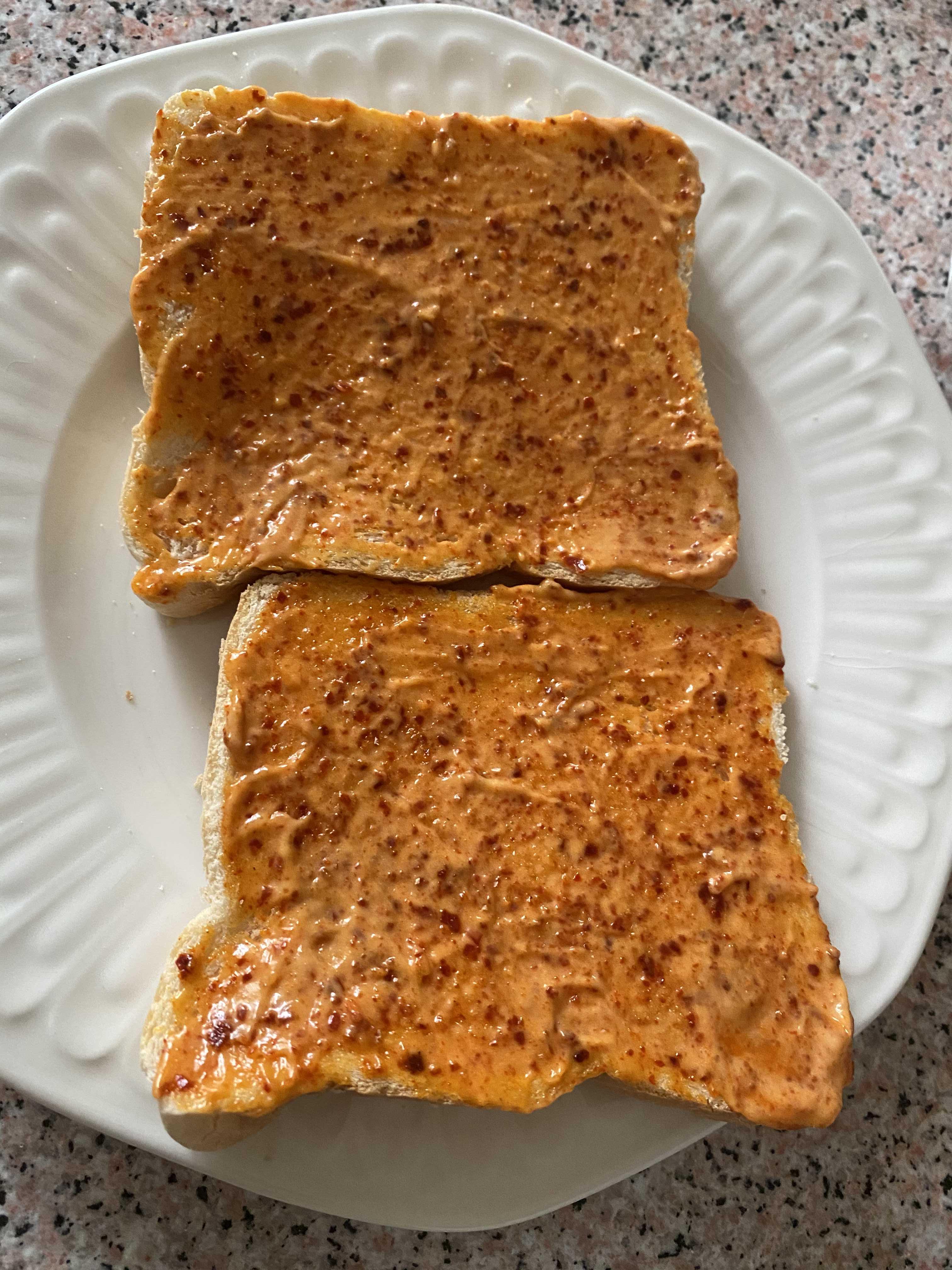 후라이팬에 빵을 한쪽 면만 굽고 이런거 구차나서 그냥 토스트기에 넣고 4분 정도 구운후 단면에 각각 소스를 발라주었다.