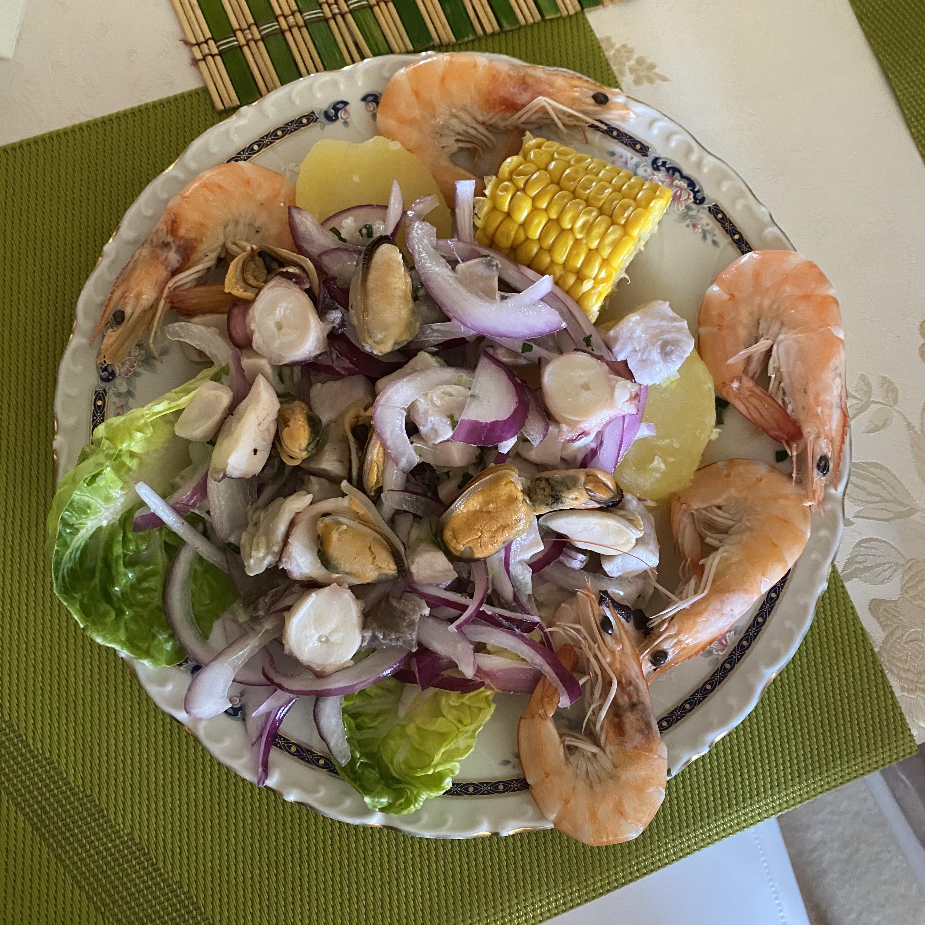 오늘 점심으로는 페루의 대표음식 세비체이다!! 남자친구네 가족들이 페루에서 왔기 때문에 평소에도 페루 음식을 많이 먹는데, 남자친구네 아버지께서 특별히 세비체를 준비해주셨다. 세비체는 해물음식으로, 생선, 문어, 홍합, 새우 등의 재료가 들어가고, 생선을 라임을 넣어서 익힌다?라고 해야하나? 생선에 라임을 넣어놓으면 얘네가 색이 변하면서 익힌 것처럼 변한다. 첨 봤을 때는 정말 신기했다.