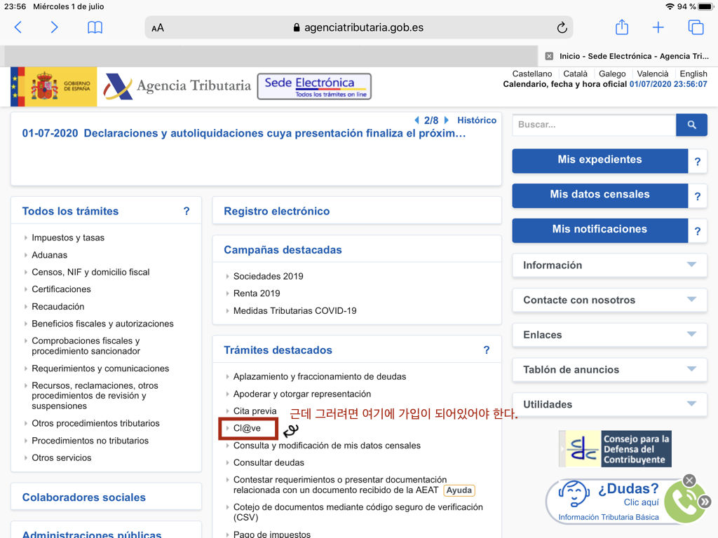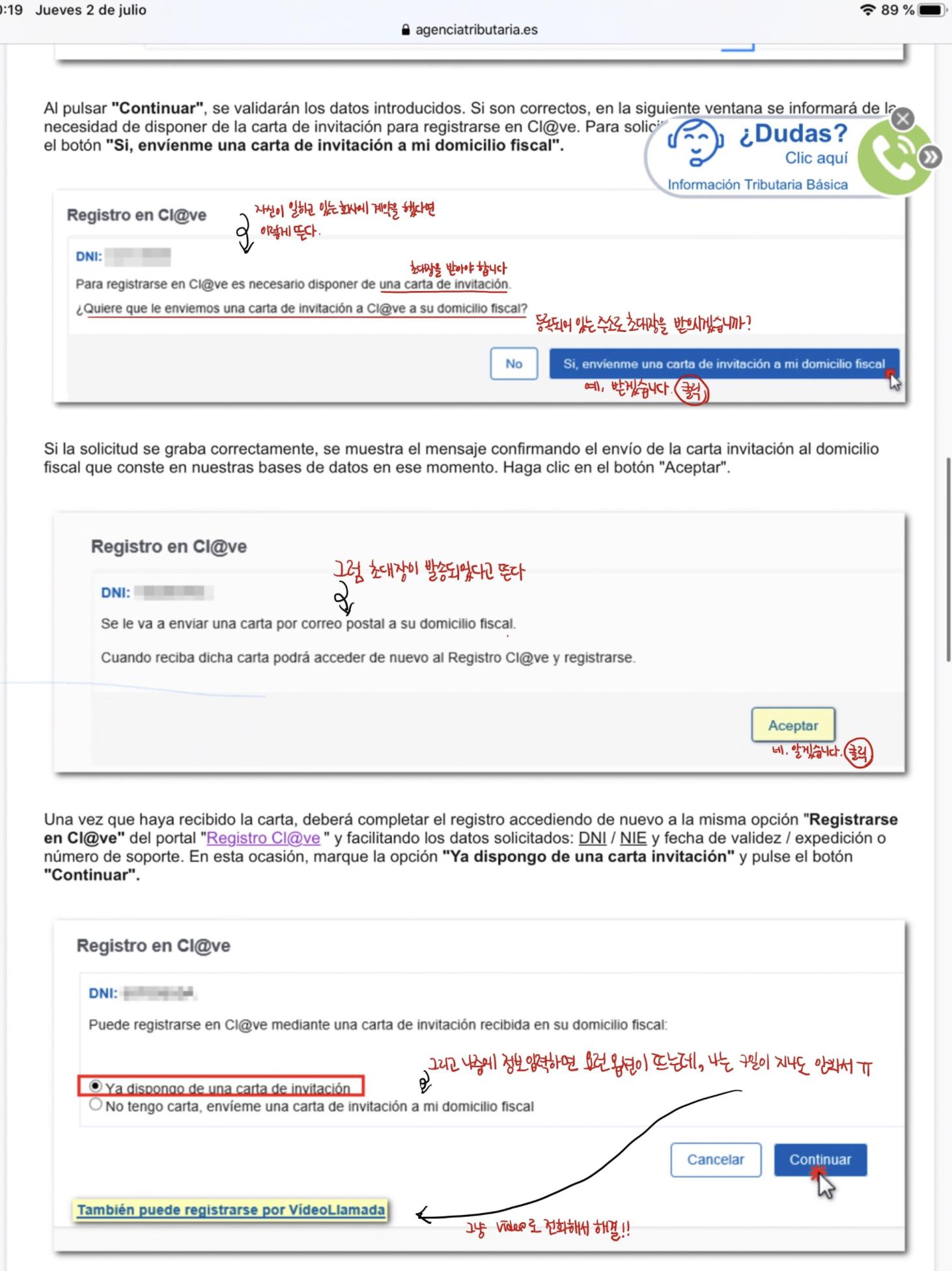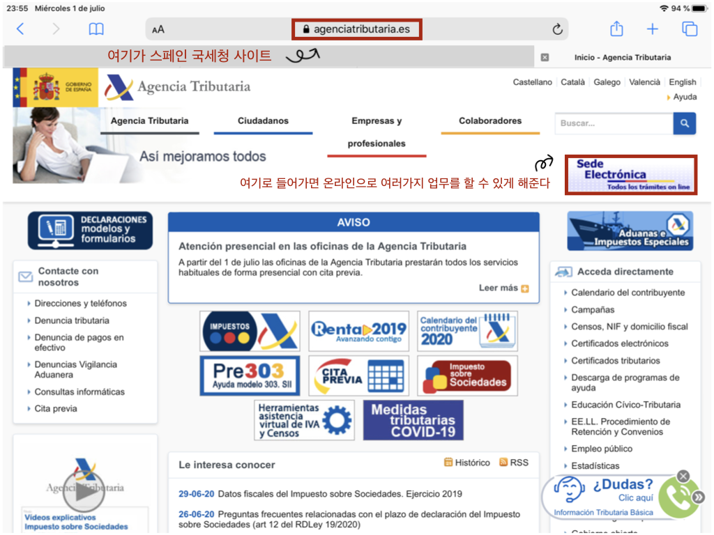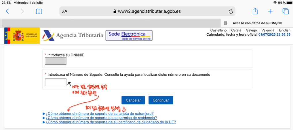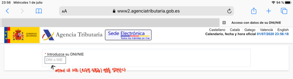 오후에는 스페인 국세청 홈페이지에 관련해서 계속 알아봤다. 사실 4월부터 학교에서 연구원으로 계약을 했는데, 아무래도 외국인이라서 자기네들 데이타 베이스에 내 정보가 없다보니, 원래보다 더 많은 세금을 떼어가고 있었다. 그래서 학교에서 처음에 계약할 때, 내가 세금을 정식으로 내기 시작하니, 국세청 홈페이지에서 서류를 떼서 제출하면 세금이 줄어들 것이라고 해서, 계속 시도를 해보고 있었다. 하지만 국세청 홈페이지에서는 아직 내 정보는 가입할 조건이 안된다고 나왔고, 사실 직접 가서 할 수 있었는데, 코로나 바이러스 때문에 락다운이 되어서 이도저도 할 수 없는 상황이었다. 그런데 드디어! 수락이 되었다. 하지만, 또 다른 장애물이 있었다. 국세청에서 이제 내 정보를 입력할 수 있지만, 그걸 승인받기 위해서는 또 우편으로 받는 초대장을 받아서 거기에 적힌 코드를 입력해야 정식으로 승인이 되는 거였다.