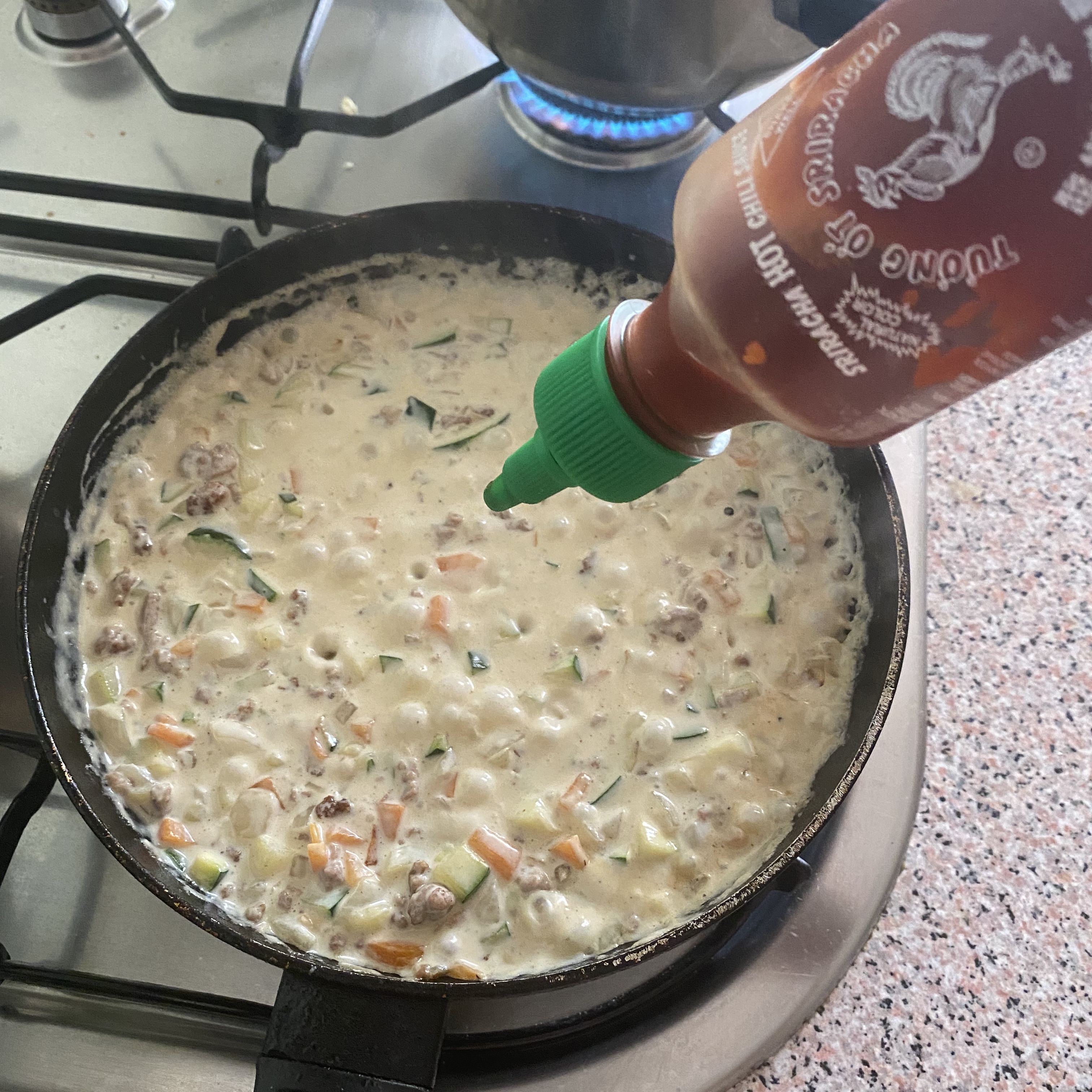 조금 맵게 먹고 싶어서 스리라차 소스를 넣었다. 스리라차 소스는 독일에 있는 친구가 추천해 준 소스인데, 진짜 너무 맛있다. 안그래도 고추장이 다 떨어져서ㅜㅜ 어떻게 해야 하나 했었는데, 대체하기는 힘들지만, 그래도 괜찮은 것 같다! 전에는 쫄면 소스 대신에도 뿌려 먹었는데, 완전 굿굿 약간의 매콤한 맛에 음~ 너무 맛있어.