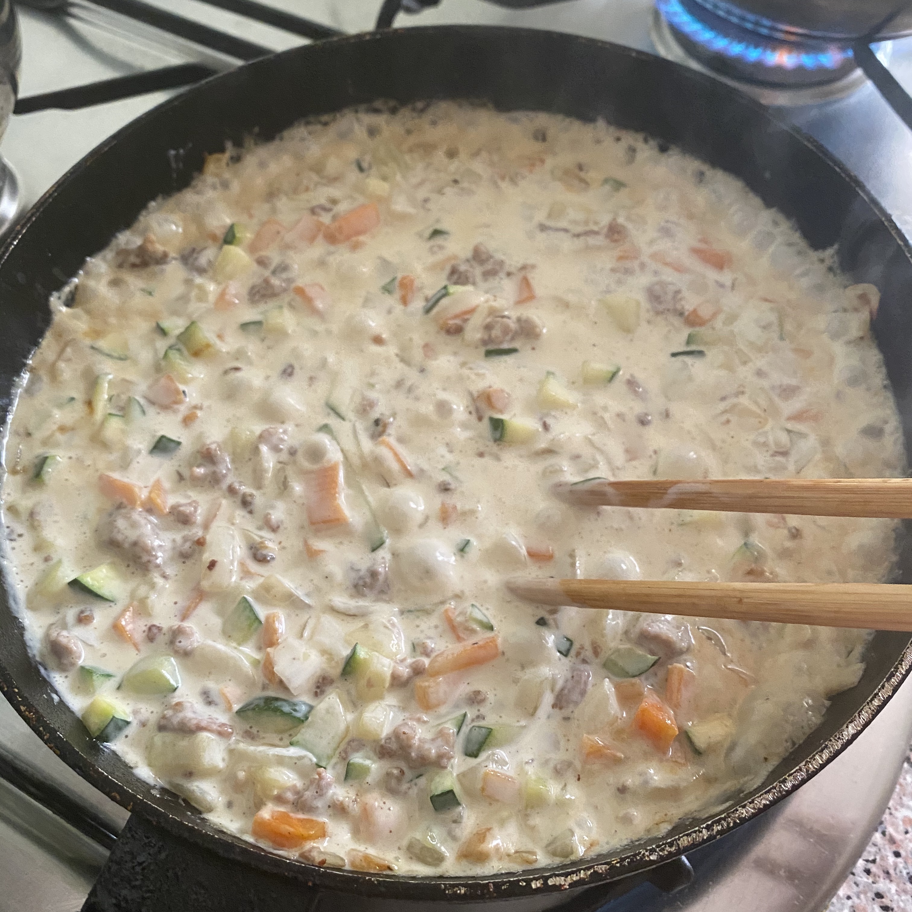 점심에는 볼로냐 파스타를 먹으려고 했다. 근데, 토마토 소스가 있는 줄 알았는데, 없네...? 급하게 크림 파스타로 바꿨다. 집에 있는 야채랑 냉동실에 남아 있던 간 고기를 볶다가 다 익었다 싶었을 때, 크림을 넣고 끓였다. (토마토 소스 있으면 토마토 소스를 넣어도 되겠죠?)