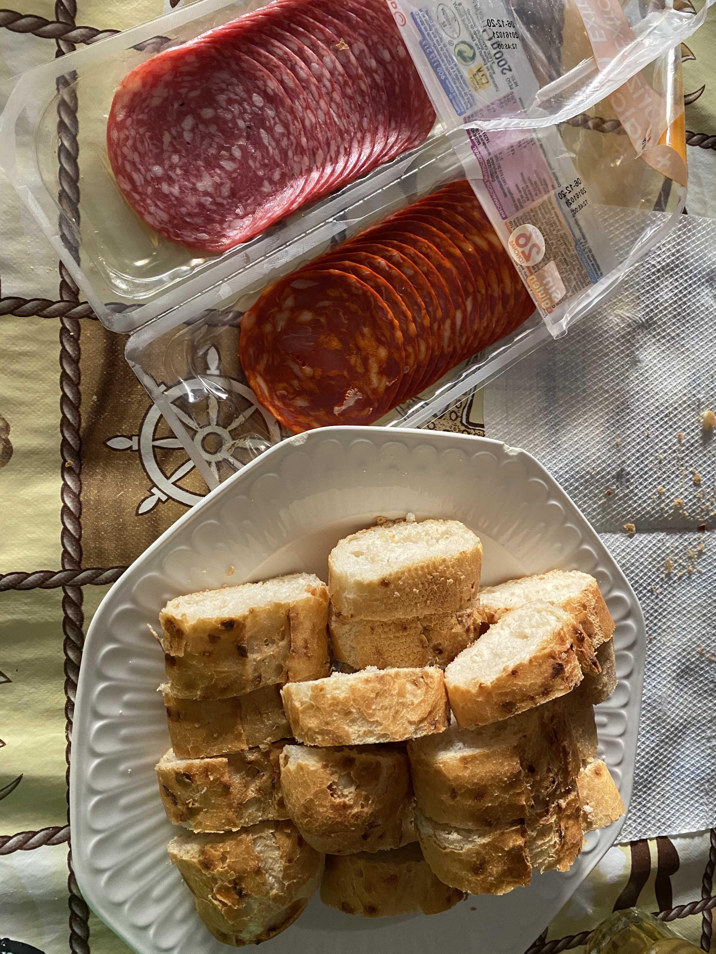 스페인의 대표 안주 chorizo 초리쏘와 salchichón 살치촌과 바게트 빵! 심지어 양파 바게트다. 냄새도 너무 좋고, 맛있다. 초리쏘와 살치촌은 스페인 햄인데, 얘네를 바게트에 올려서 같이 안주로 먹는다. 이걸 스페인에서는 tapa 따빠라고 부른다. 음료 시키면 함께 나오는! 하지만, 우리는 집에서 먹으니깐 좀 더 풍부하게 헤헤셋