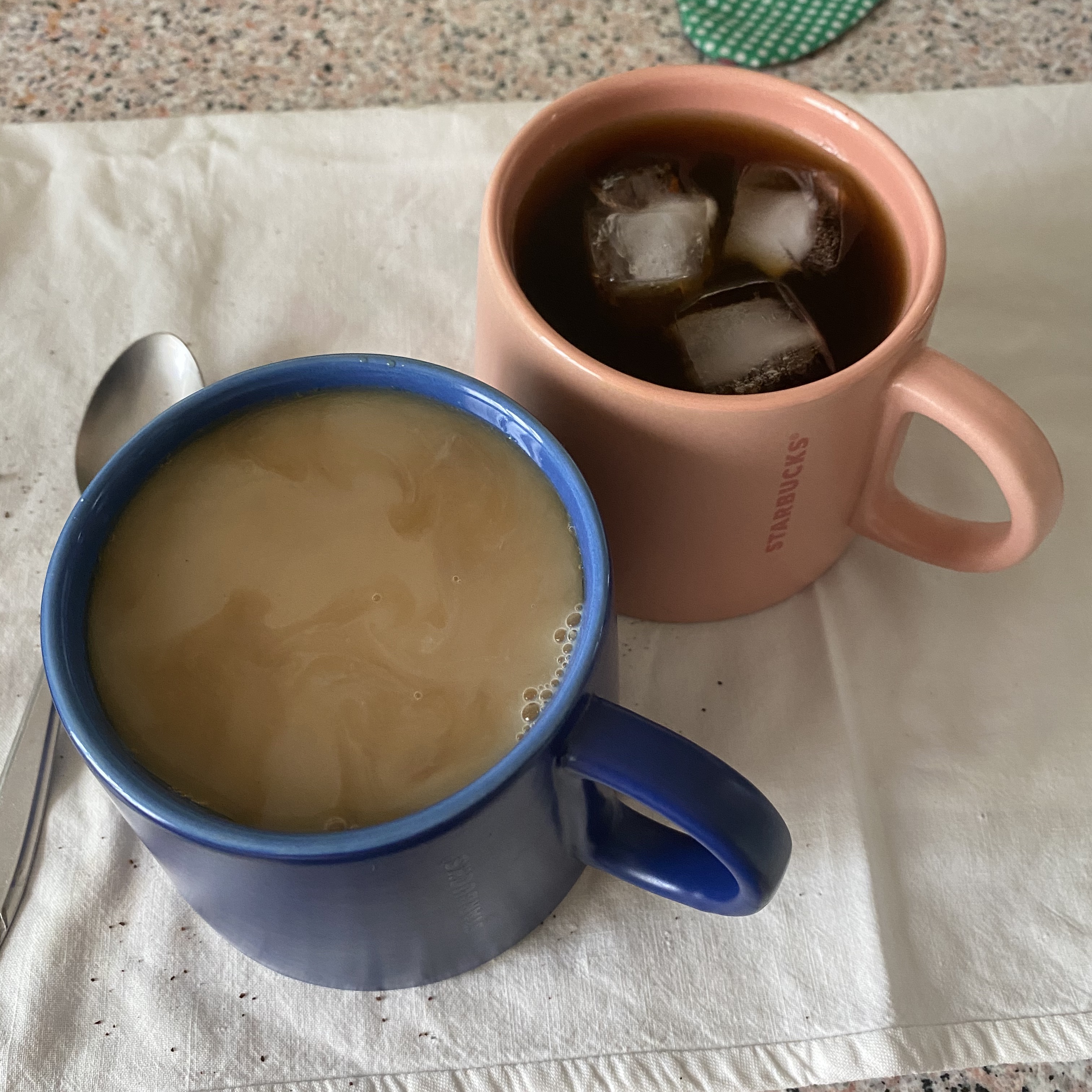 기다리는 동안 준비했어야 했는데, 까먹어서 오분 후에 컵을 준비했고 ㅎㅎ 나는 아이스 아메리카노, 남자친구는 요즘 커피 잘 안마시는데, 맛 보라고, 라떼로 준비할거다. 스페인에서는 café con leche (카페 꼰 레체)라고 한다.
