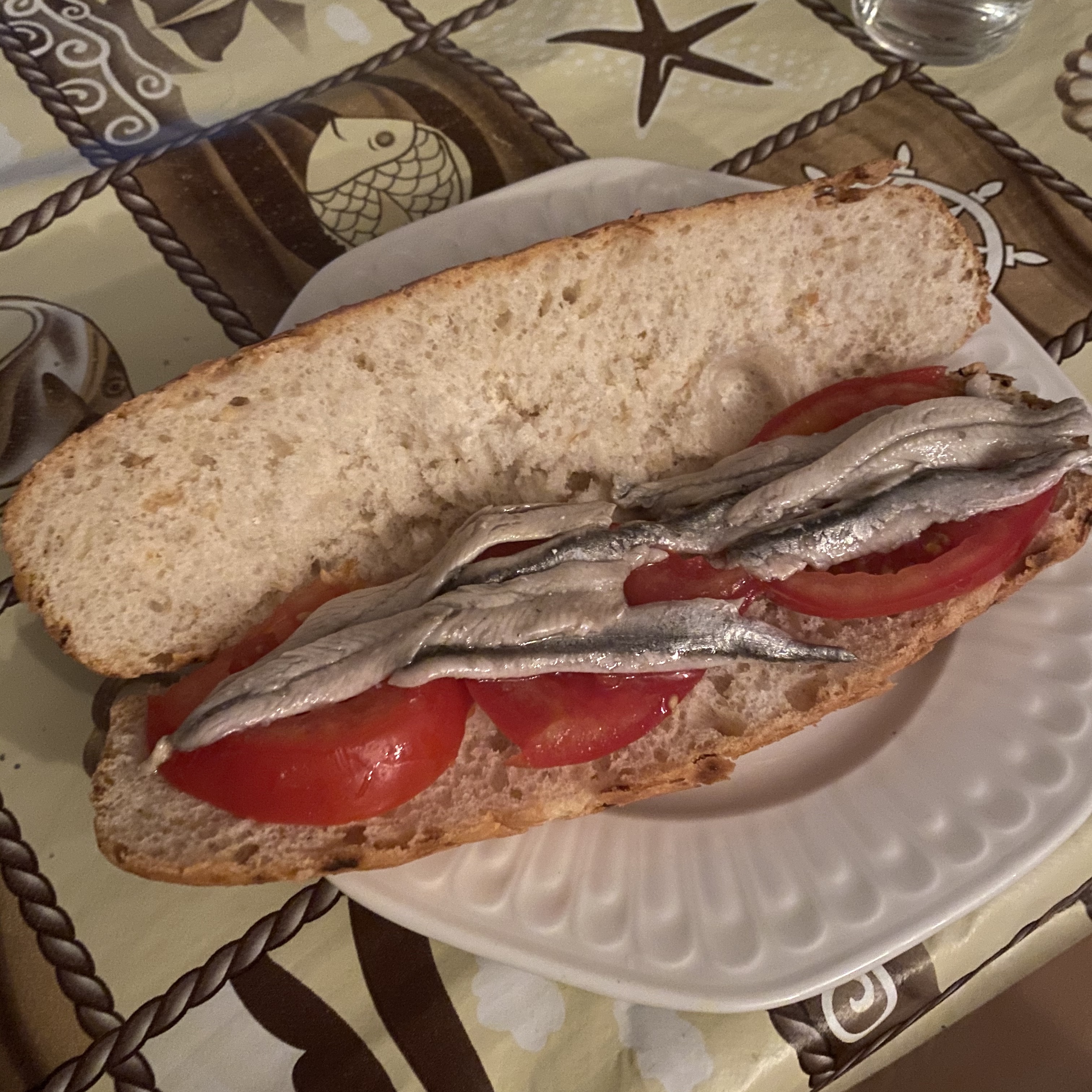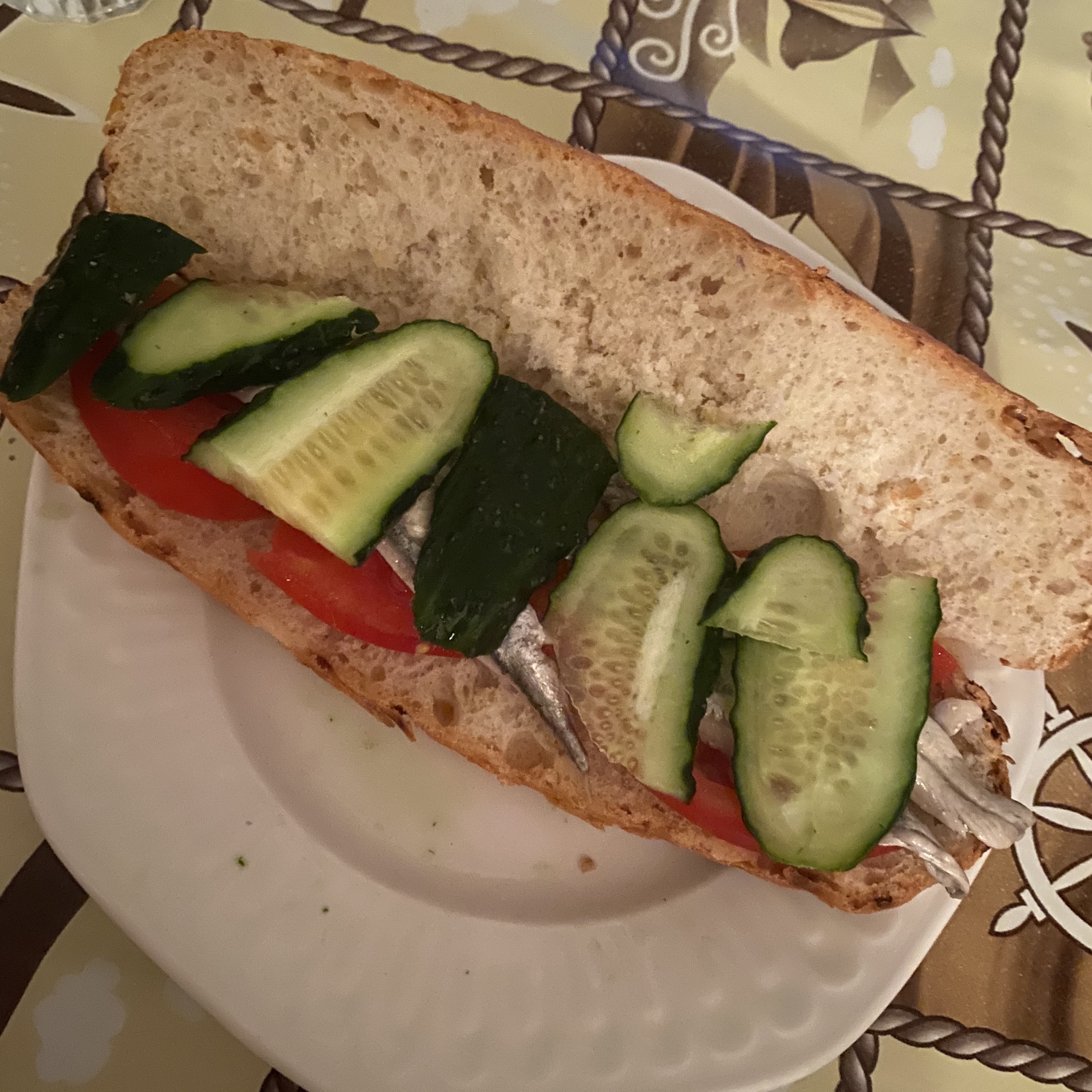저녁은 간단하게? 어제 남은 양파 바게트에 올리브와 식초에 절인 멸치 boquerones (보께로네스)에 오이와 토마토를 잘라서 넣어서 샌드위치를 해 먹었다. 음 맛있다. 한국 사람들에게 막 유명하진 않고, 조금 맛이 강할 수도 있지만, 빵이랑 먹으면 맛있다. 나는 추천!