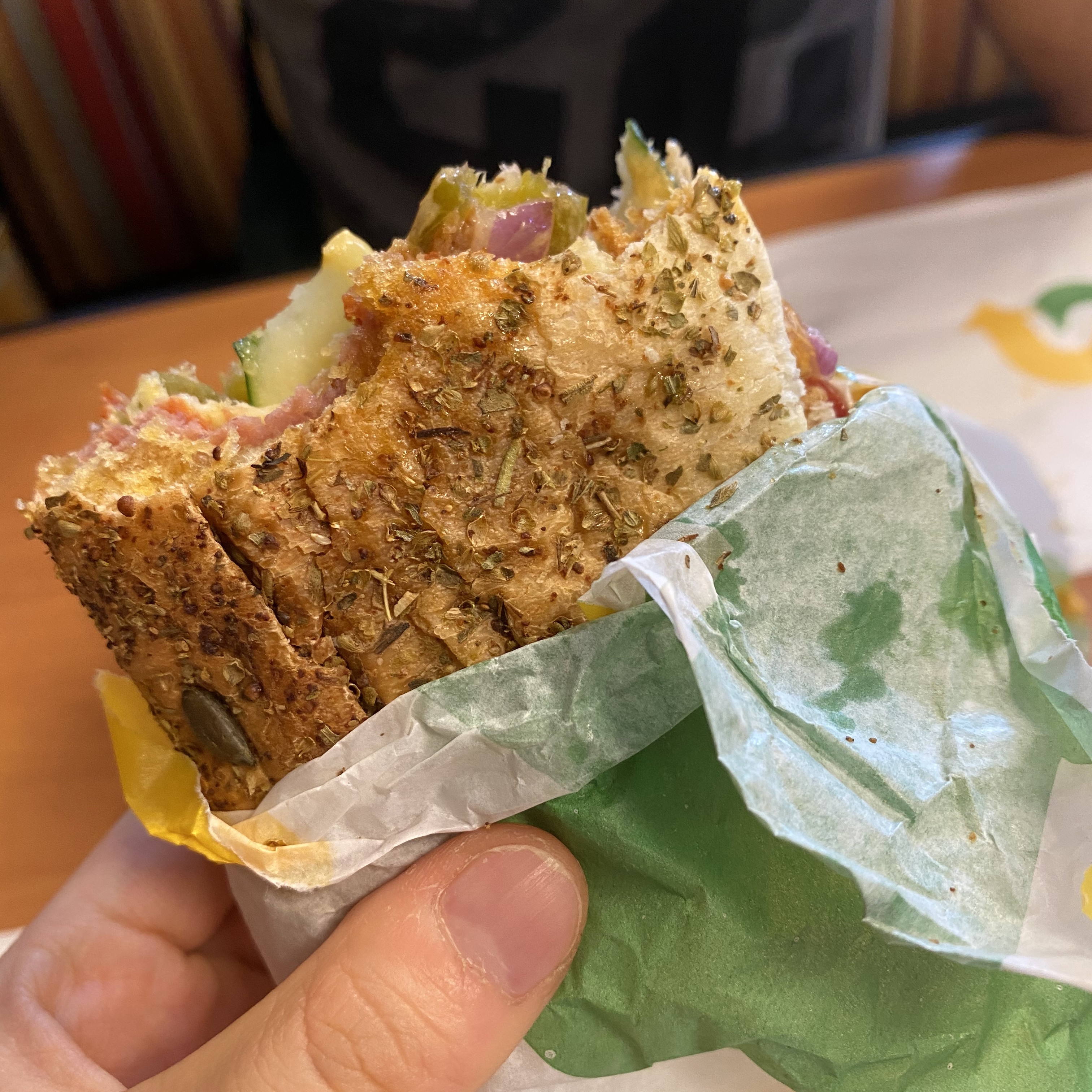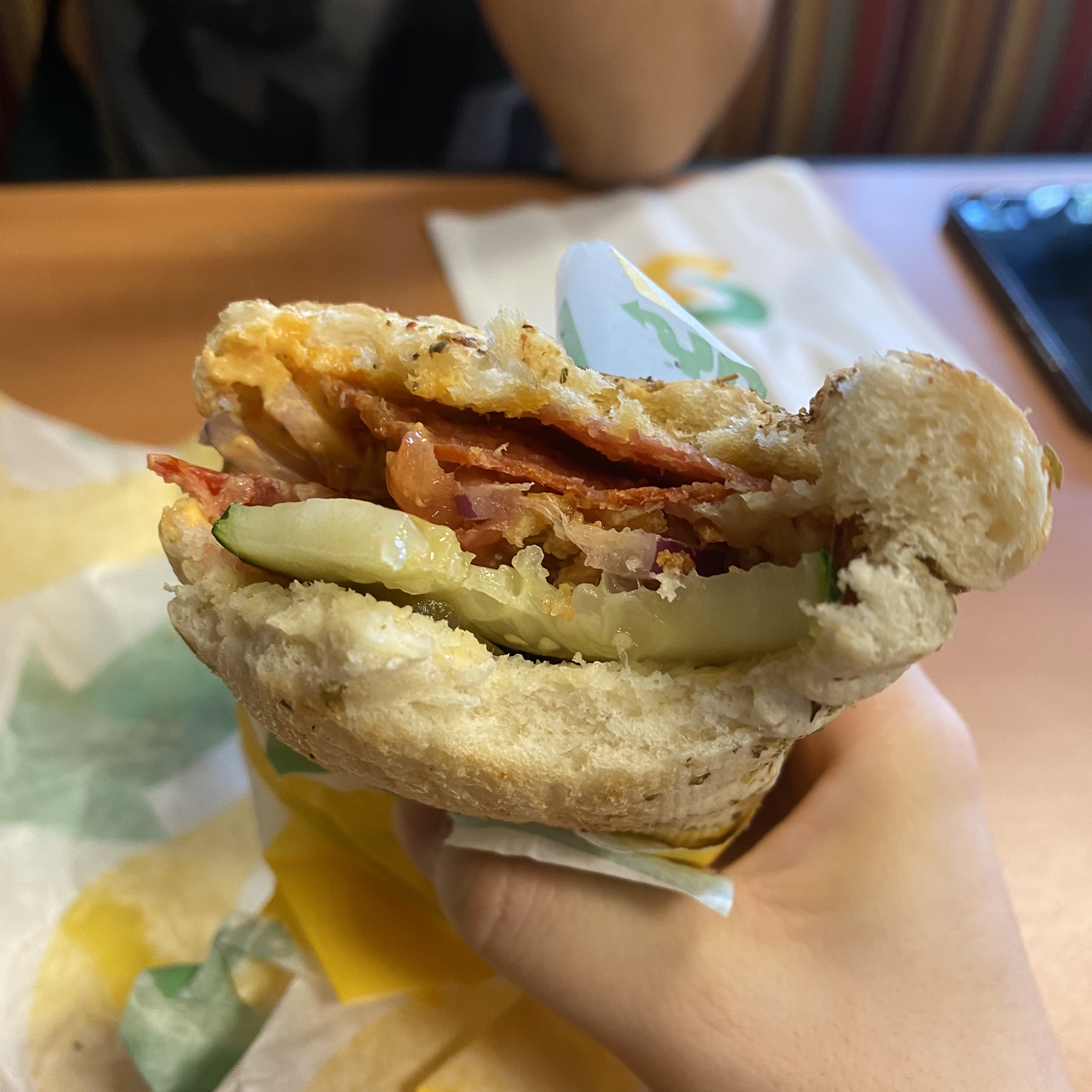 이미 메뉴를 시켰으니, 기본 고기(?)로 페퍼로니와 살라미를 넣어줬고, 토마토, 오이, 양파, 할라피뇨, 스윗 어니언 소스, 매운 소스 (치뽀뜰레), 튀긴 양파(?) (과자처럼 튀겨져 있는 걸 뭐라고 하는지 모르겠다..)를 추가해서 넣었다. 메뉴가 기본적으로 엄청 맛있었고, 빵이 정말 맛있었다. 소스도 큰 몫 했다. 사실 페퍼로니를 그렇게 좋아하는 편은 아닌데, 이렇게 샌드위치로 먹으니 정말 맛있었다. 먹으면서 아우 맛있다, 어유 너무 맛있는데, 하면서 먹었다 ㅎㅎ