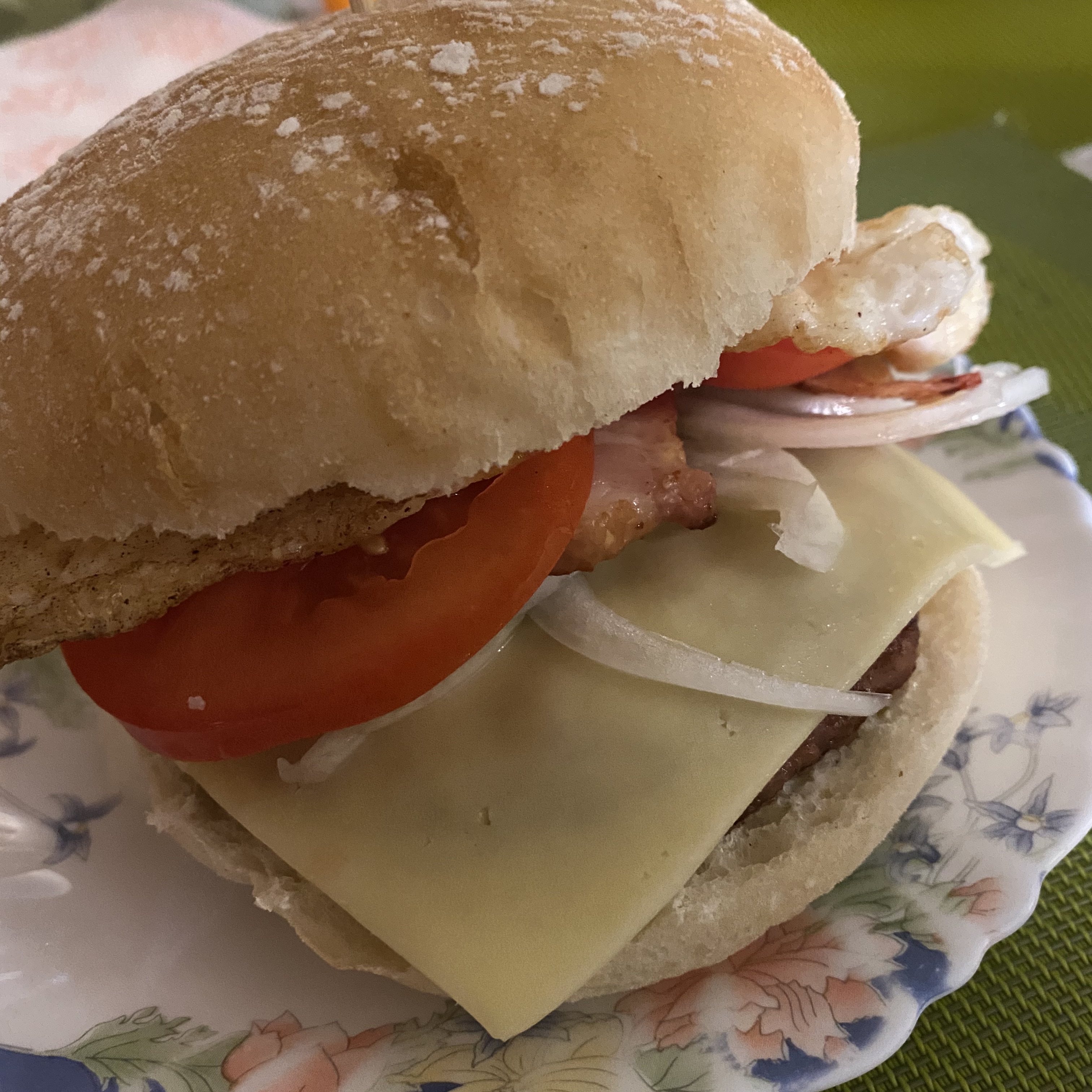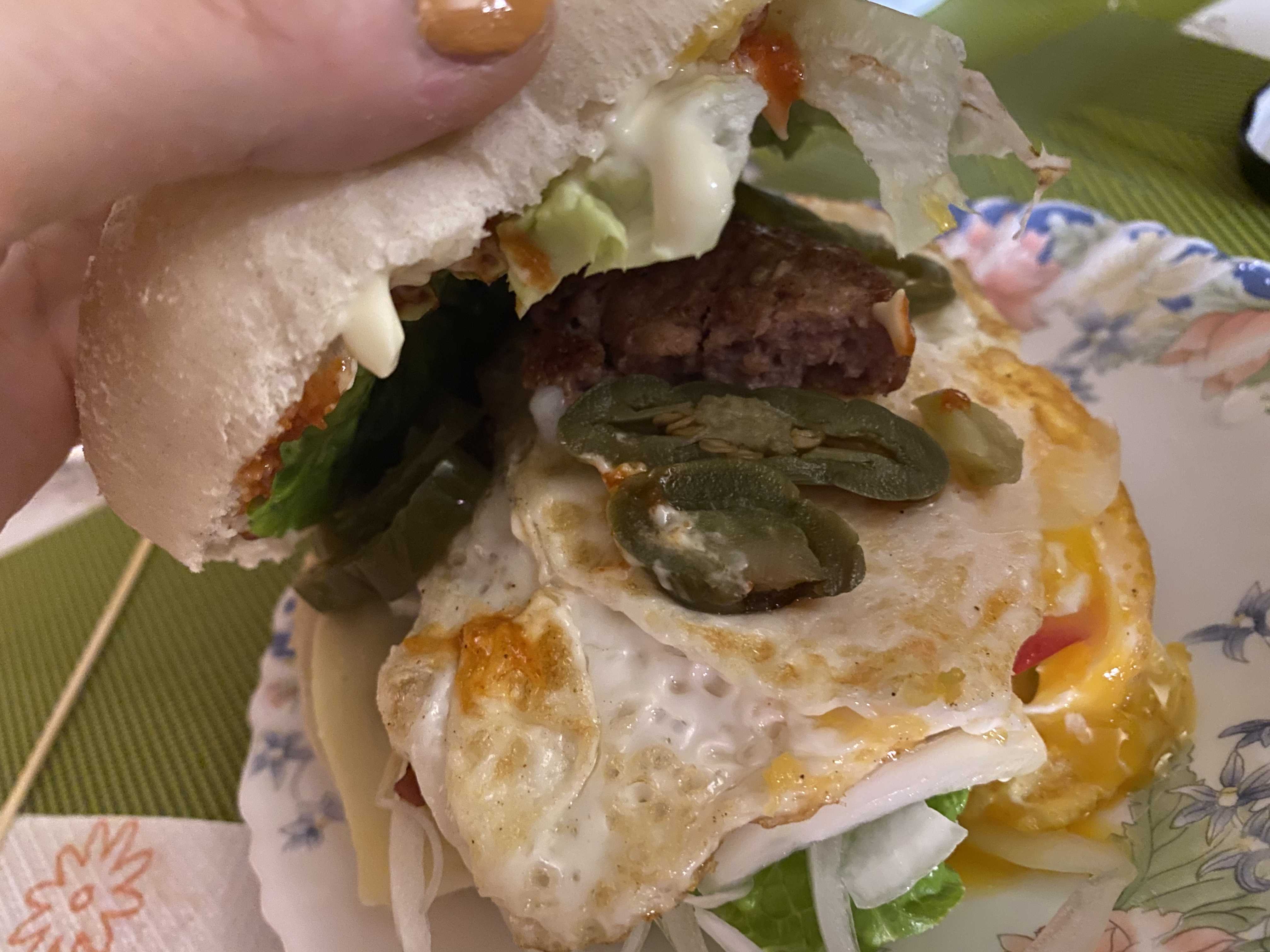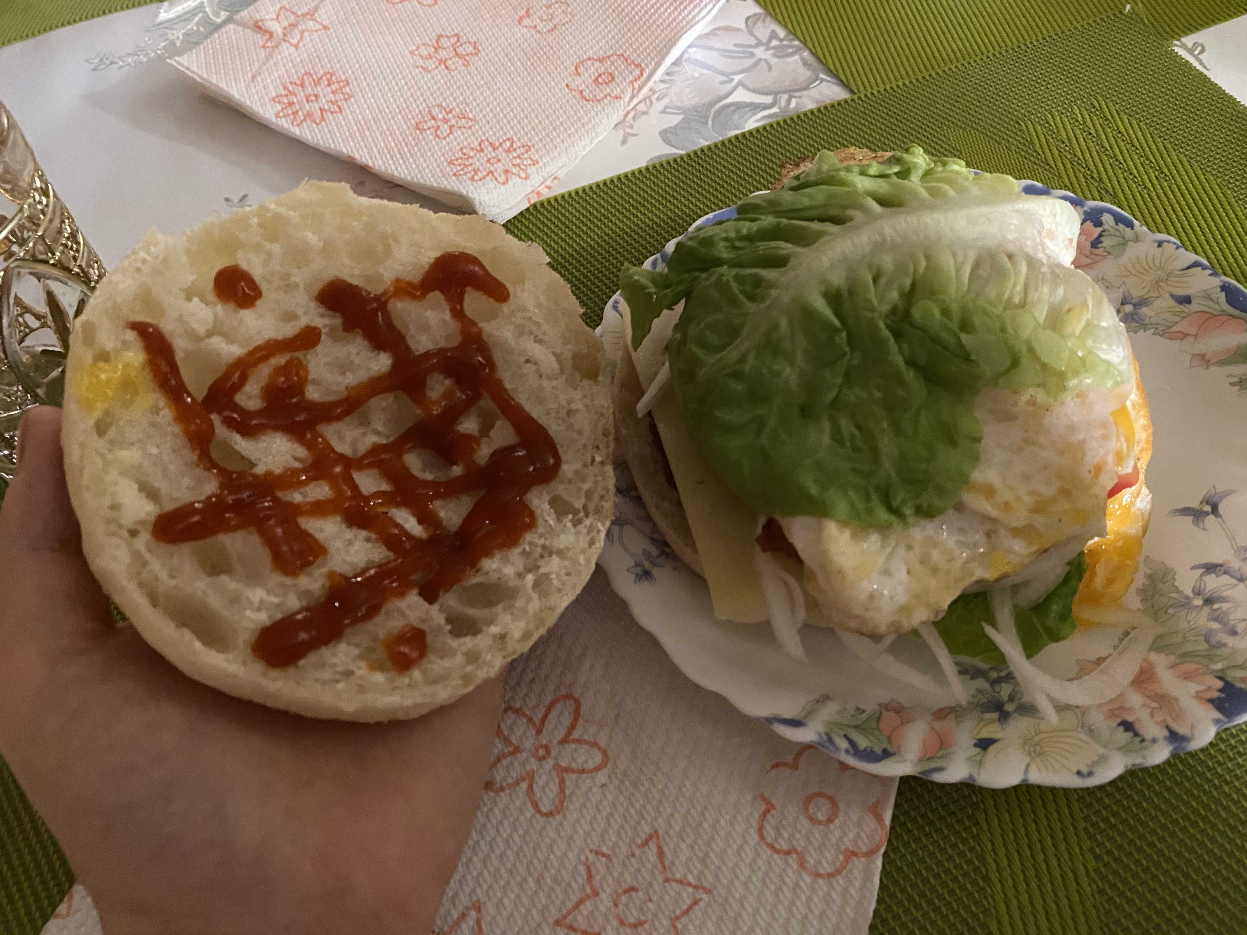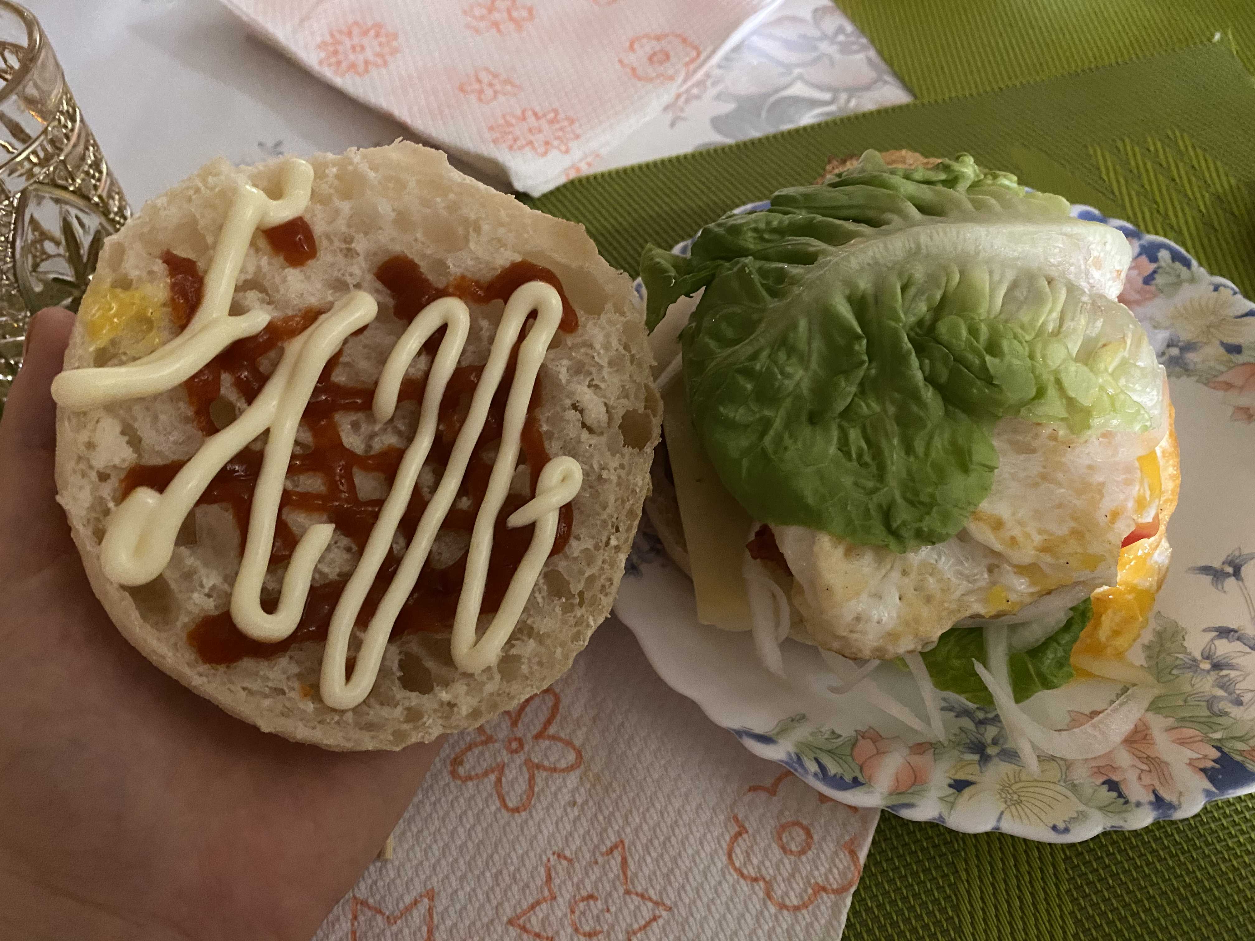 저녁에는 햄버거를 먹었다. 시켜먹은 것 아니고, 남자친구네 아버지가 해주셨다. 완전 홈메이드이다. 야채 자르고, 햄버거 패티 굽고, 계란도 얹고, 베이컨도 얹어서! 소스는 마요네즈와 스리라차를 섞었다.