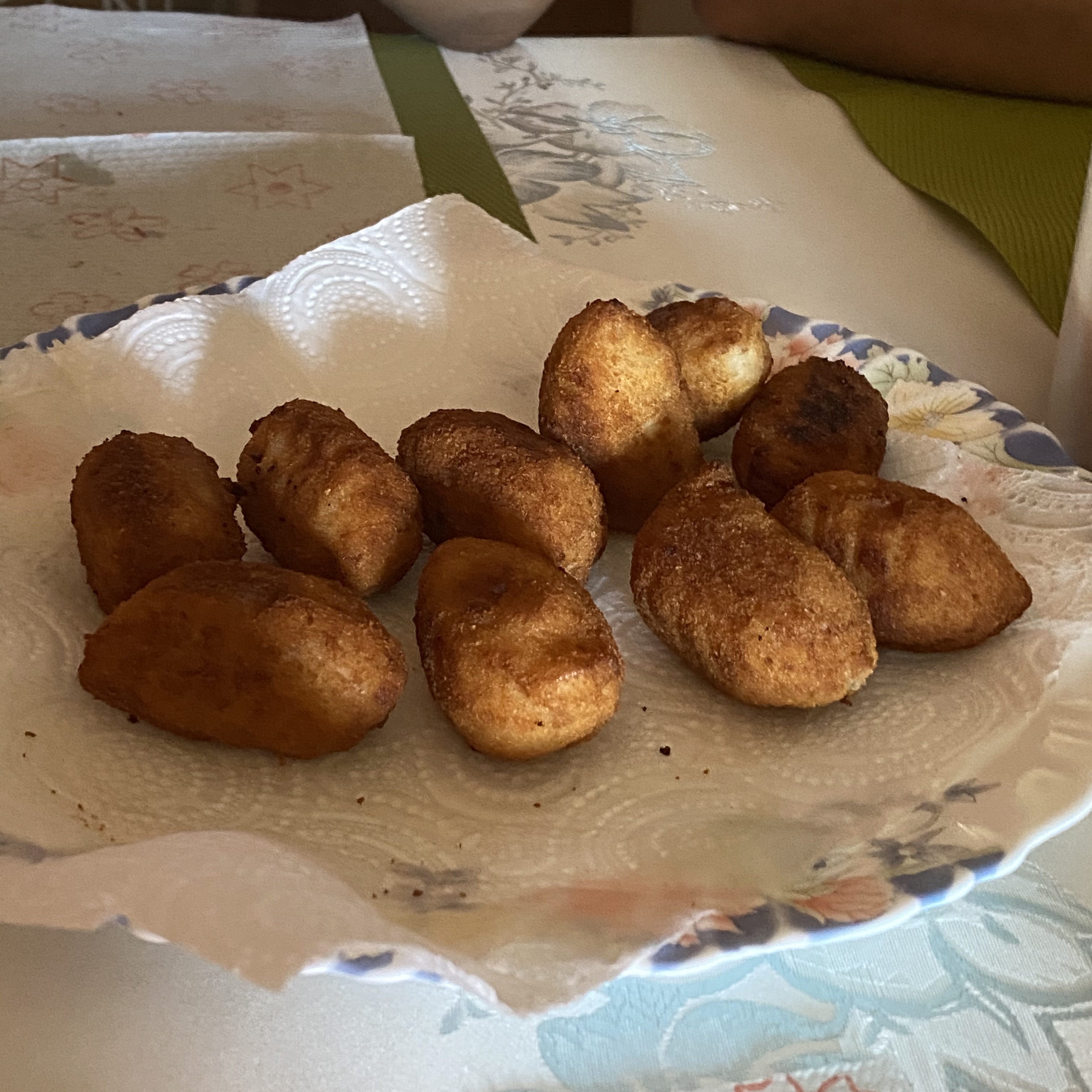 이게 크로께따라고 스페인의 크로켓이다. 안에는 아마 버터와 밀가루로 베샤멜 소스를 만들고, 안에 하몽도 넣고 (치즈를 넣기도 한다. 기본으로는 하몽이 들어가는 것으로 알고 있다.) 동그랗게 만들어서 튀긴다. 사진에 있는 크로께따는 직접 만든건 아니고! 슈퍼에서 산 냉동식품이다 😛😛