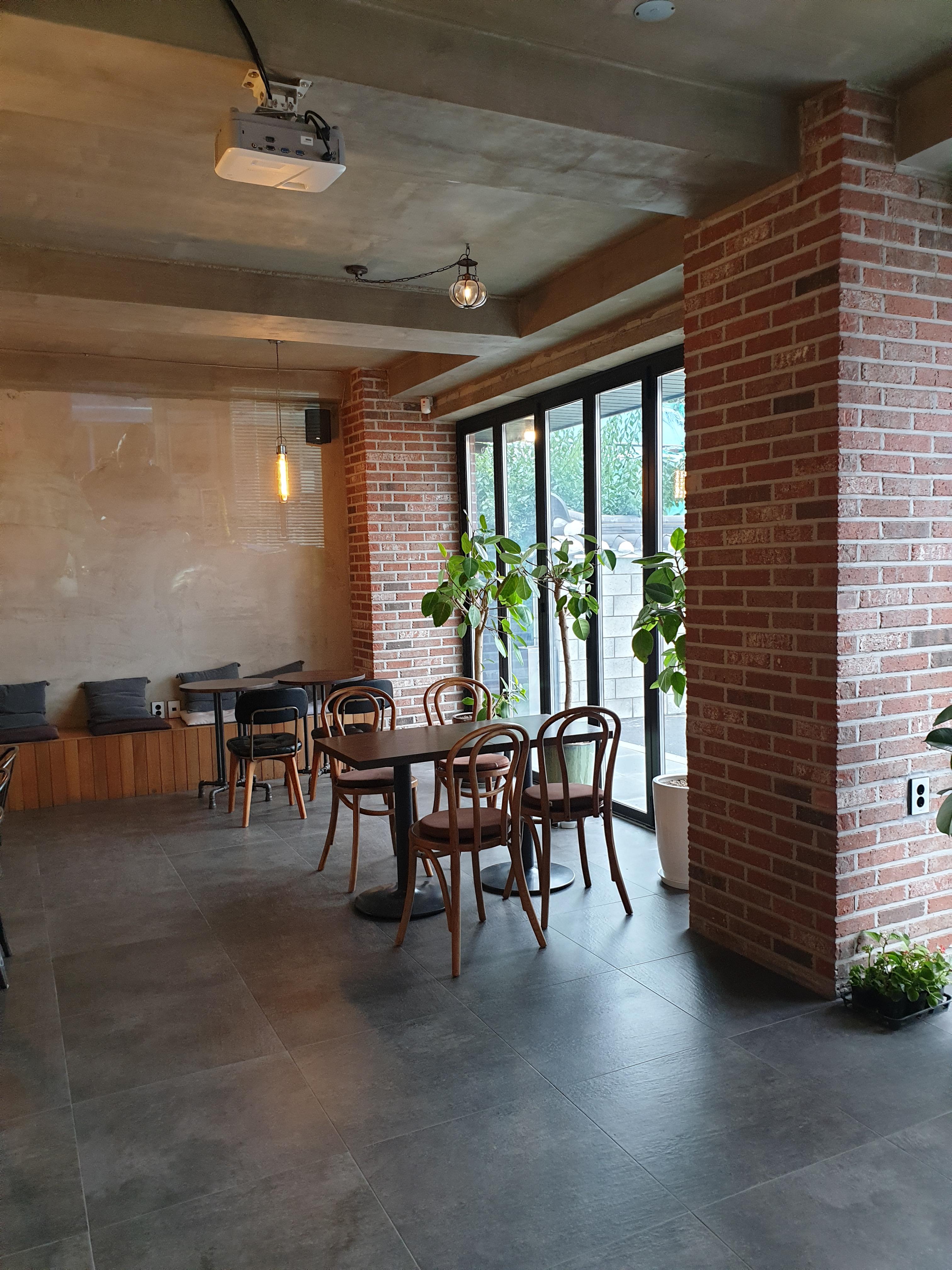 그리고 한쪽 벽면에 붉은색 벽돌벽이 있고, 카페 미쁘담이라고 하얀 글씨로 적혀있어요. 저는 빨간색 벽돌 인테리어를 참 좋아하는데 하얀색으로 적힌 글씨도 예쁘고 주변의 초록색 화분들도 참 잘어울려요. 저도 나중에 저렇게 인테리어를 해보고 싶어요.