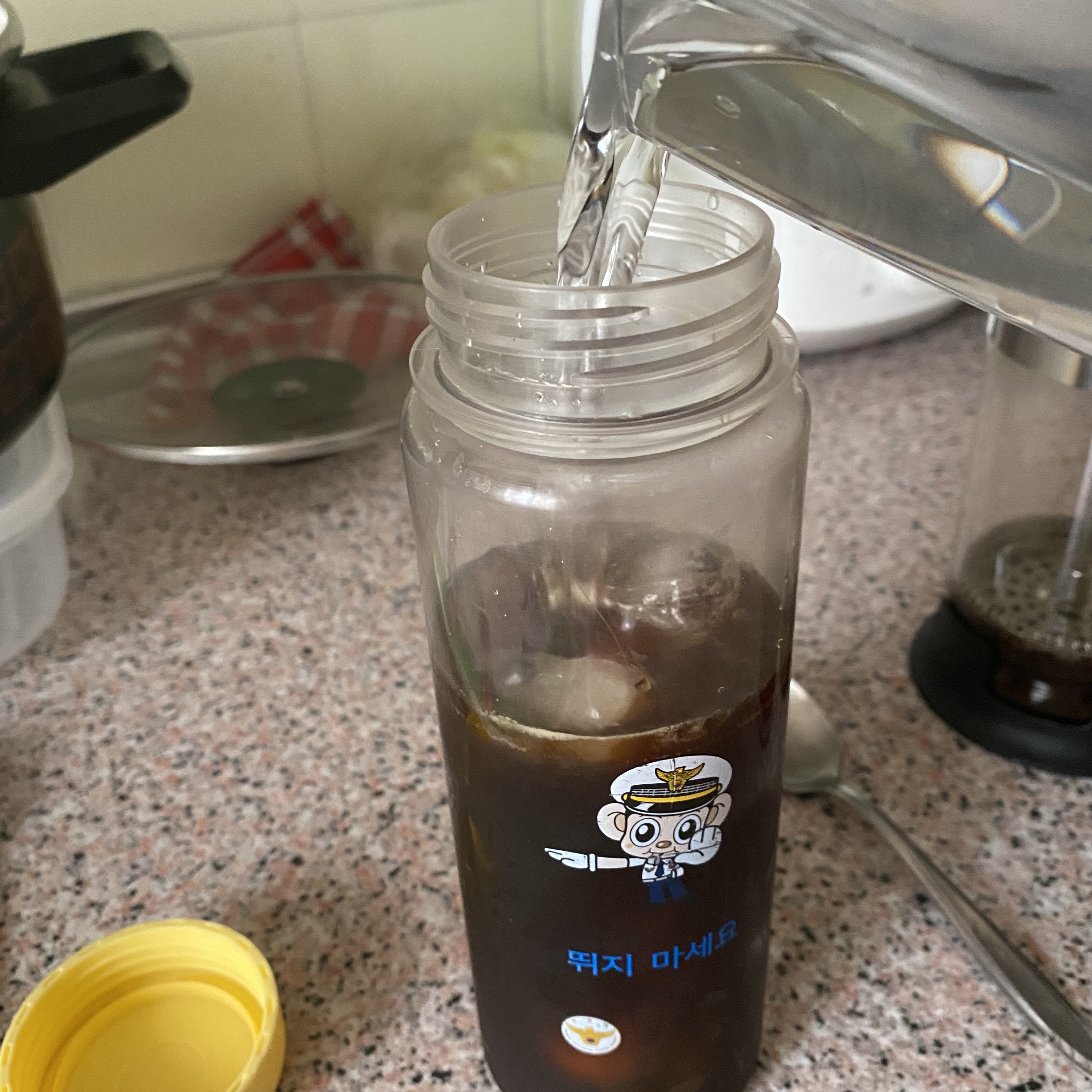 컵에 덜고 남은 아메리카노는 얼음 넣고 물을 더 넣어서 뒀다.