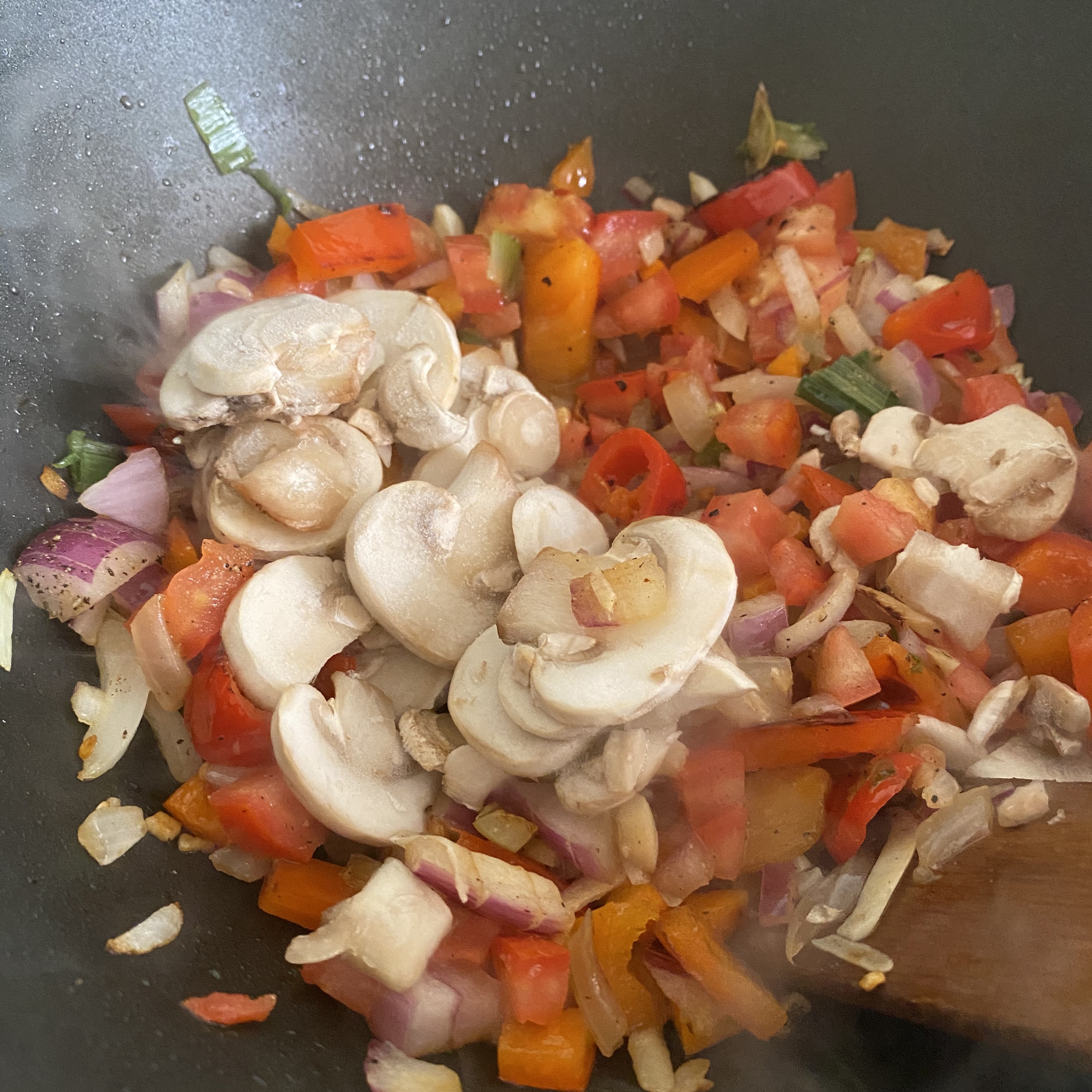 소금 후추 간도 하고 충분이 익을 때까지 볶아 준다. 있다면 버섯도 넣어준다. 그리고 토마토도 한개 정도 잘게 잘라서 넣어준다. (원래는 껍질도 까라고 하는데, 나는 귀찮아서 그냥 다 넣었다)