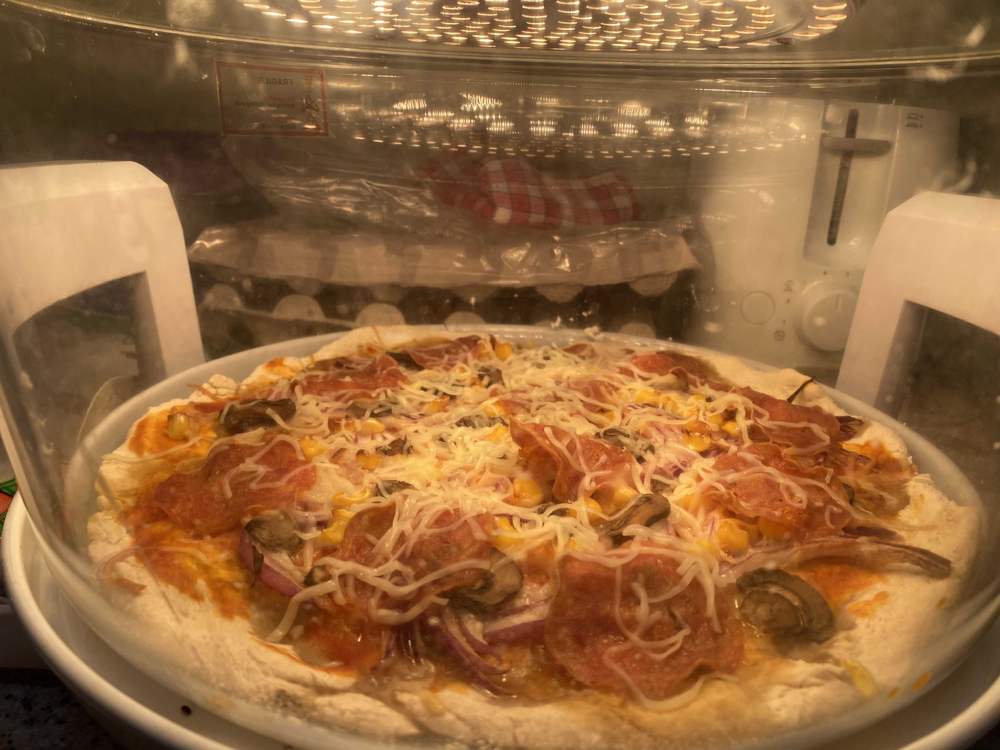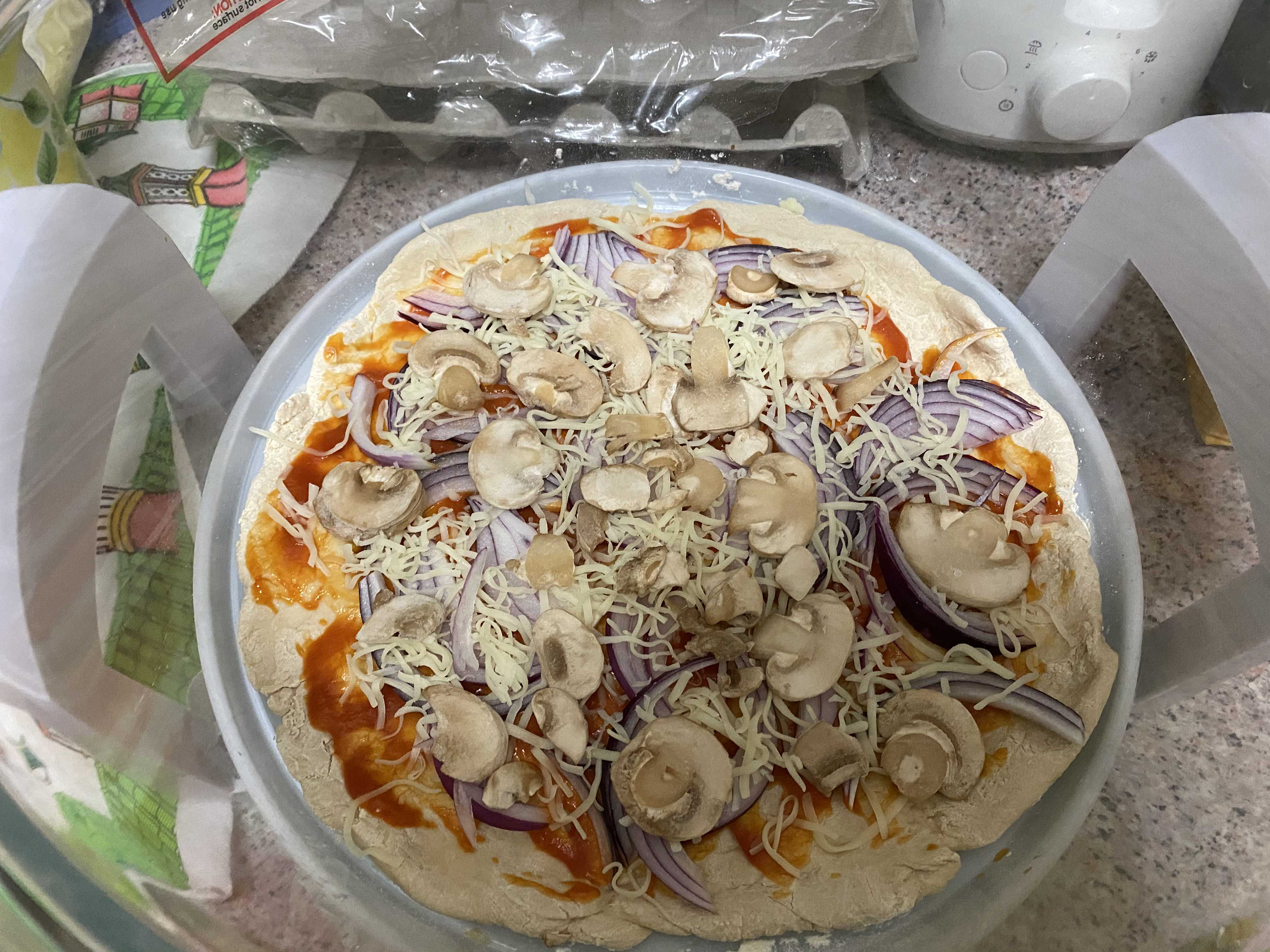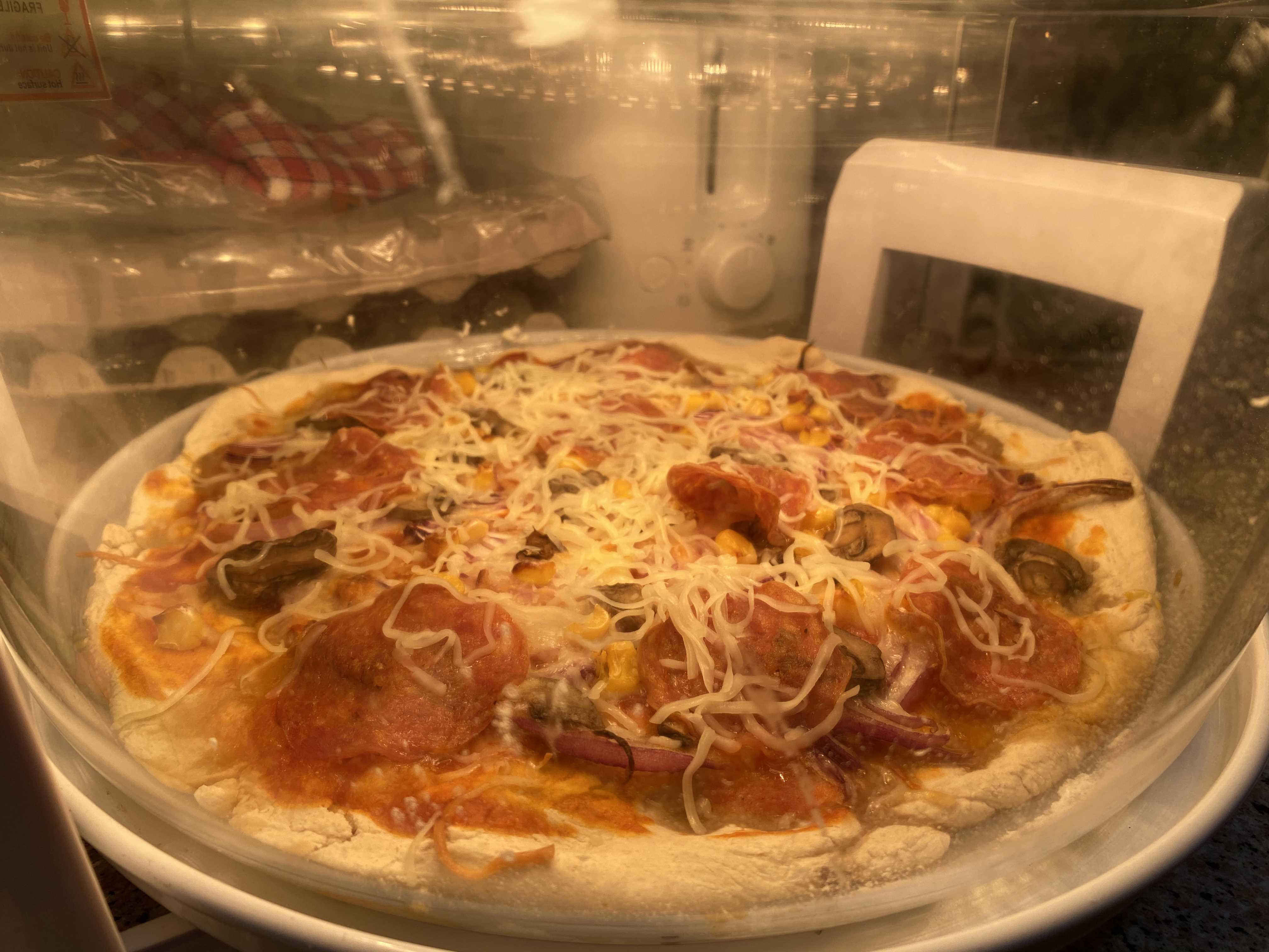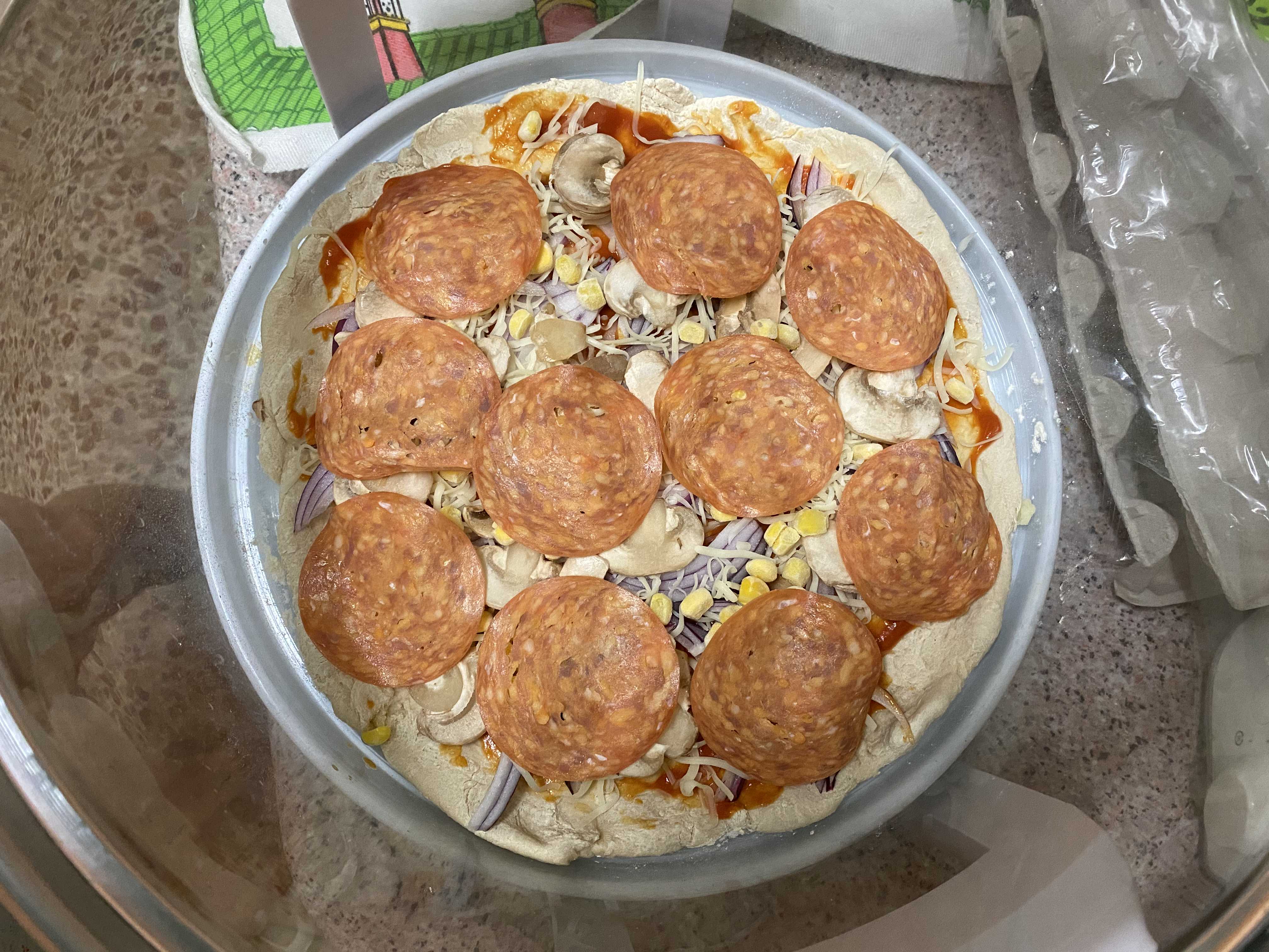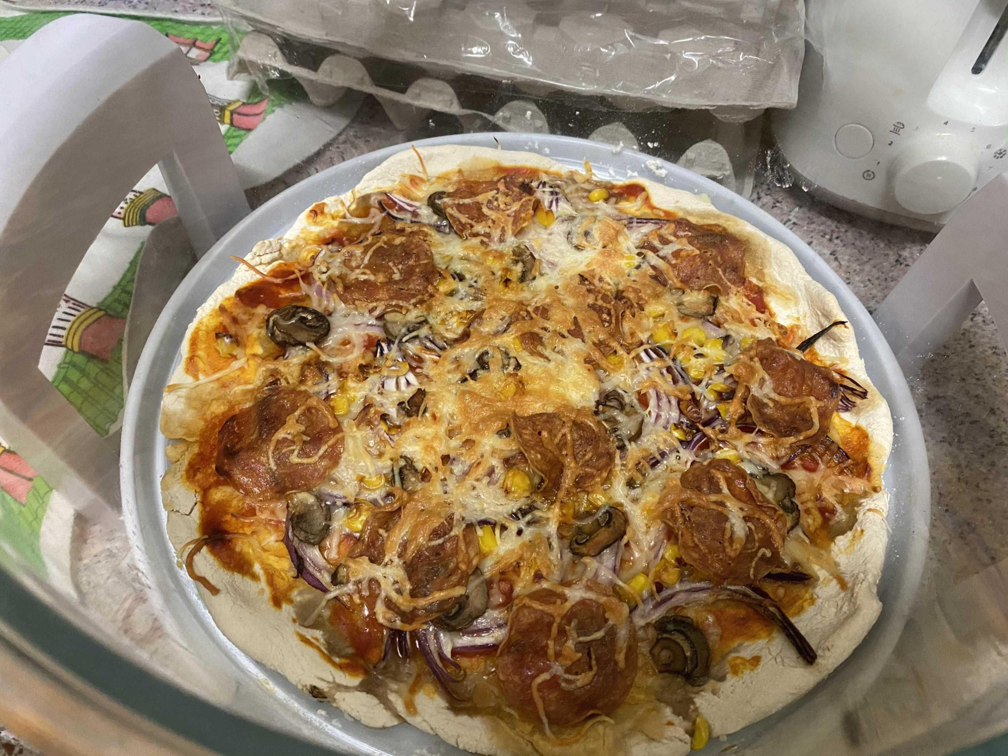 밑에 토마스 소스를 베이스로 깔아주고, 적양파 넣고, 치즈 넣고, 버섯도 올려줬다. 그 위에 옥수수랑 페퍼로니까지 얹었다. 그러고 일단 구워줬다.