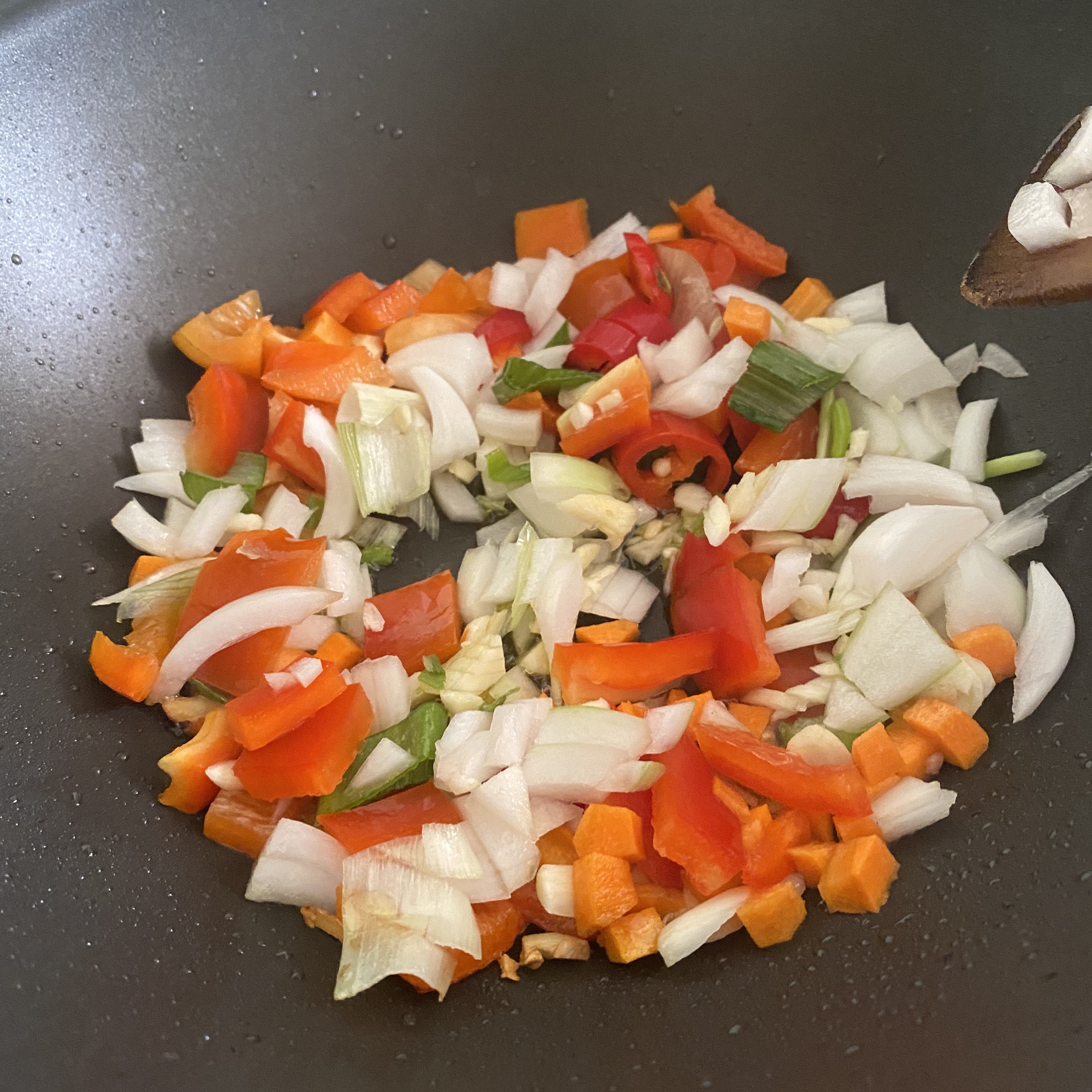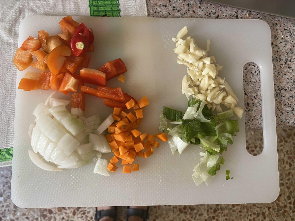 먼저, 재료를 준비해야 한다. 고기가 없으니 야채로 양을 채워야 한다. 어제 쓰고 남은 적양파, 그냥 양파 마늘, 피망, 당근, 파, 고추 (있으면) 등 냉장고에 있는 아무 야채나 잘게 잘른다.