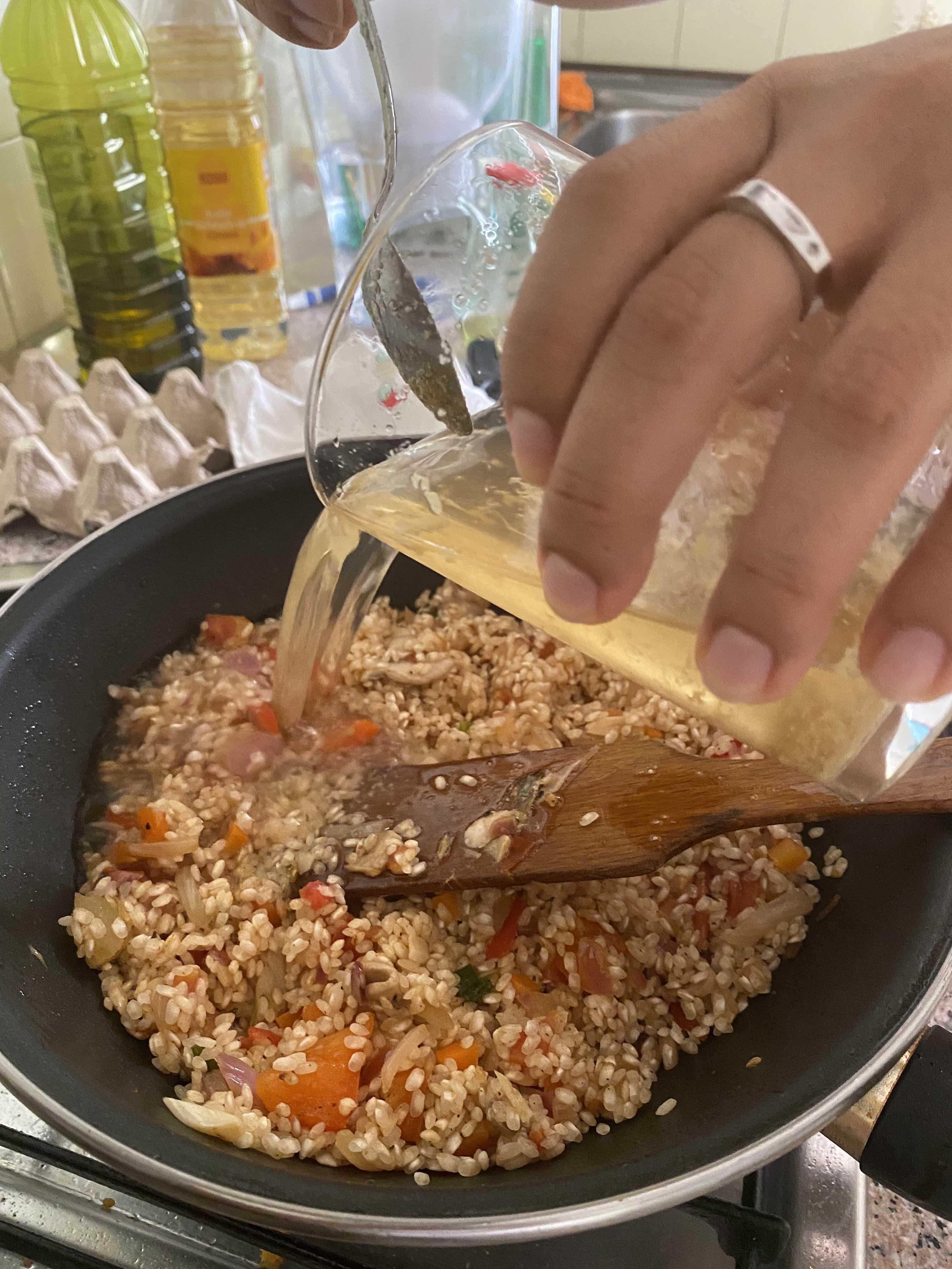 넷째, 어느정도 볶아지면 치킨 스톡을 넣어준다. 나는 저거 하나에 원래 1리터 붓는 건데, 그냥 한 500미리 되는 컵에 붓고 녹여서 후라이팬에 부어줬다. (사실 그러고 따로 물을 좀 더 넣긴 했다)