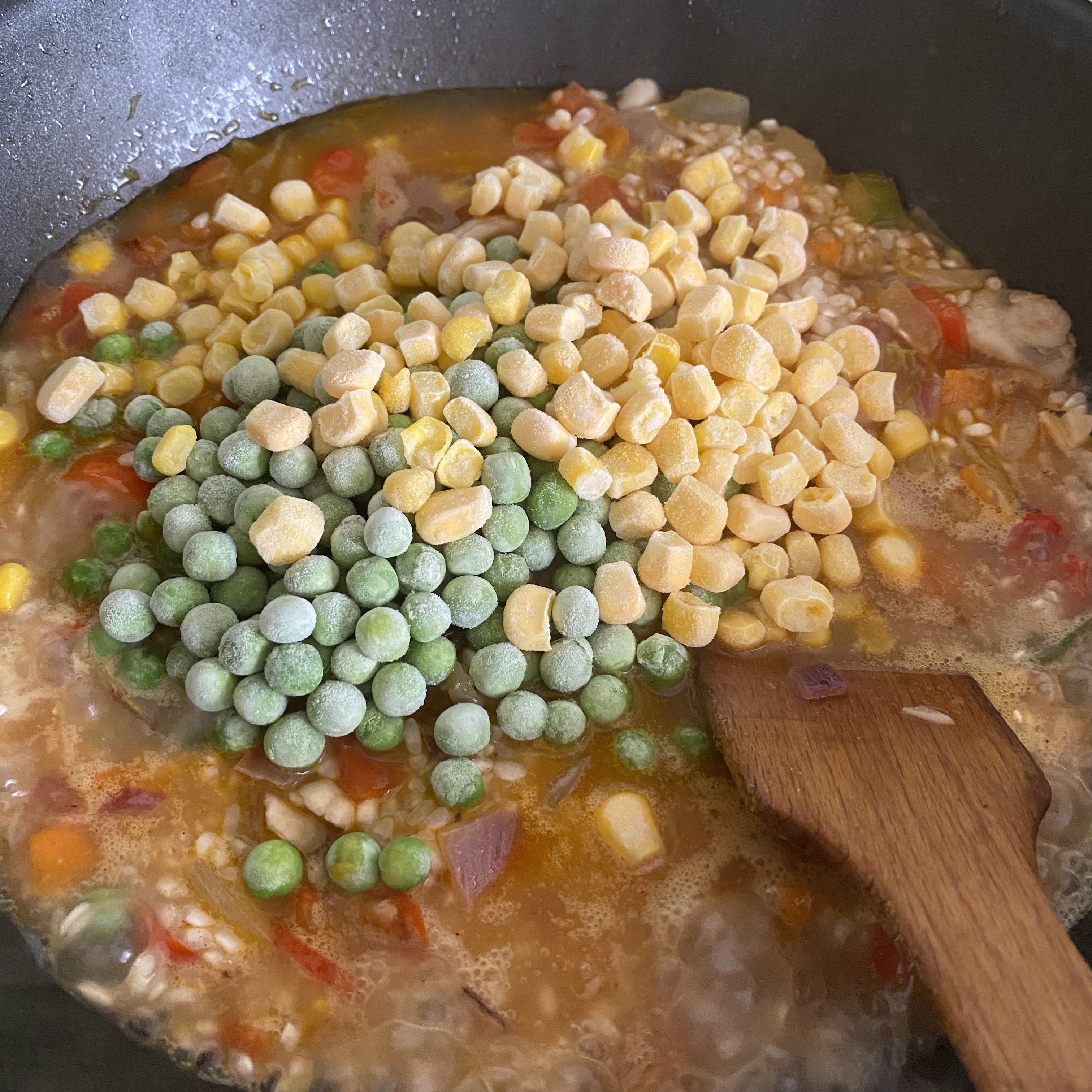 다섯째, 물을 부어준 후에 혹시 완두콩과 옥수수를 넣고싶다면 넣어도 좋다. 그리고 또 휙휙 저어준다.