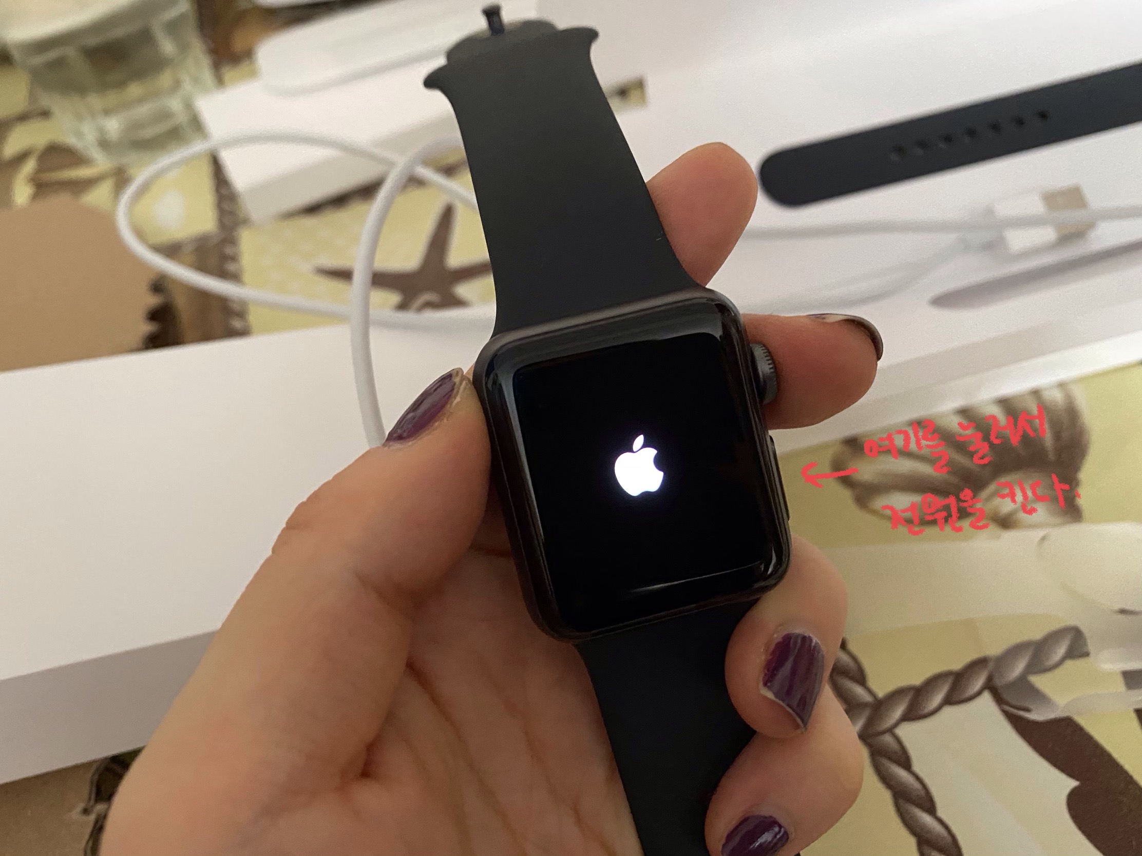 꺼내면 이런 느낌이다. 왼쪽 그림에는 뒤에 충전기랑 스트랩 M/L 가 또 들어있다. 오른쪽 그림에서처럼 전원을 끼면 이런 느낌! 사과가 이렇게 나온다. 아래 버튼을 누르면 전원이 켜진다. 오! 예쁘다.