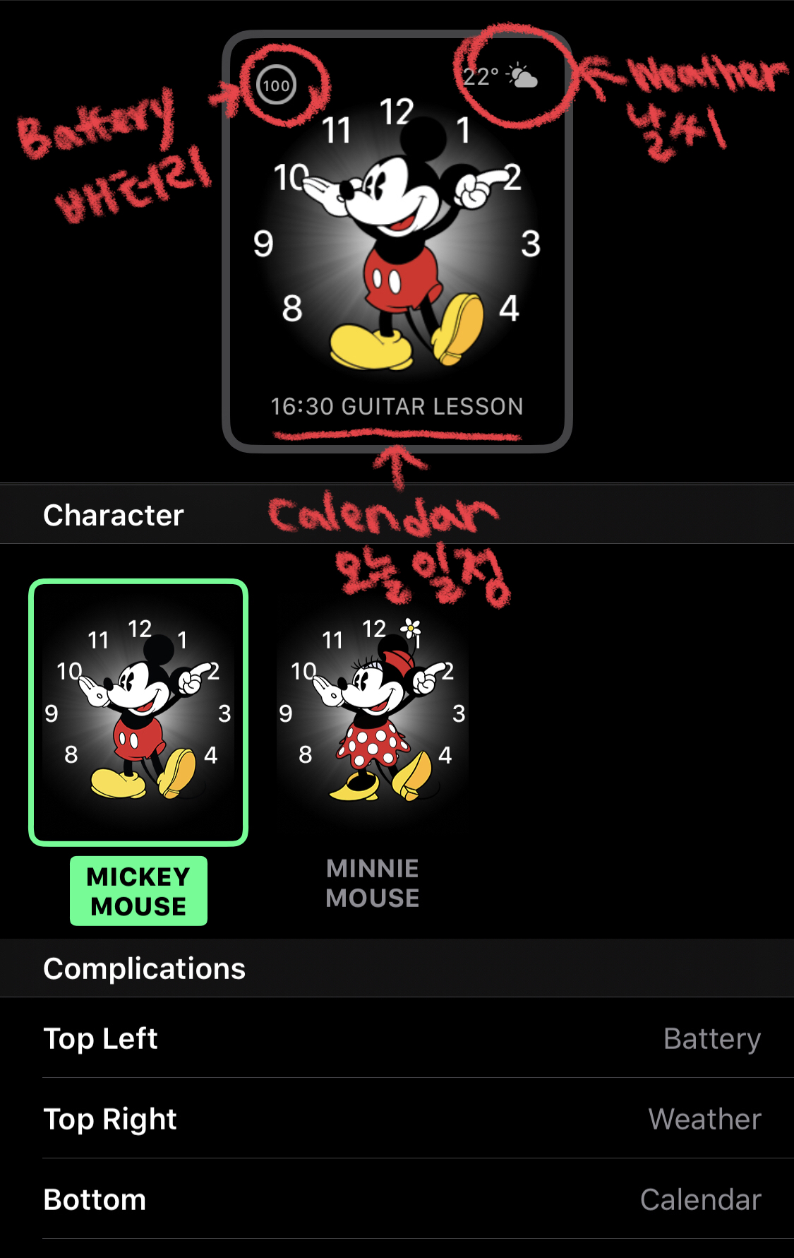 시간이 뜨는 화면도 내가 원하는 대로 바꿀 수 있다. 나는 미키마우스로 일단 해놨는데, 미키가 춤을 추고, 누르면 시간을 알려준다 ㅋㅋㅋㅋㅋㅋㅋ 너무 귀여워. 당분간 얘로 해놓지 않을까 싶다. 아! 그리고 배경화면에 따라 다르겠지만, 내가 원하는 정보도 넣을 수 있다.