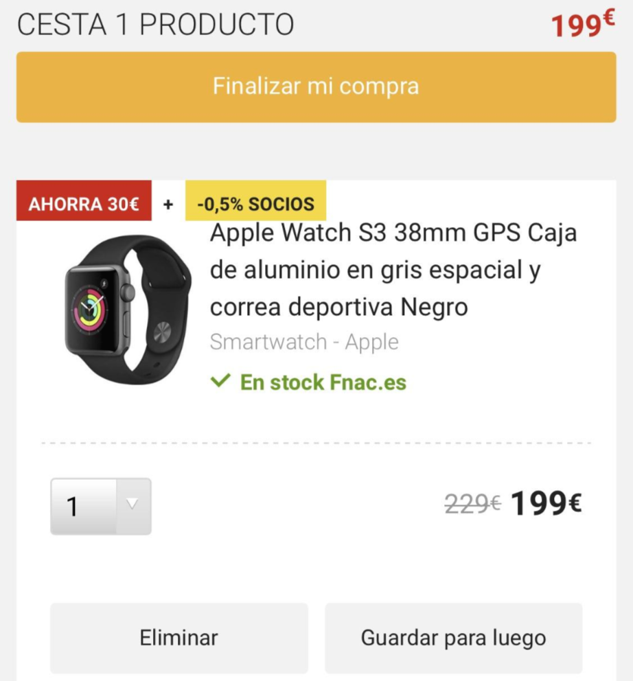 애플워치를 계속 사고 싶었다. 9월에 새로운 모델이 나올 걸 예상을 했지만, 너무 갖고 싶었다. 애플워치를 3을 살까 5를 살까도 꽤 고민을 했다. 그런데, fnac이라고 스페인, 포르투갈, 프랑스에서 전자제품 등 여러가지를 파는 매장에서 갑자기 30유로 세일... 약 한달정도 보고 있었는데, 세일이라니깐 눈이 돌아갔다.