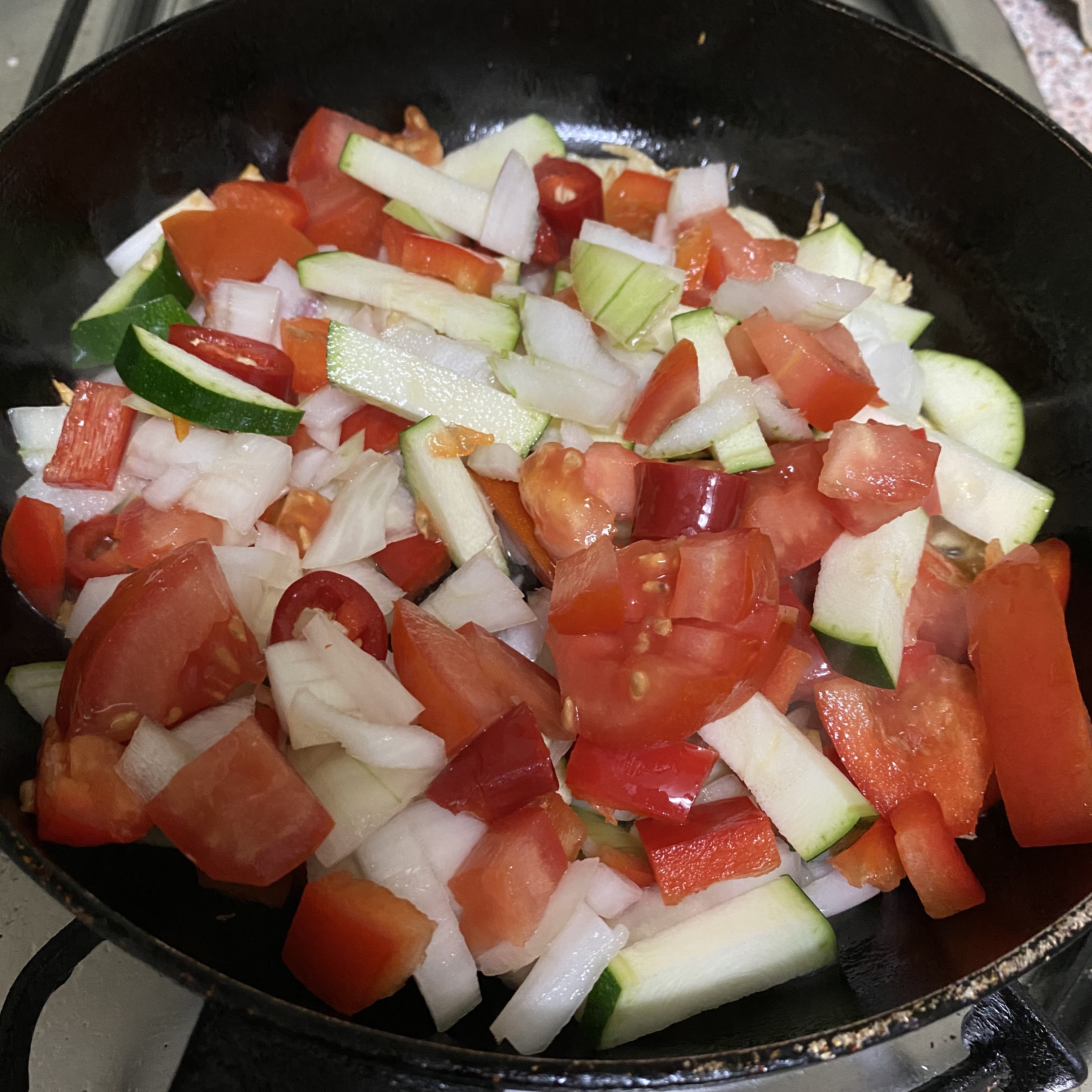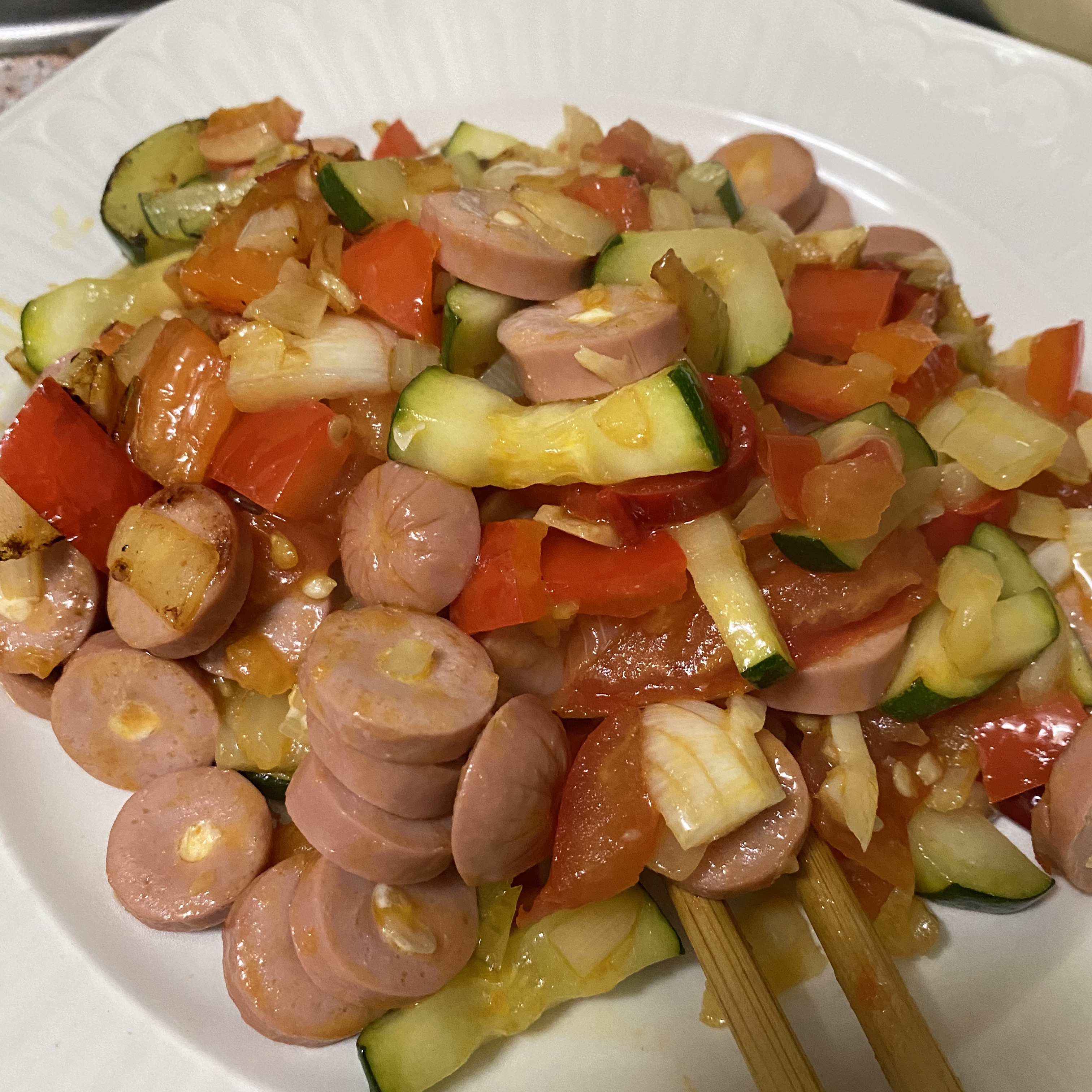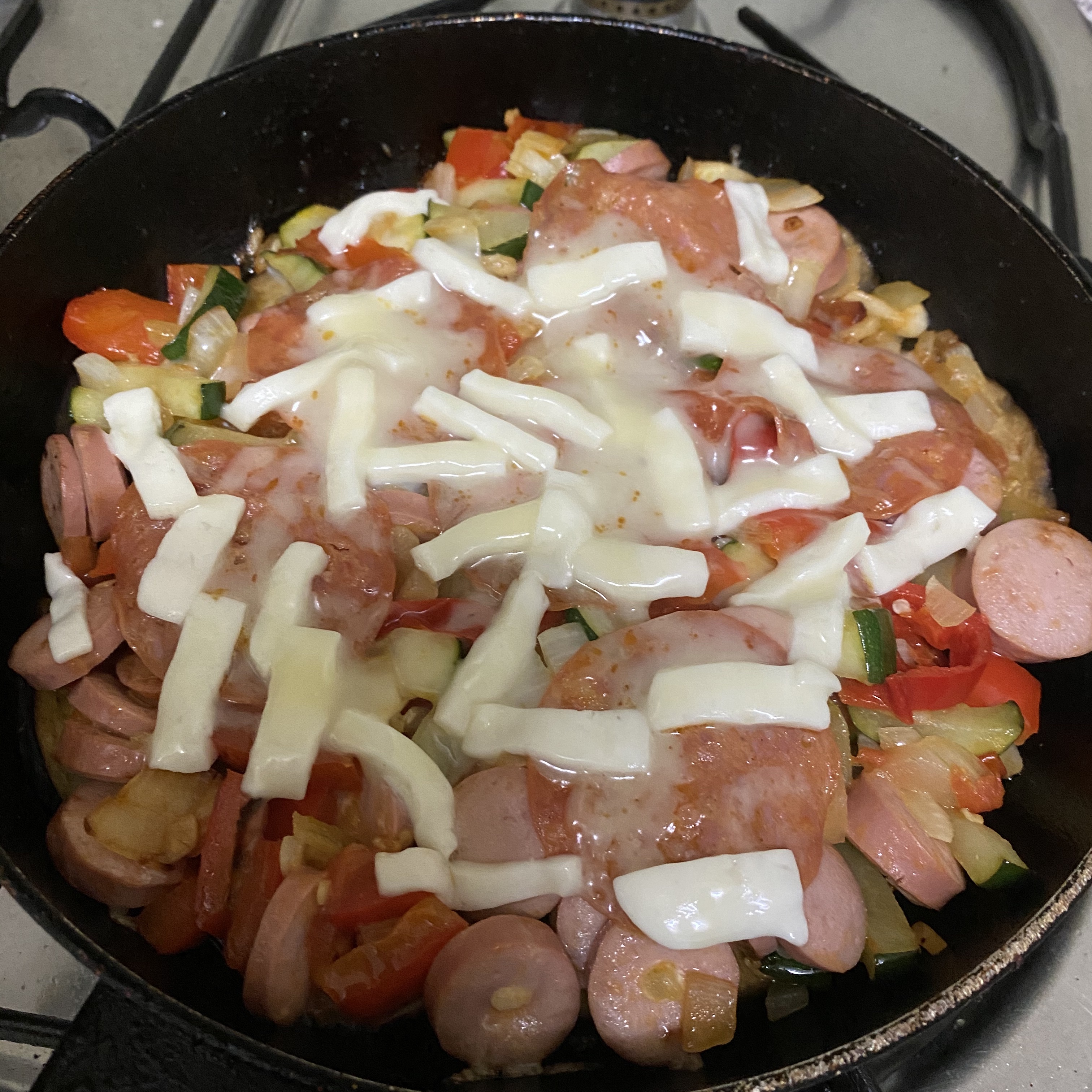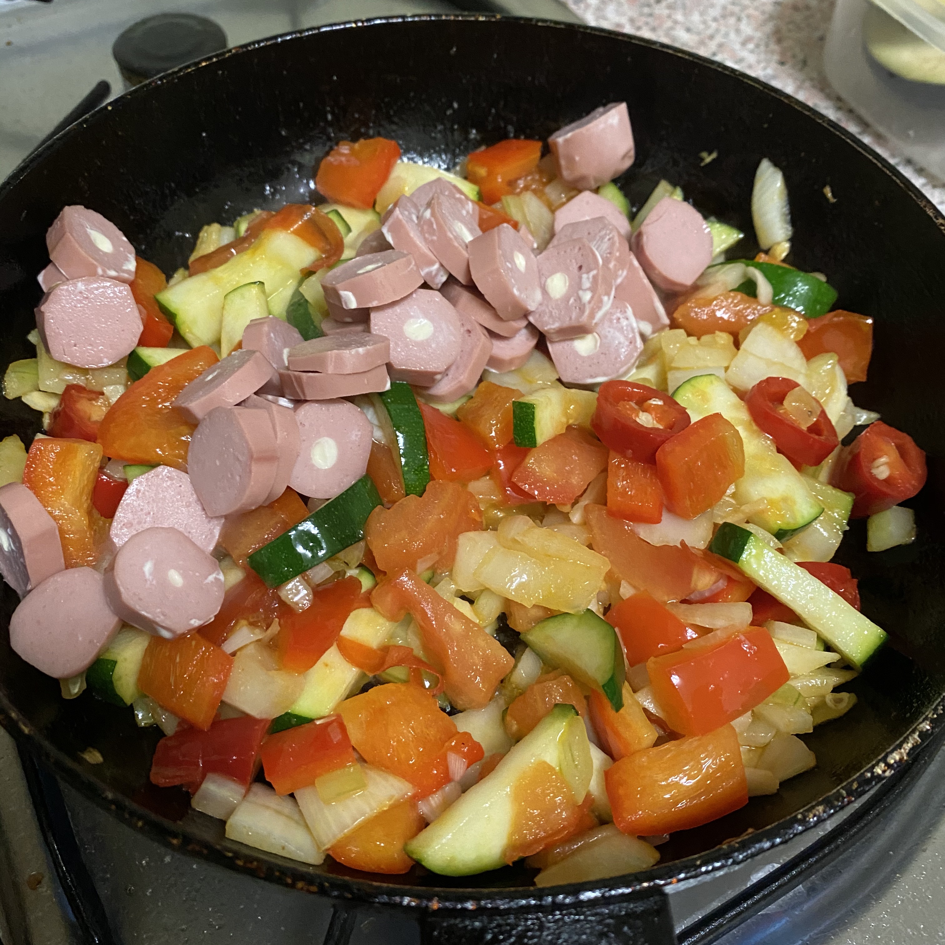 그 다음에 후라이팬에 야채들을 볶아 준다. 종류별로 넣으려고 했지만 실패. 결국 다 때려 넣었다. 야채들이 익으면 소시지도 넣어준다.