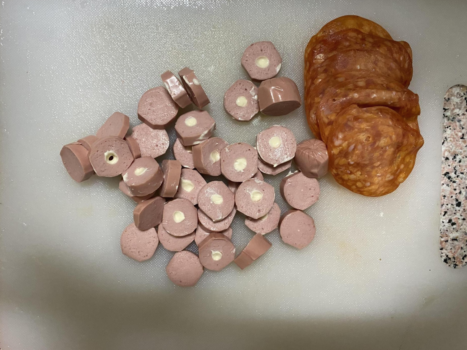 먼저 야채를 잔뜩 잘라서 준비를 한다. 원하는 야채 다 넣으면 된다. 가지도 저렇게 얇게 잘라서 준비를 한다. 그리고 냉장고에 있던 소시지와 페퍼로니도 준비했다.