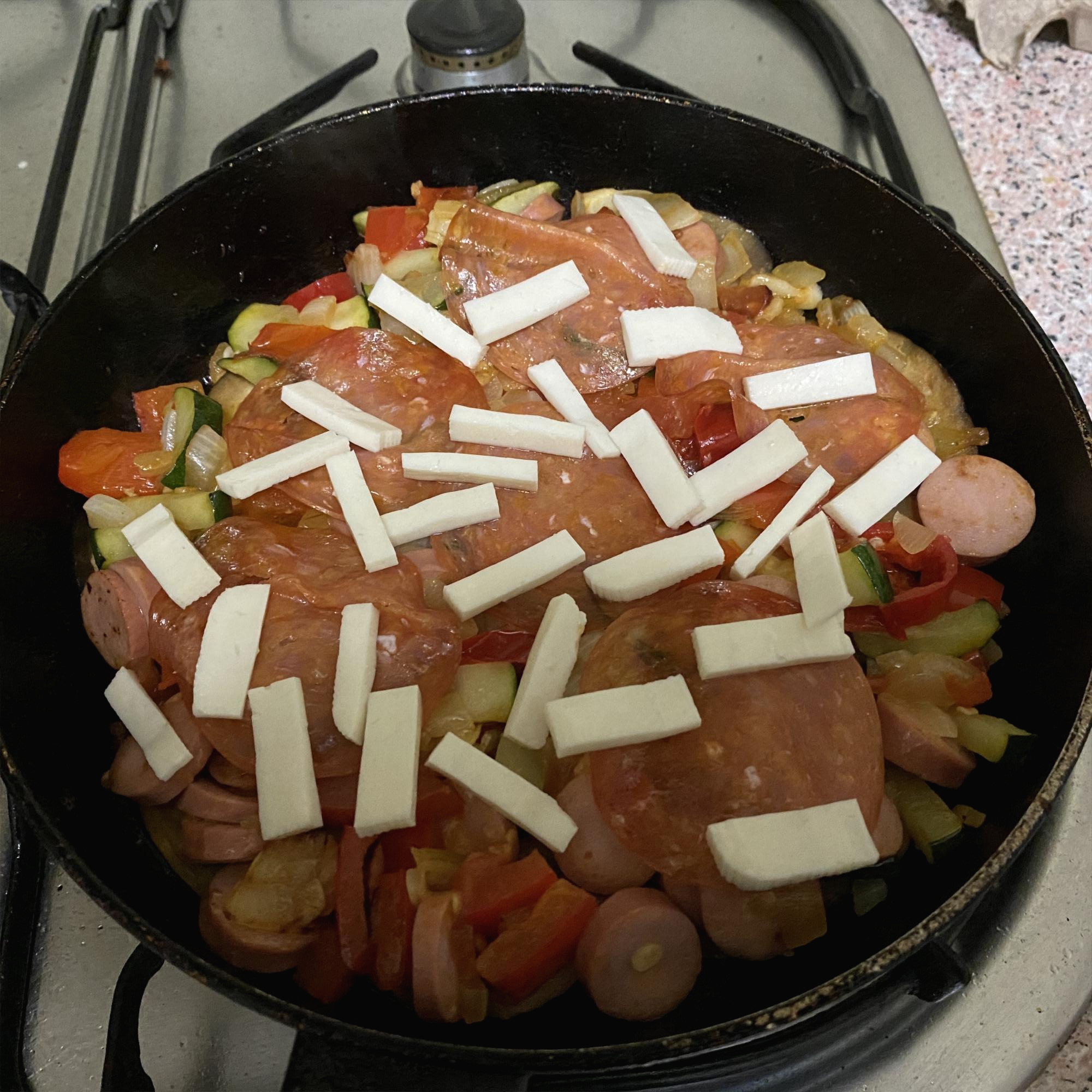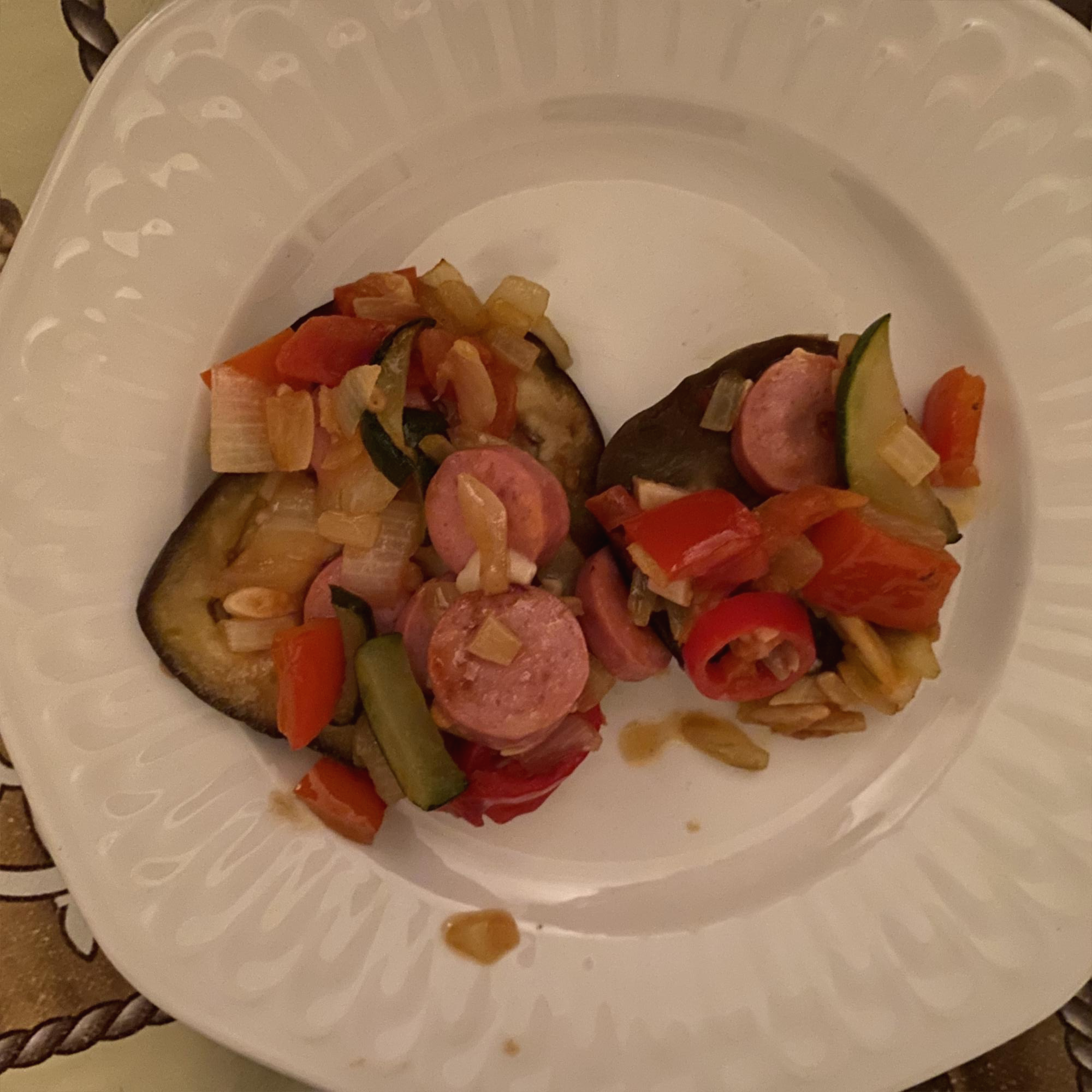 뒤집은 가지 위에 아까 그릇에 따로 담았던 재료들을 얹어주고, 페퍼로니와 치즈를 얹어준다. 잠깐 뚜껑을 덮고, 치즈가 적당히 익을 때까지 기다렸다가 꺼내면 끝! (사실 익은 가지 위에 피자처럼 토마토 소스를 얹어주려고 했건만 깜박했다.)