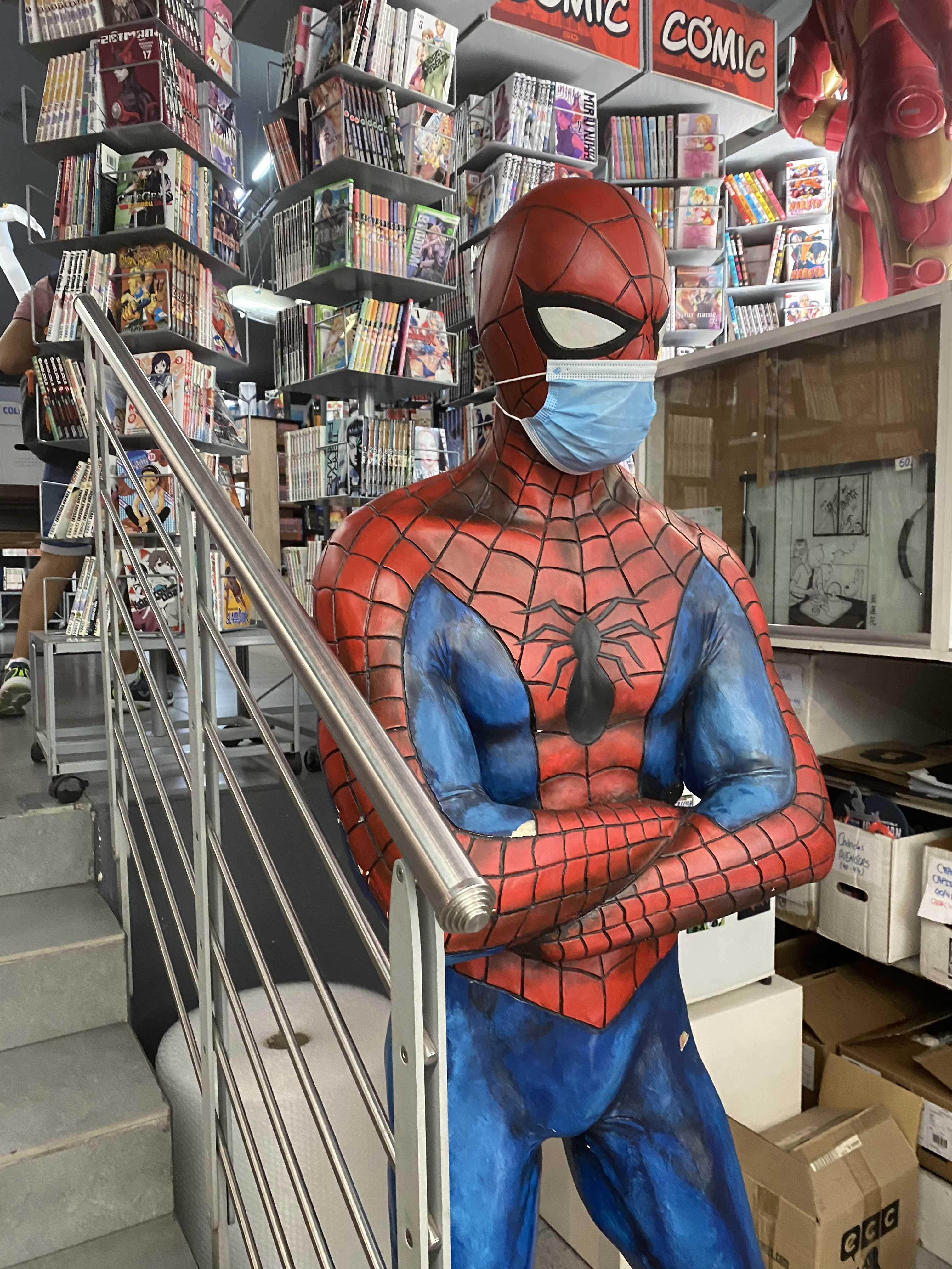 그리고 남자친구 부모님과 만나려면 아직 시간이 있어서, 근처에 가게들을 돌아다녔다. 사실 우리가 영화 캐릭터들을 좋아해서 그런 제품들 피규어를 파는 가게에 갔었다. 그냥 구경하러 다녔는데, 스파이더맨도 마스크를 쓰고 있었다. 근데 스파이더맨 귀가 없네. 불편할 것 같다.