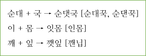 이때 합성어는 '순대국'이 아니라 '순댓국'으로 변해요. 사이에 시옷이 들어갔어요.