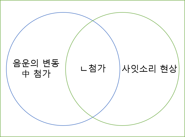 'ㄴ첨가'는 합성어와 파생어에서 모두 일어나는 현상이고, 그 중에 합성어에서 나타나는 'ㄴ 첨가'는 사잇소리 현상에도 포함되는 것입니다. 위의 벤다이어그램을 참고해주세요. 즉 다시 한번 사잇소리 현상은 합성어에서만 일어나는 현상이라는 것을 기억해야 합니다. 합성어와 파생어의 'ㄴ첨가'를 비교해 보겠습니다.