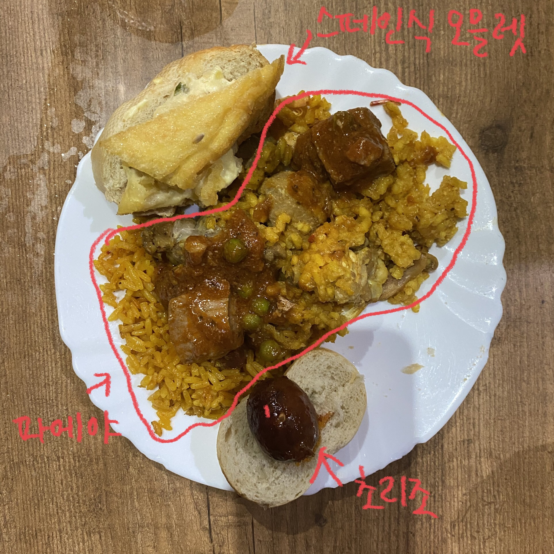 자세히 보면, 빵 위에 스페인식 오믈렛 (tortilla de patata, 또르띠야 데 빠따따) (원래는 두개 나왔는데, 하나 이미 뱃속으로 사라짐 ㅎㅎㅎㅎ)와 스페인의 햄인 초리조 (chorizo)가 얹어 있고, 이렇게 먹는다.