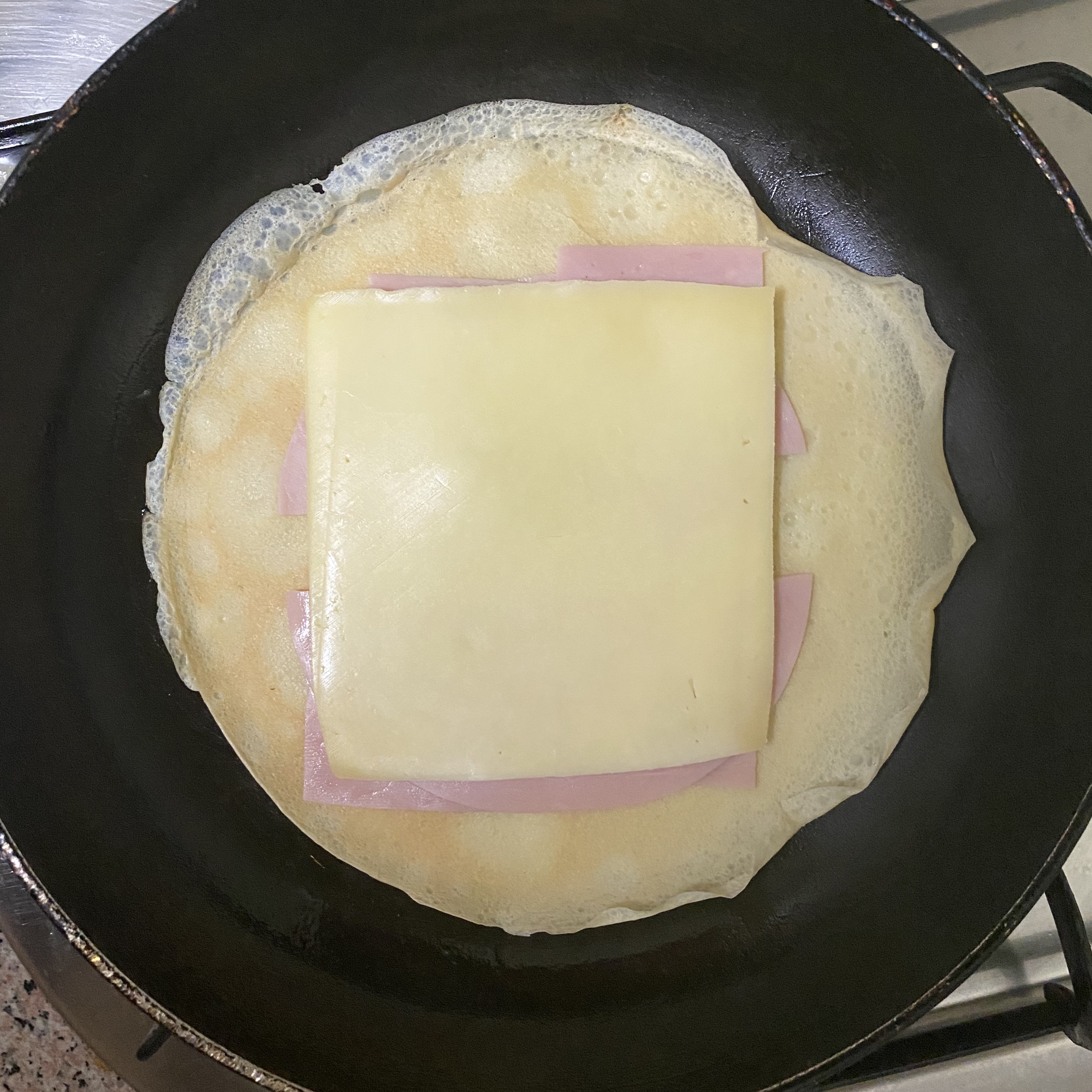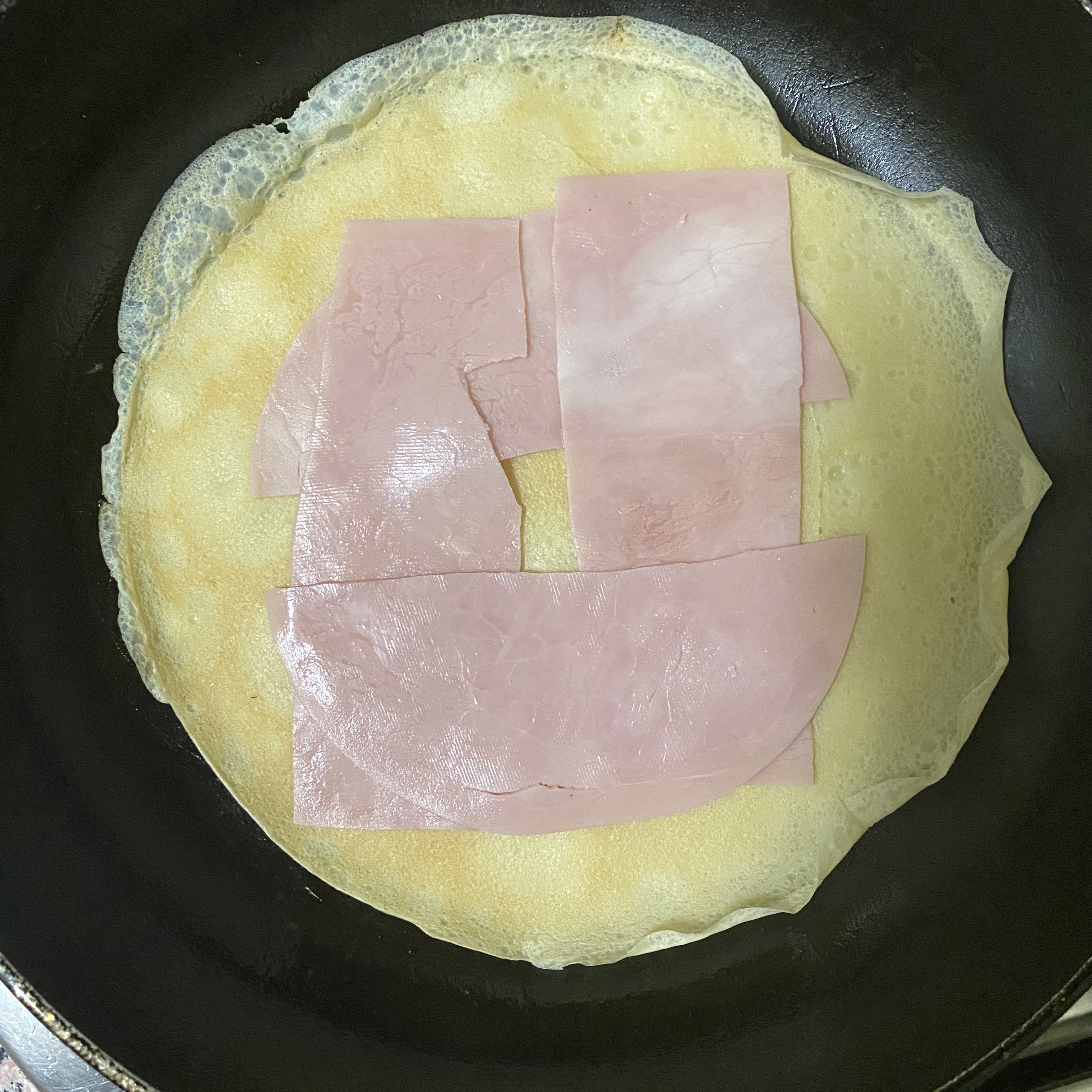 크레페를 다 만들었으면, 다시 후라이팬에 얹어서 햄을 얹어주고, 치즈도 얹어준다.