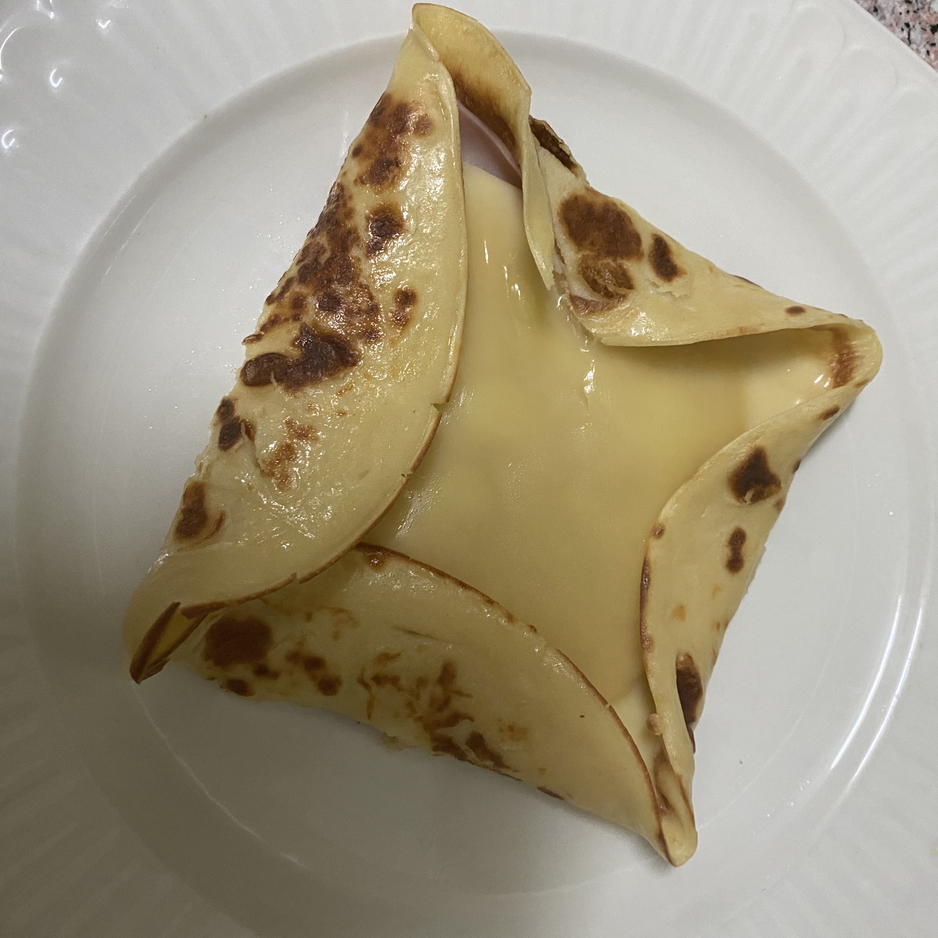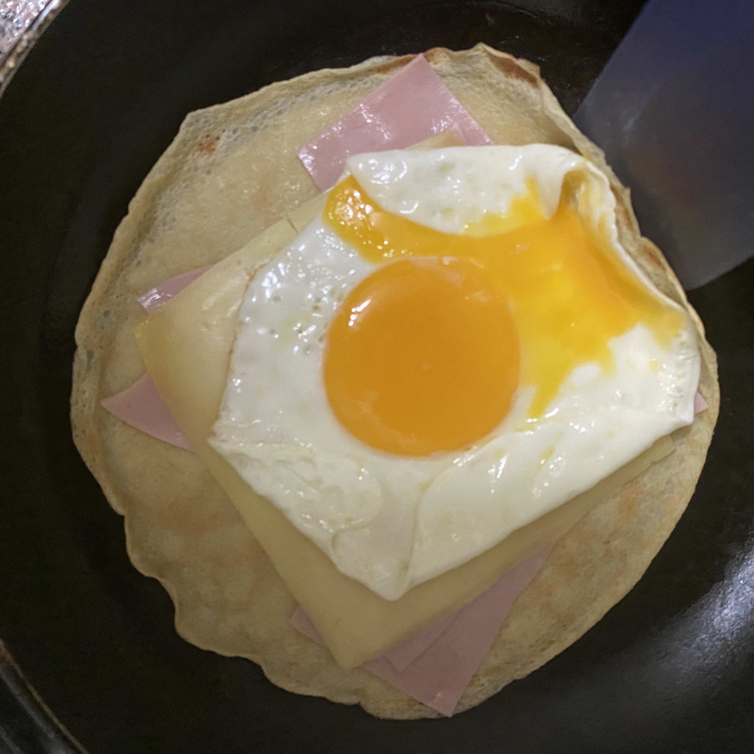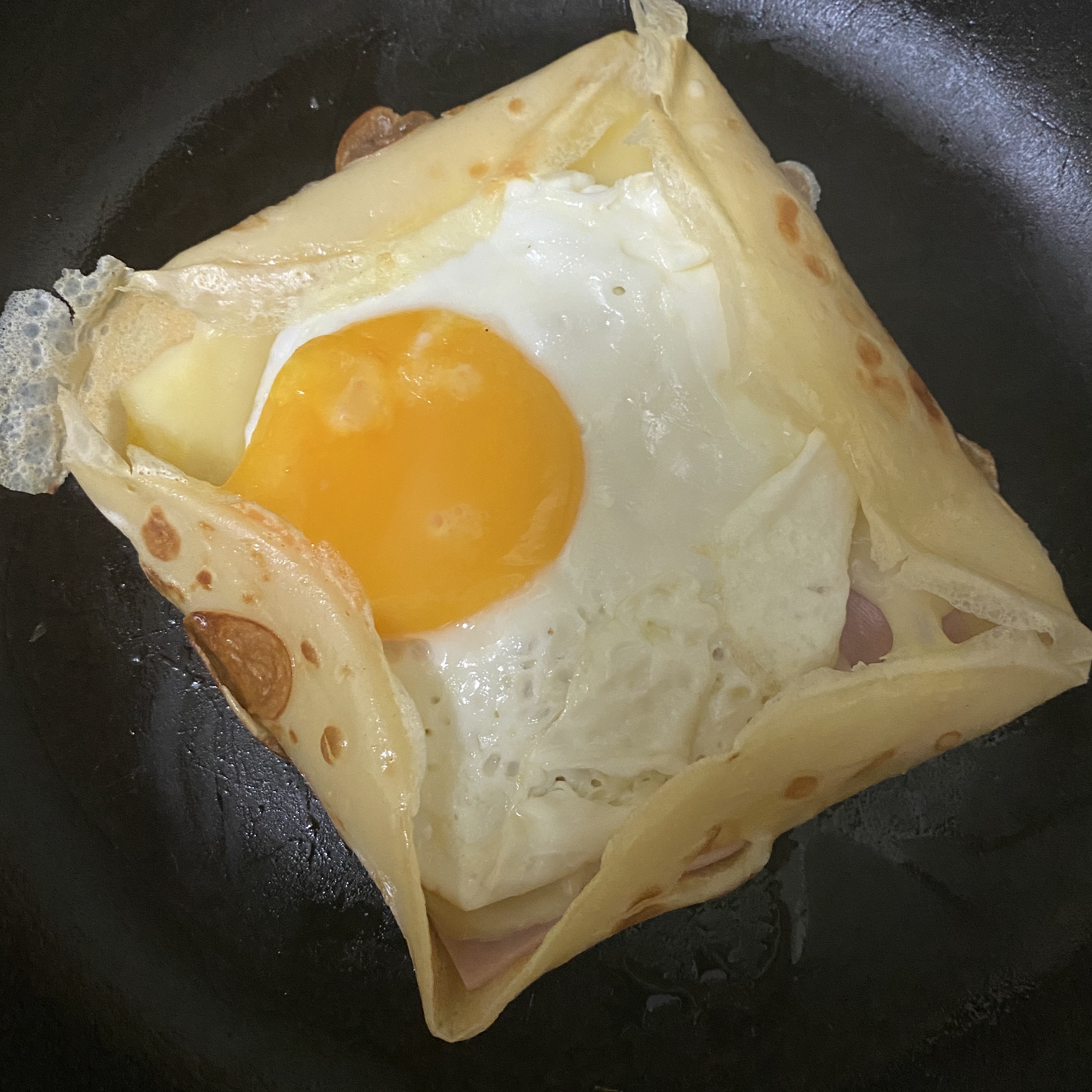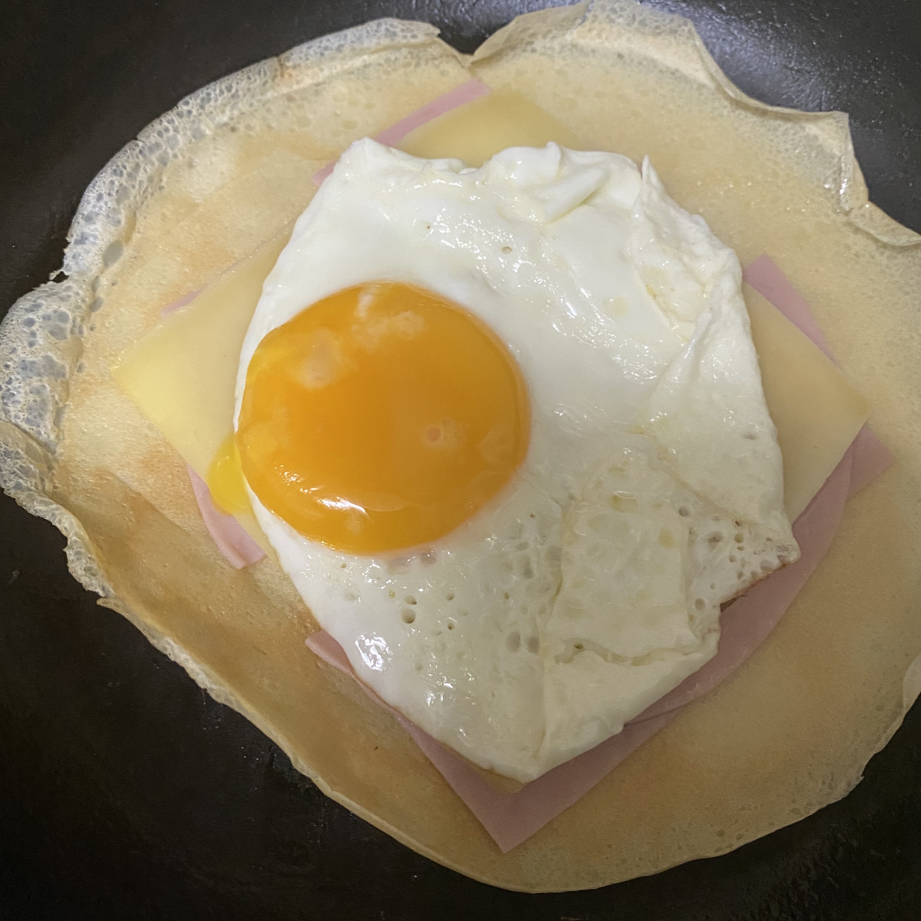 그 위에 계란을 얹어서 얘를 접어줘야하는데, 후라이팬이 크지 않다보니 크레페도 작게 나왔고, 뭐 접힐 가능성이 없다. ㅎㅎ 치즈 녹으면 그 위에 예쁘게 접혀줘야하는데, 안된다 ㅋㅋㅋㅋㅋ 동영상이랑은 많이 다른..
