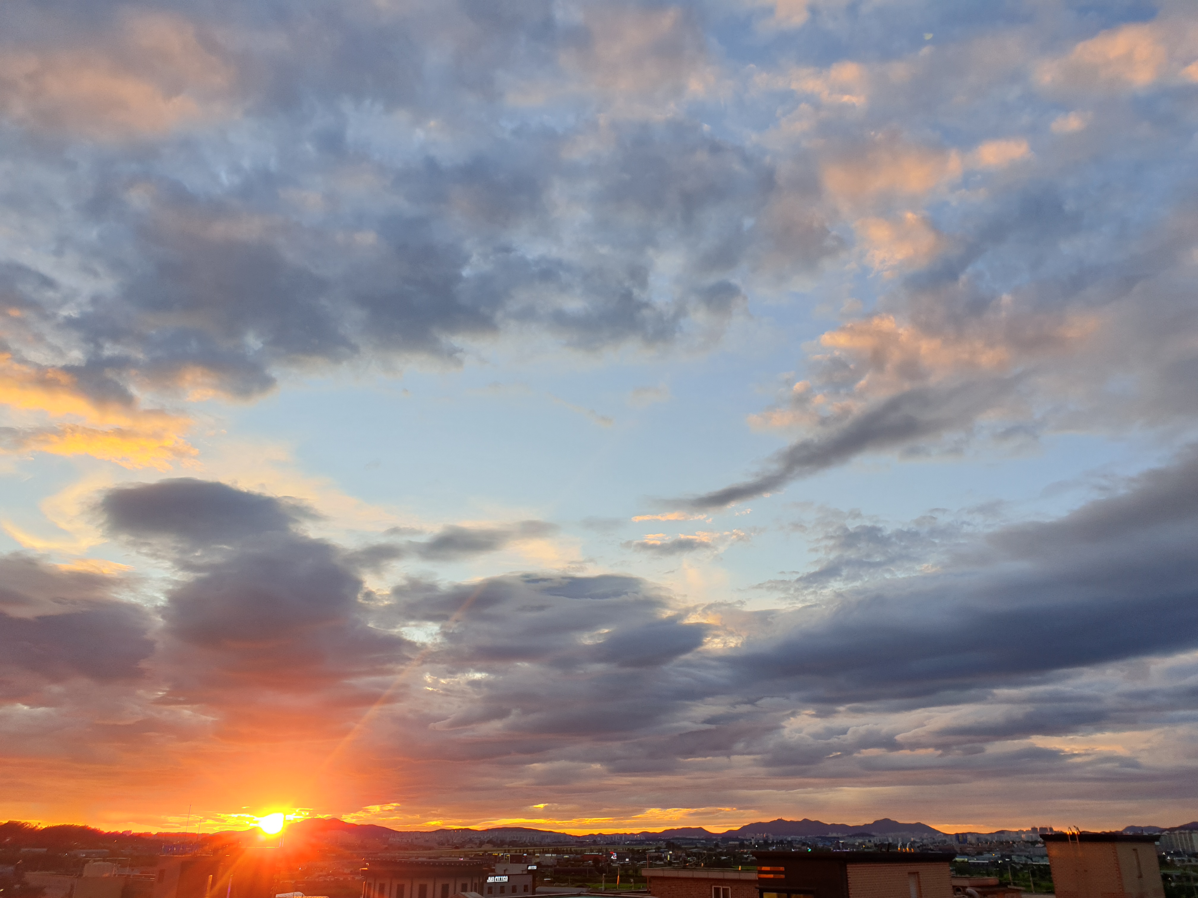 저렇게 새빨간 해를 보면 반지의 제왕의 '사우론'의 눈이 생각난다. 왠지 어디선가 '샤이어 배긴스'하는 소리가 들릴 거 같다. ㅋㅋㅋㅋ 실제로 보면 더 새빨개서 온 세상이 붉은 빛이 되는 것 같다. 이 날도 비 갠 후의 하늘이라 하늘에 뭉게구름이 많다. 그래서 더 멋있는 하늘이 된 거 같다.