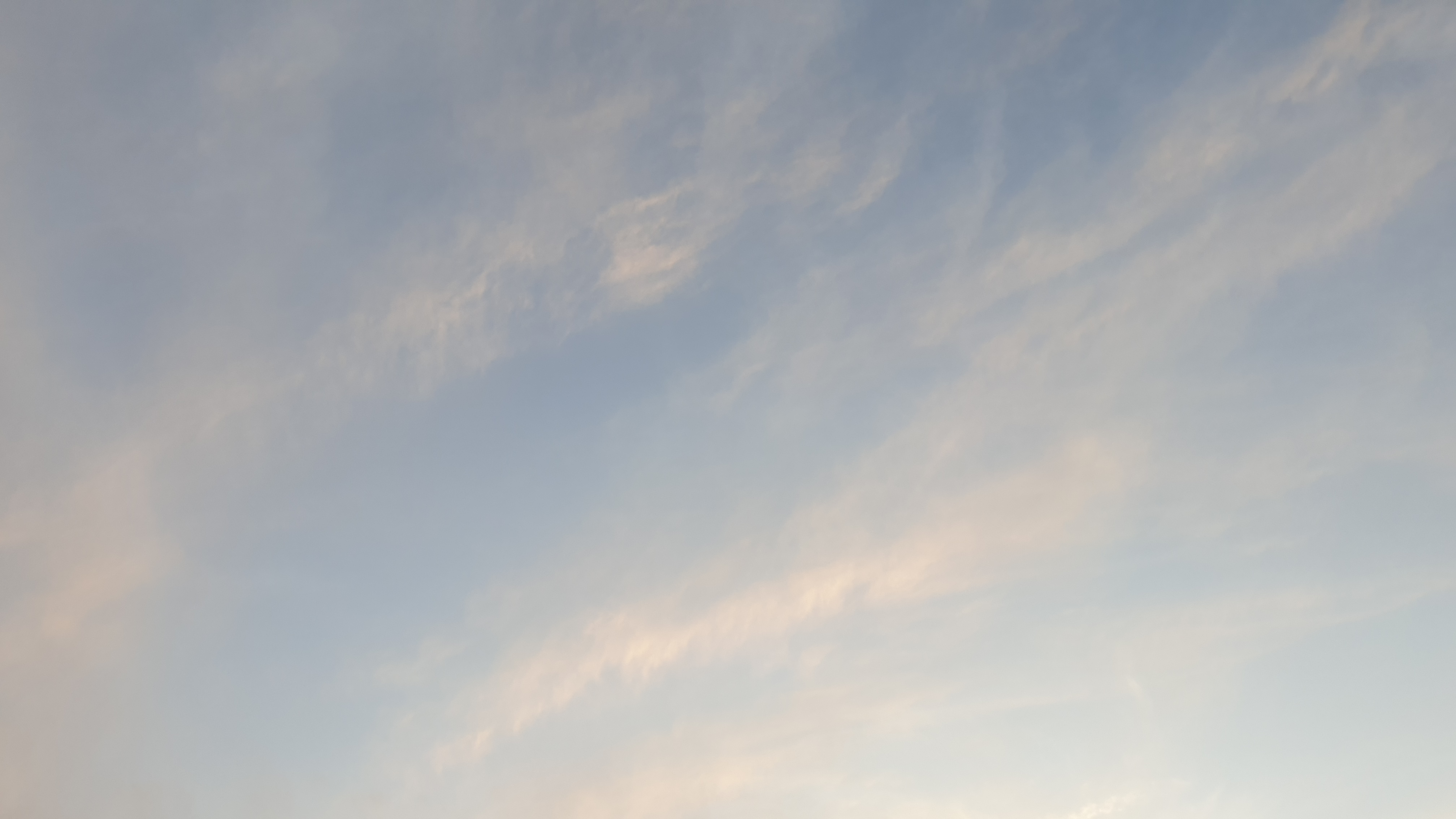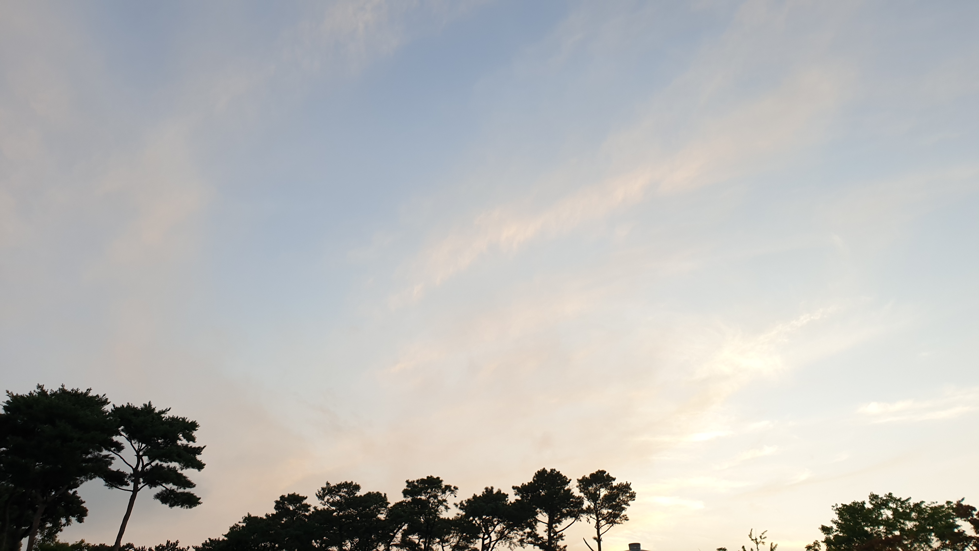 완전 노을이 지기 전 하늘색과 핑크빛이 섞인 하늘이다. 구름이 살랑살랑 있어서 더 예쁜 사진이다.