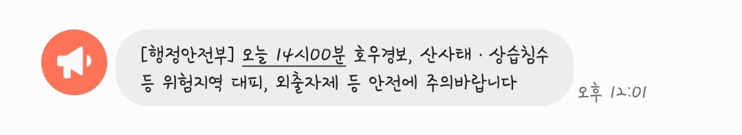 어제 밤부터 시작된 비가 끝나지 계속 오고 있어요. 방금 호우경보라는 재난문자를 받고 비가 점점 심해져 천둥번개도 치고 있어요. 폭우로 피해를 입은 지역도 점점 많아져서 이제 비가 그쳤으면 좋겠는데 설상가상으로 태풍까지 오고 있다고 합니다. 정말 비 피해 없이 끝났으면 좋겠어요.