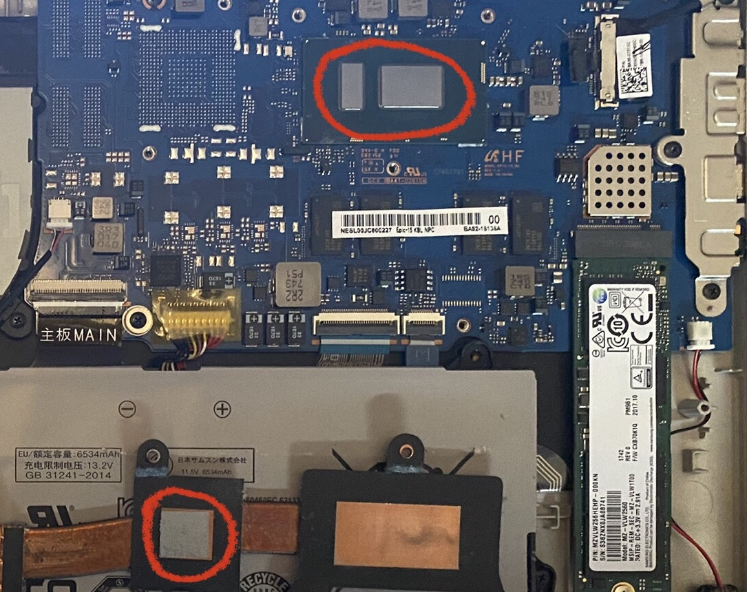 내가 도포해야 할 곳은 아래에 표시한 동그라미를 친 부분이다. 원래 칠해져 있던 곳을 발라주기로 했다. 원래 발려져 있던 써멀구리스를 휴지로 닦으니깐 엄청 잘 닦인다. 2년이나 썼지만, 막 굳거나 하지는 않았다.