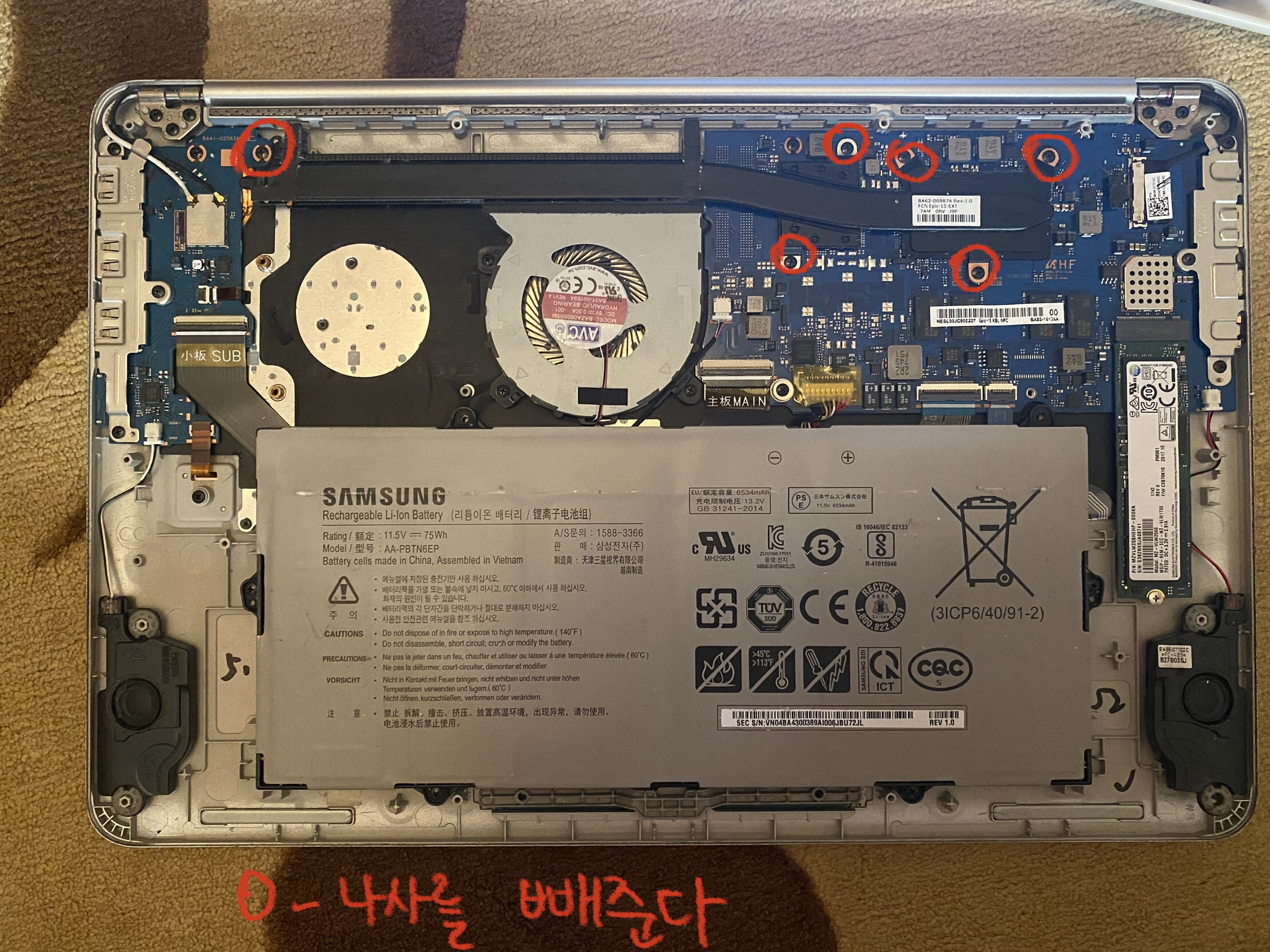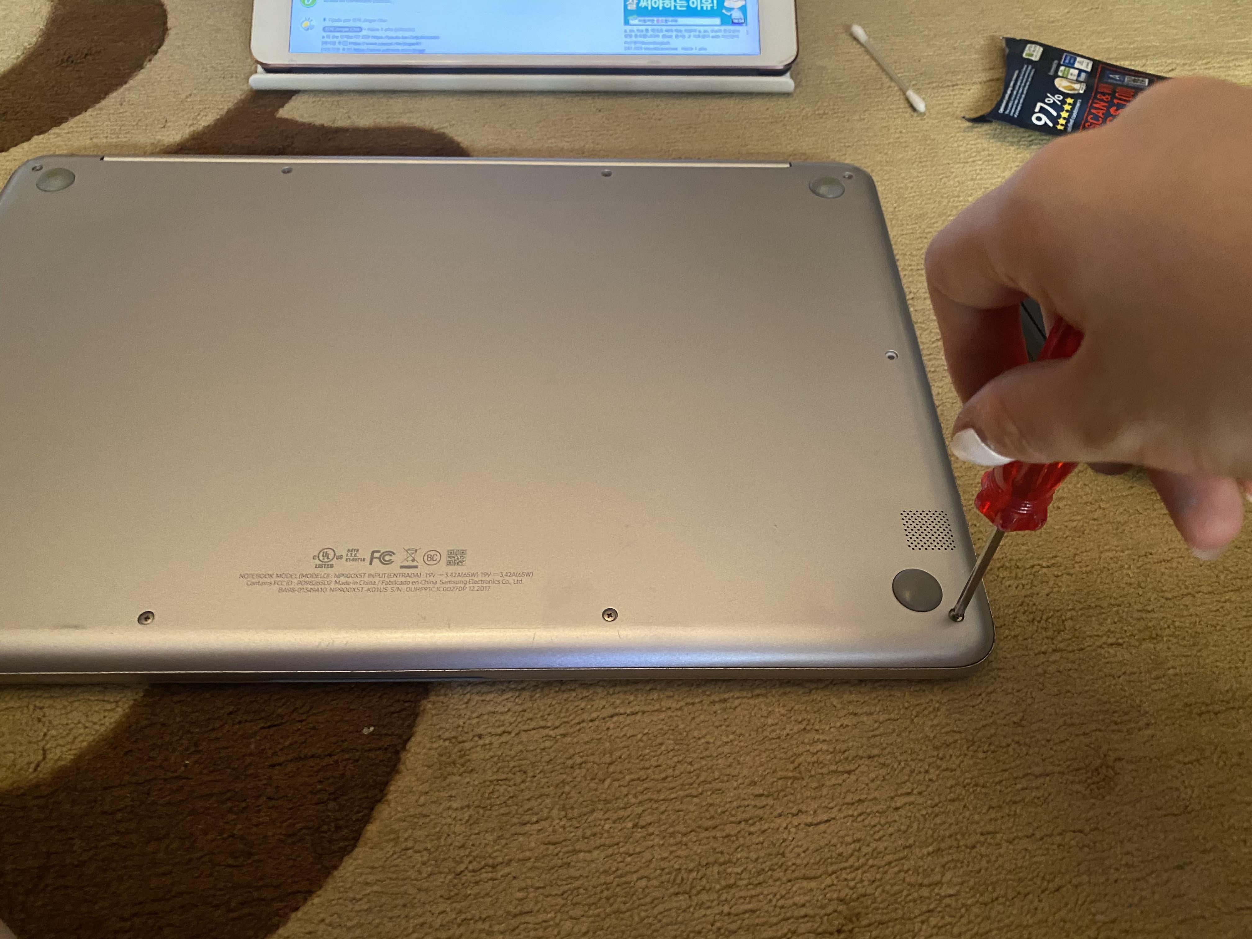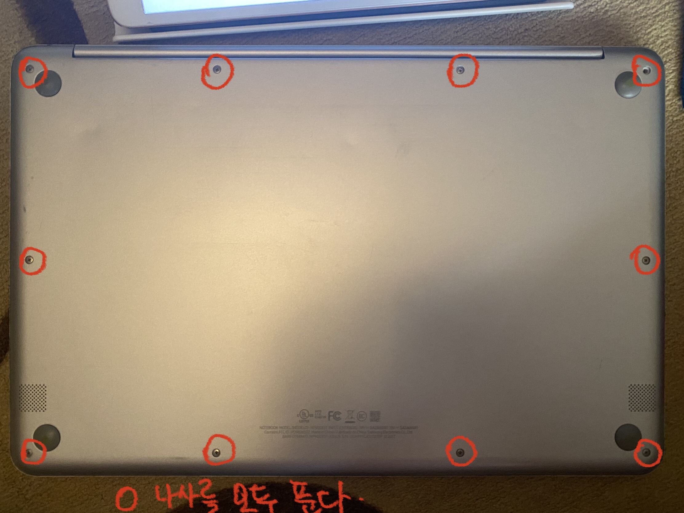 일단 노트북 뒷판을 열어야 하니, 뒤집어 준다. 그리고 나사를 다 빼서 열어준다.