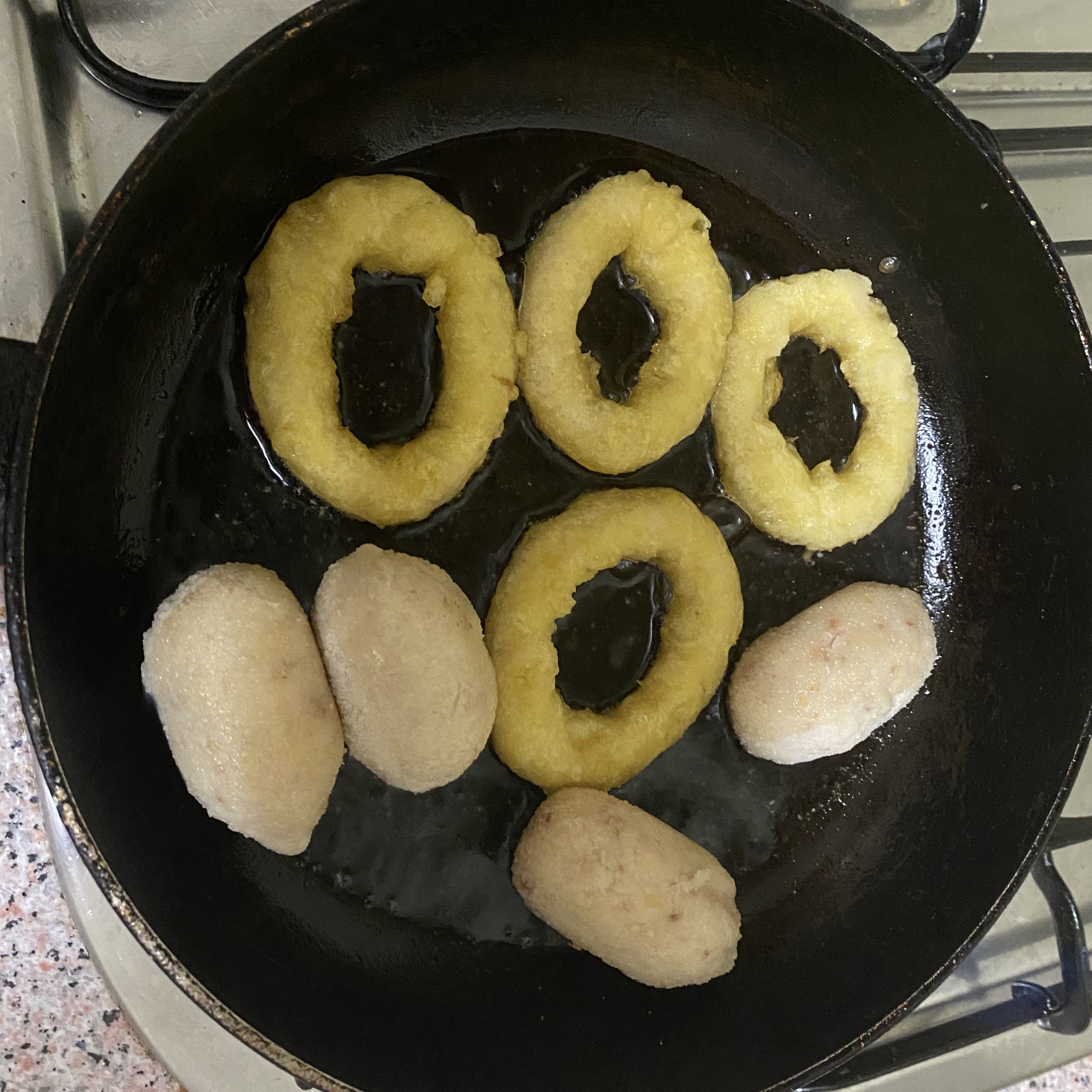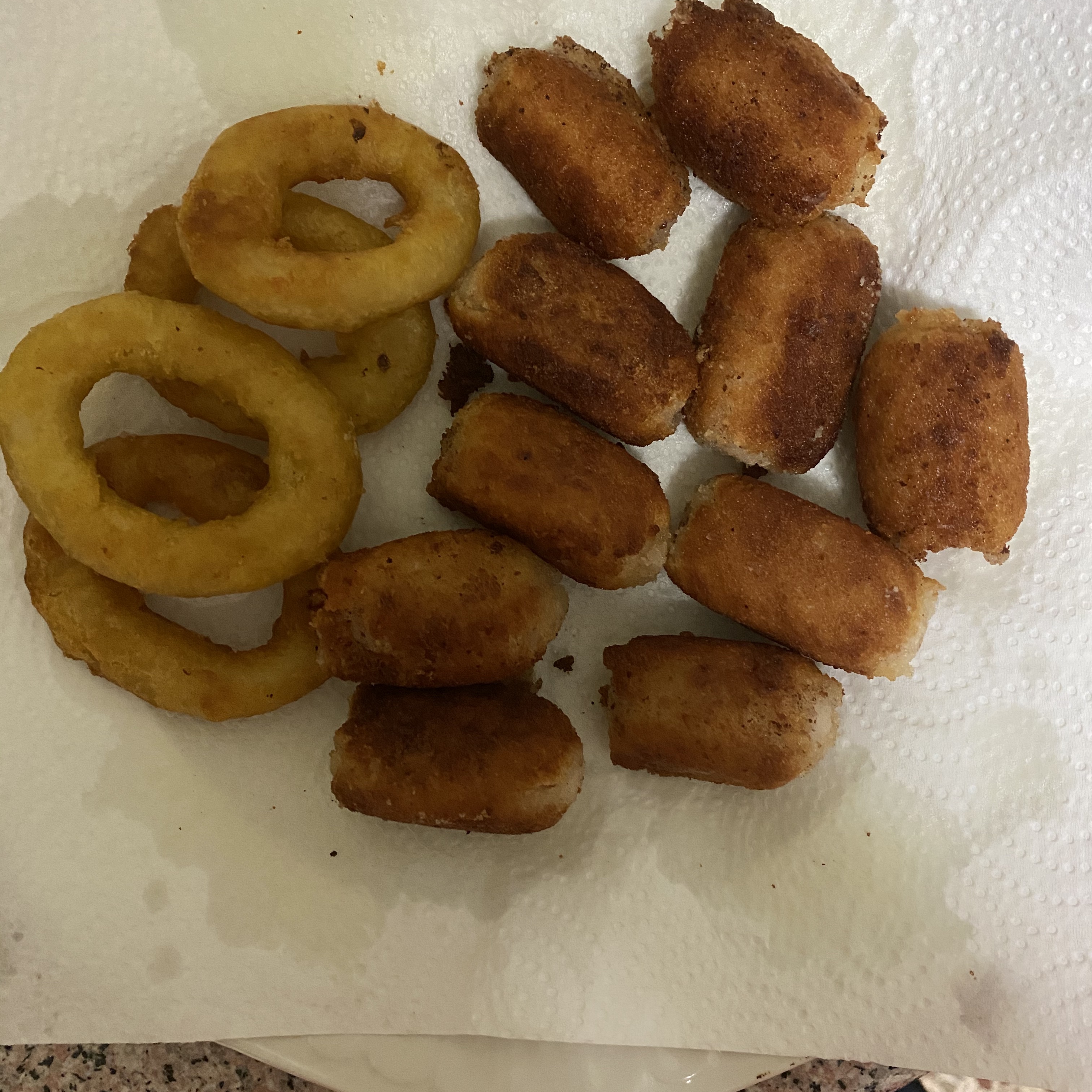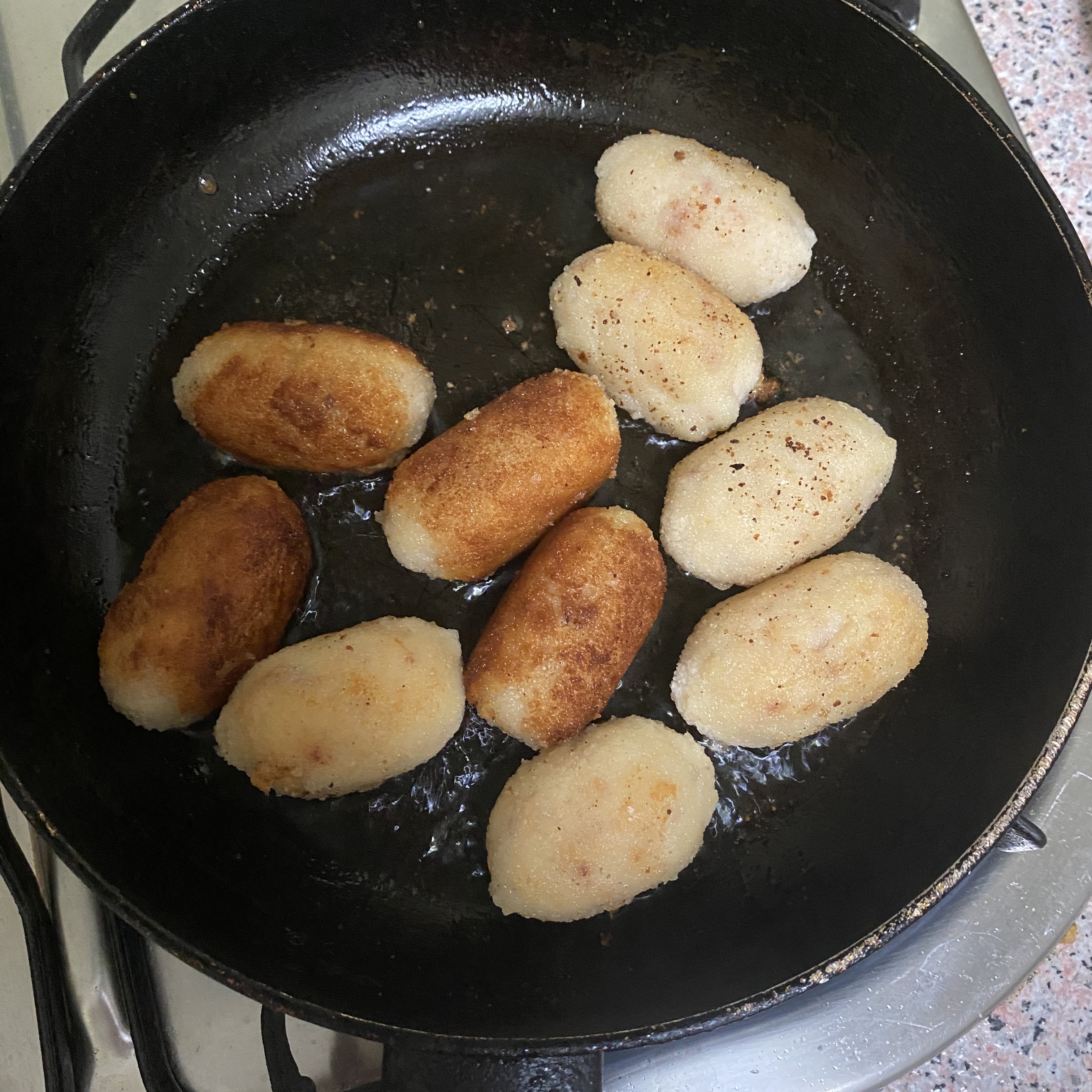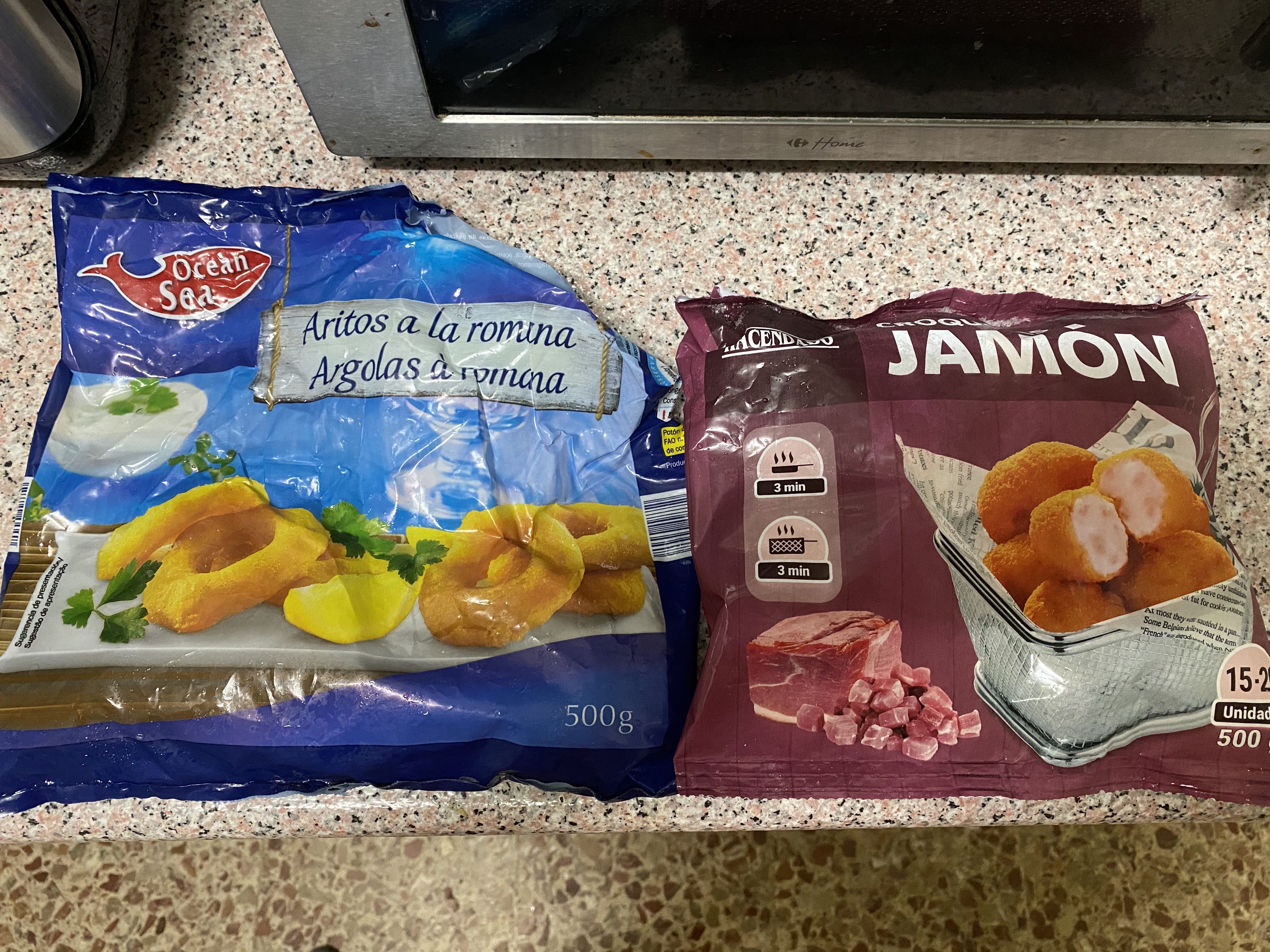 이렇게 두개를 준비했다. 사실 왼쪽에 있는 건 오징어 튀김인데, 한 4개 정도 밖에 남지 않아서 꺼냈고, 오른쪽에 다른 하나는 스페인 크로켓이다. 슈퍼에서 1유로에 샀다. 한 봉지에 15 - 20개 정도 들어있다고 한다. (500그람)