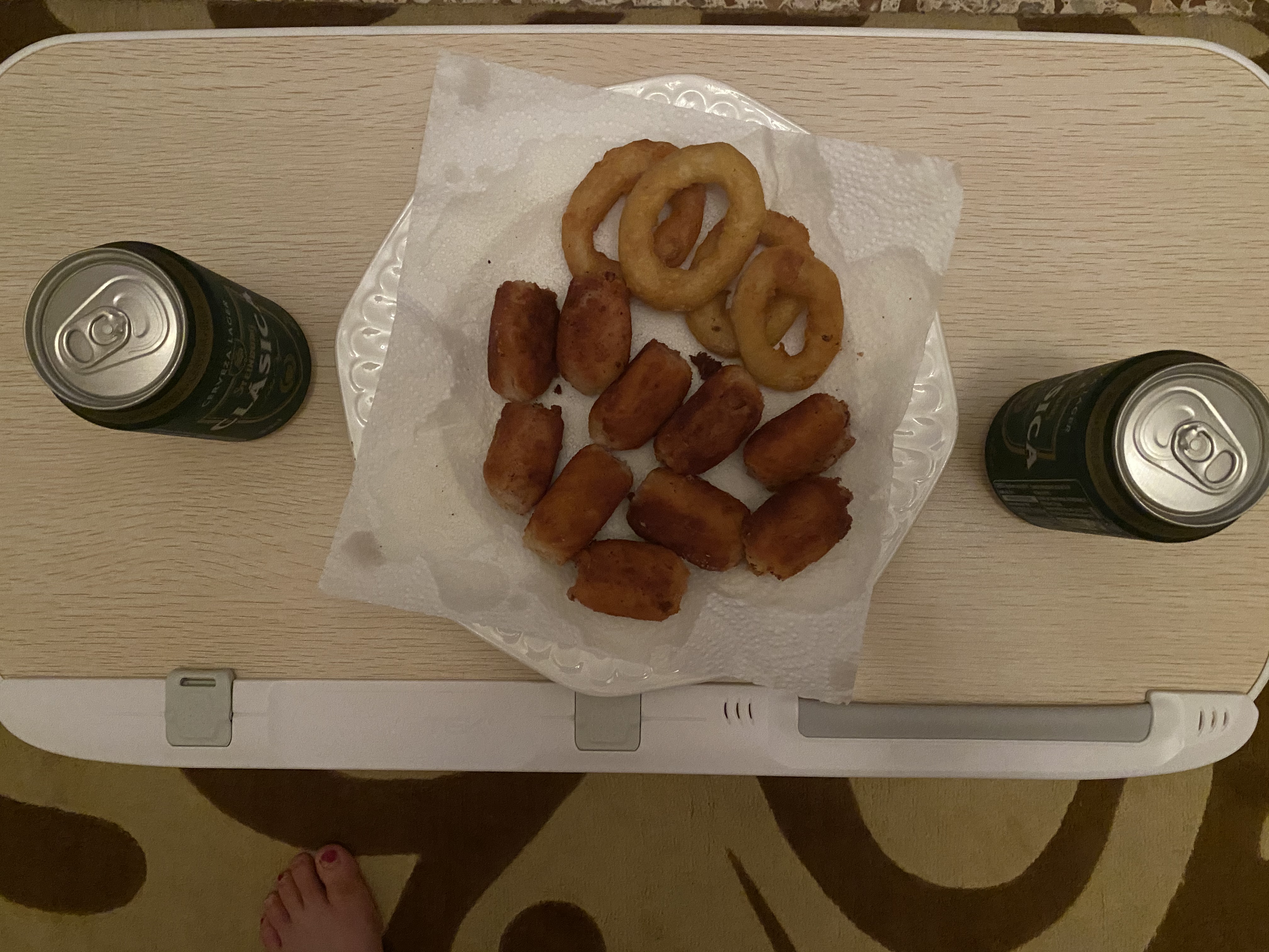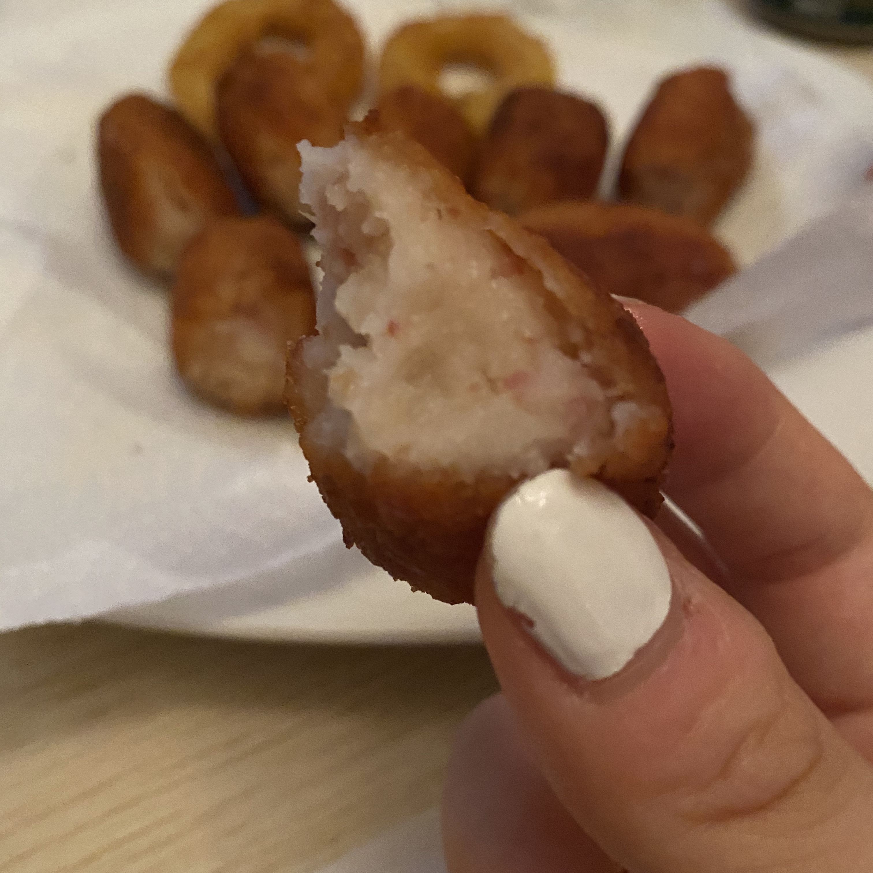 저번에도 설명을 했지만, 스페인 크로켓은 크로케타라고 부르고 베사멜 소스에 안에 하몽을 넣어서 튀김옷을 입혀서 튀긴 것인데, 정말 너무 맛있다. 안에는 이렇게 생겼다. 손이 진짜 많이 가서 시간이 엄청 많지 않은 이상 직접 만들지 않을 것 같다 (약간 우리나라 만두를 만드는 수준이라고나 할까) 그리고 튀김은 역시 맥주랑 함께 🍺
