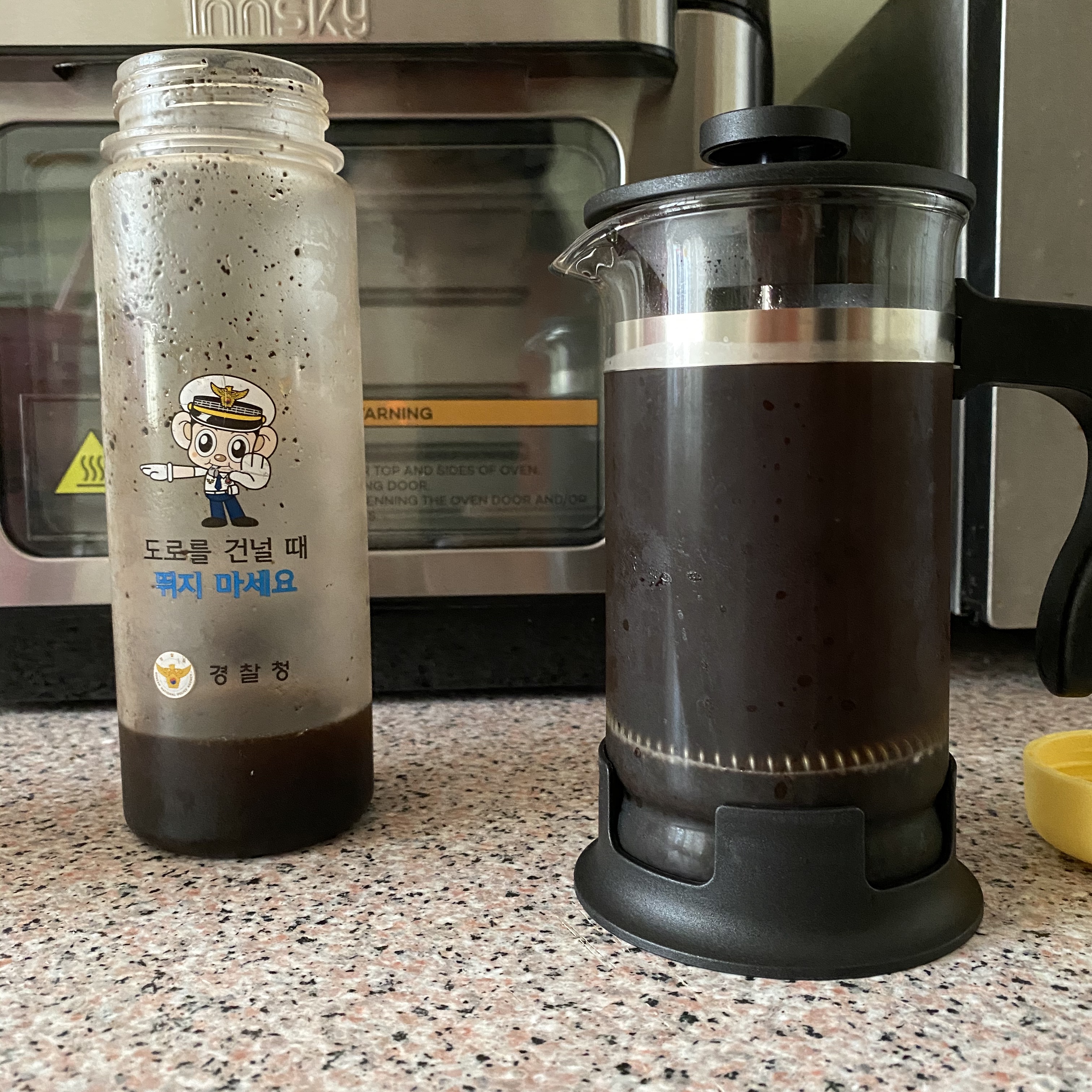 오늘은 콜드브류를 마셨다. 어제 준비해 놓고 바로 프렌치 프레소에 넣고 쭈우욱! 일부러 물이랑 섞어 마시려고 평소보다 한 숟가락 더 넣어서 진하게 탔다. 처음에는 물을 넣지 않아도 오! 맛있는데, 그러다가 점점 진해지는 것이 느껴서 결국 물을 넣었다. ㅎㅎㅎ