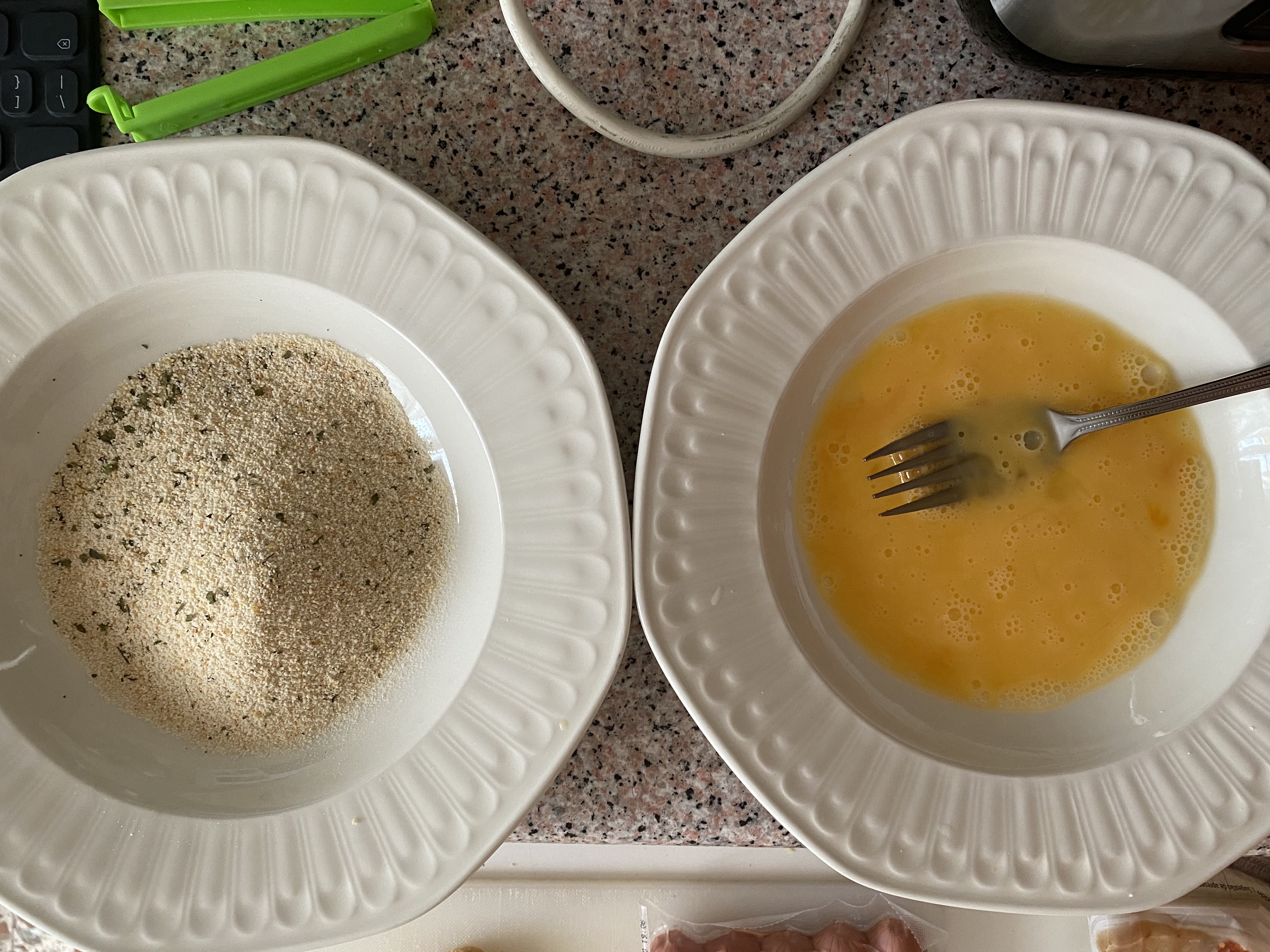 그리고 아까 준비했던 계란물에 입히고, 그 다음에 빵가루를 묻혀준다.