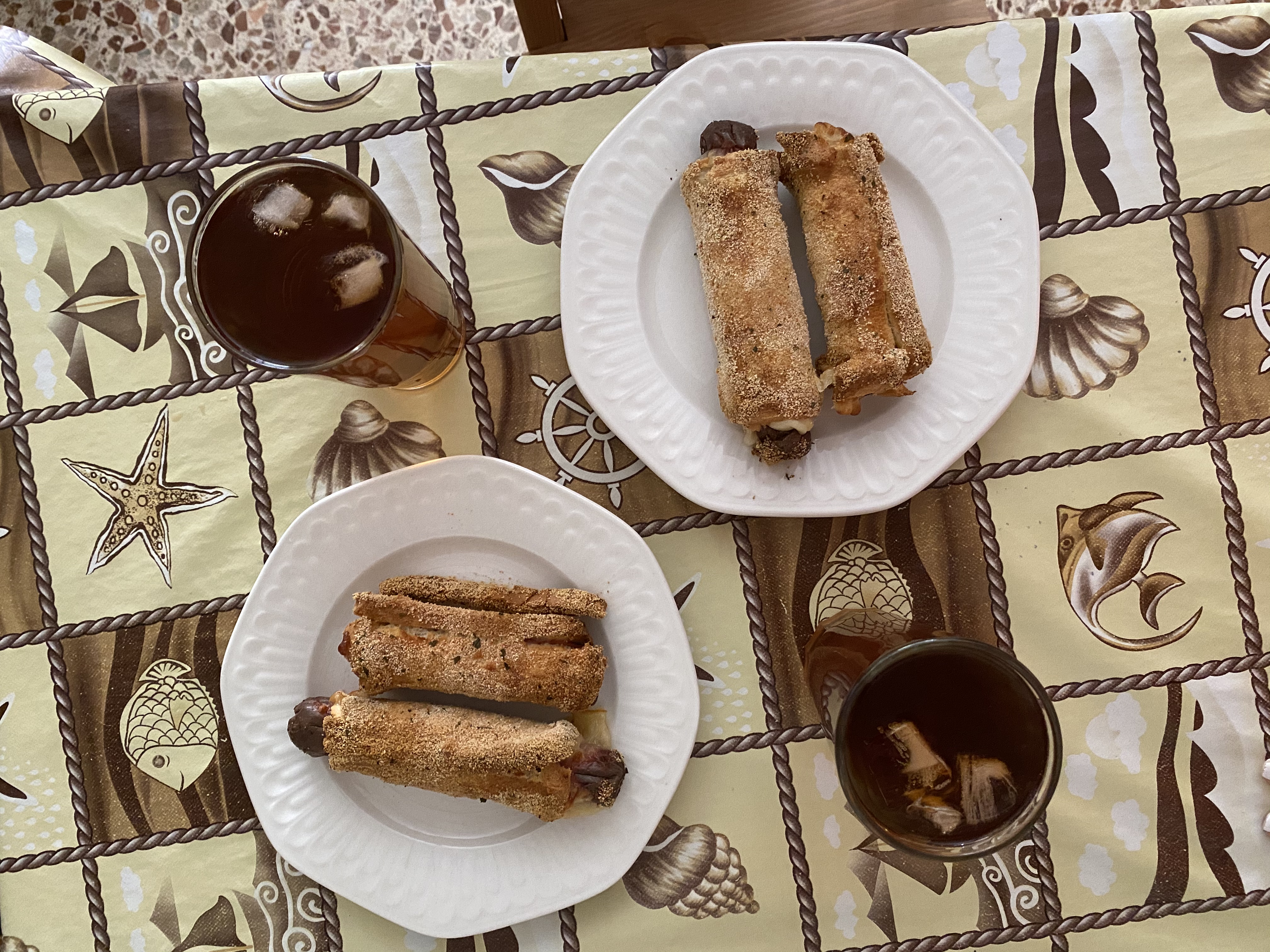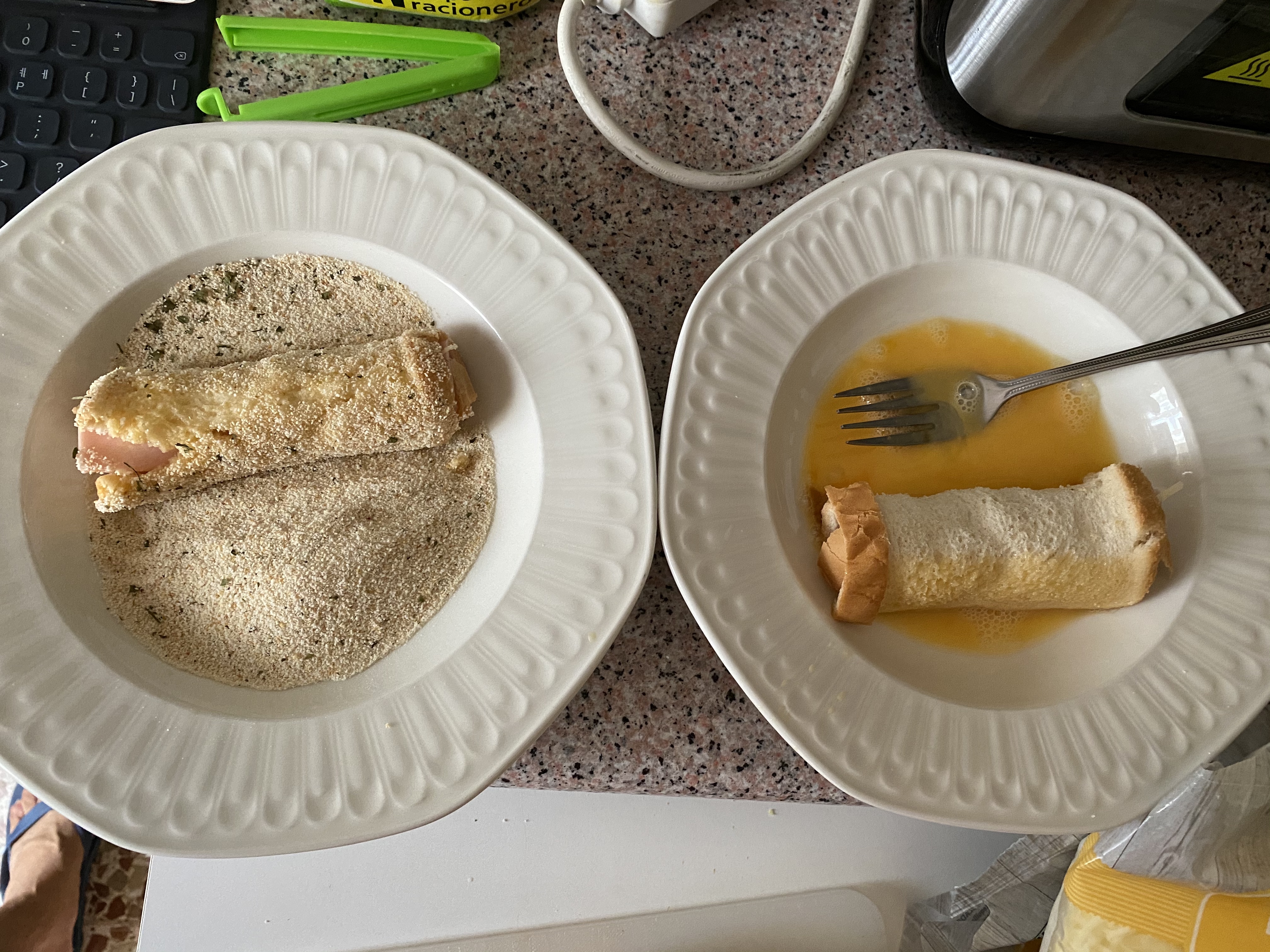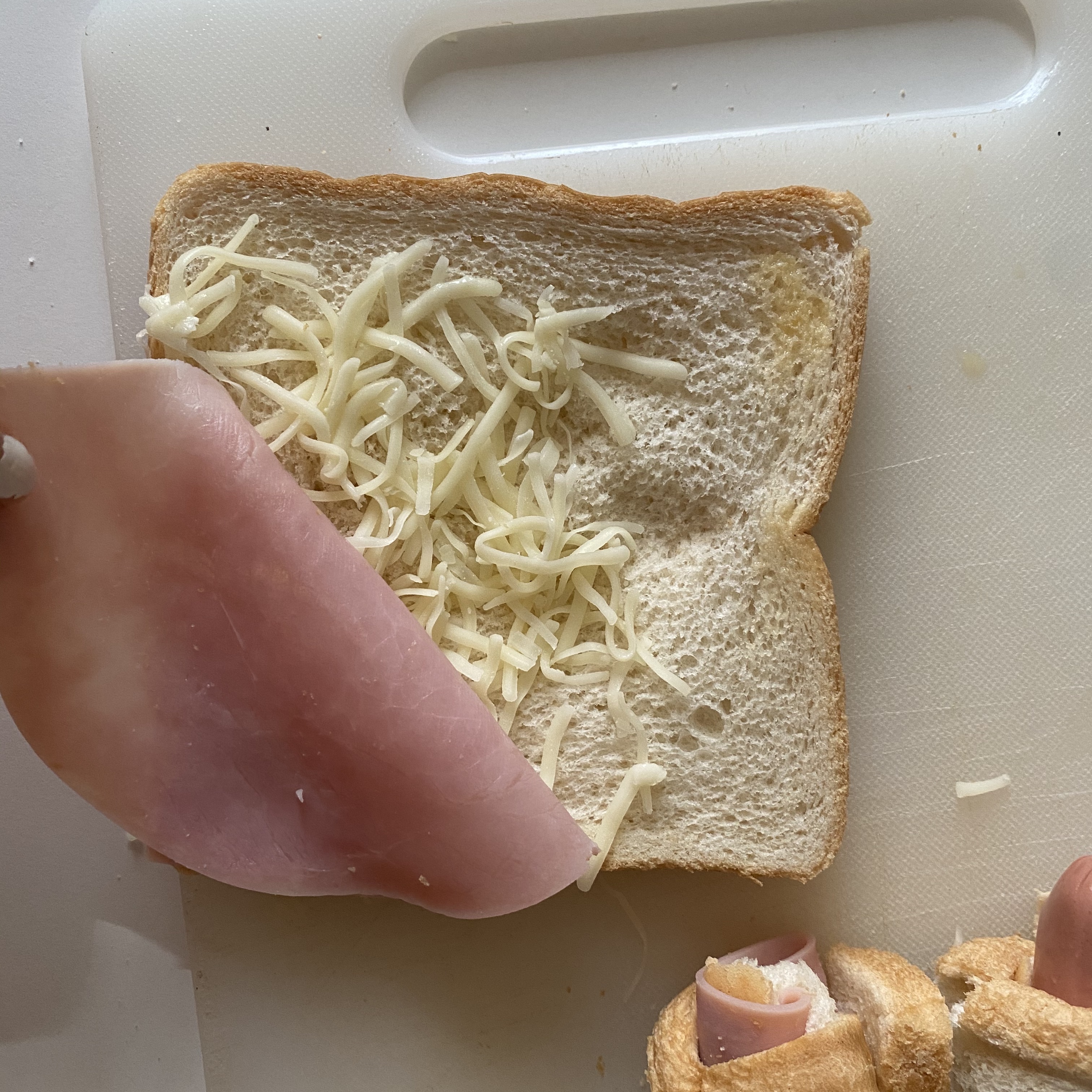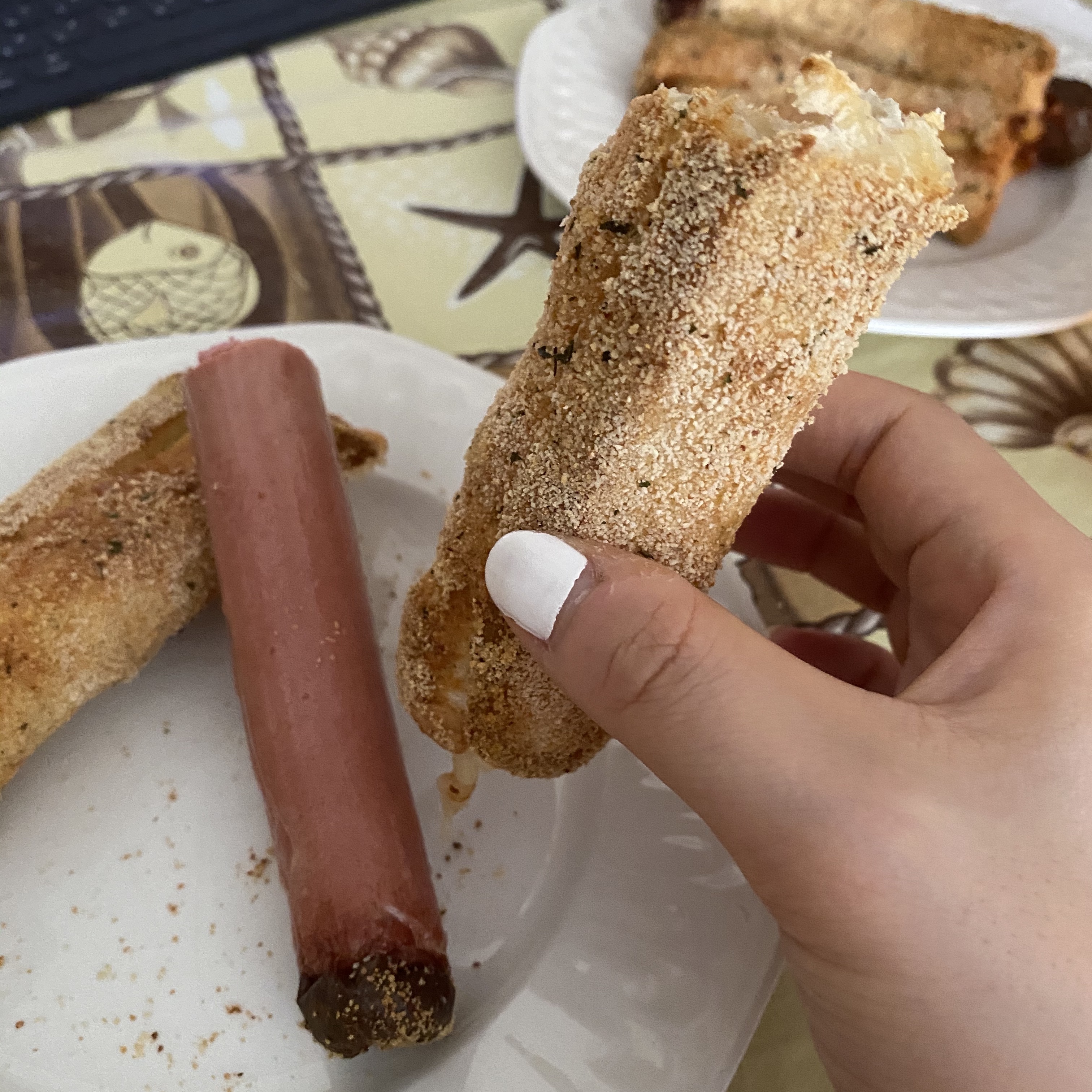 빵가루와 계란을 풀어서 준비를 해 준 후에, 식빵을 대충 놀러서 치즈를 먼저 얹어 준다. 슬라이스 치즈가 있었으면 더 쉬웠겠지만, 우리는 저렇게 얇게 잘린 치즈만 있어서 얘만 넣었다. 그리고 그 위에 치즈나 소시지를 얹어준다. (소시지 올린 사진이 있는 줄 알았는데 없네 ㅜㅜㅜ) 그리고 식빵을 돌돌돌 말아준다. 나는 햄과 소시지 2개씩 넣어서 만들었다.